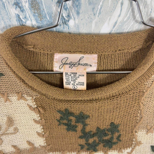 Vintage Patchwork Tan Floral Knit Oversized Sweater (L)