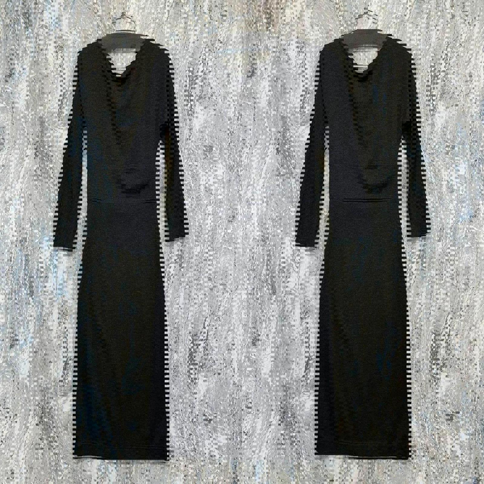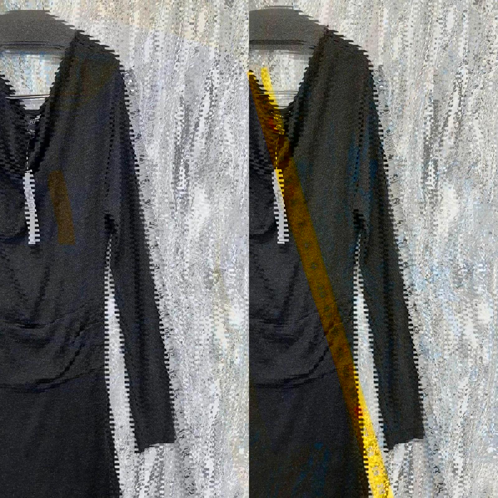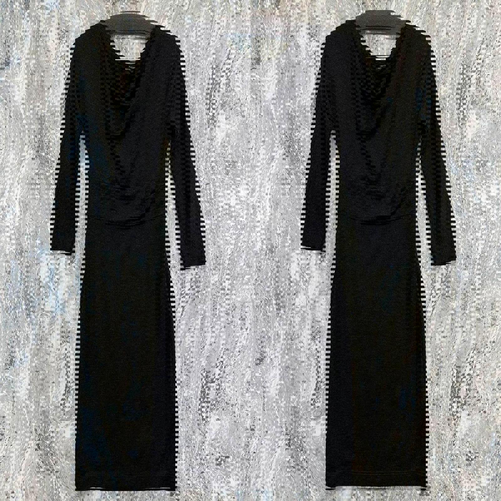 This dress features a flattering cowl neckline and three-quarter sleeves, designed in a sleek black fabric. Brand new with tags