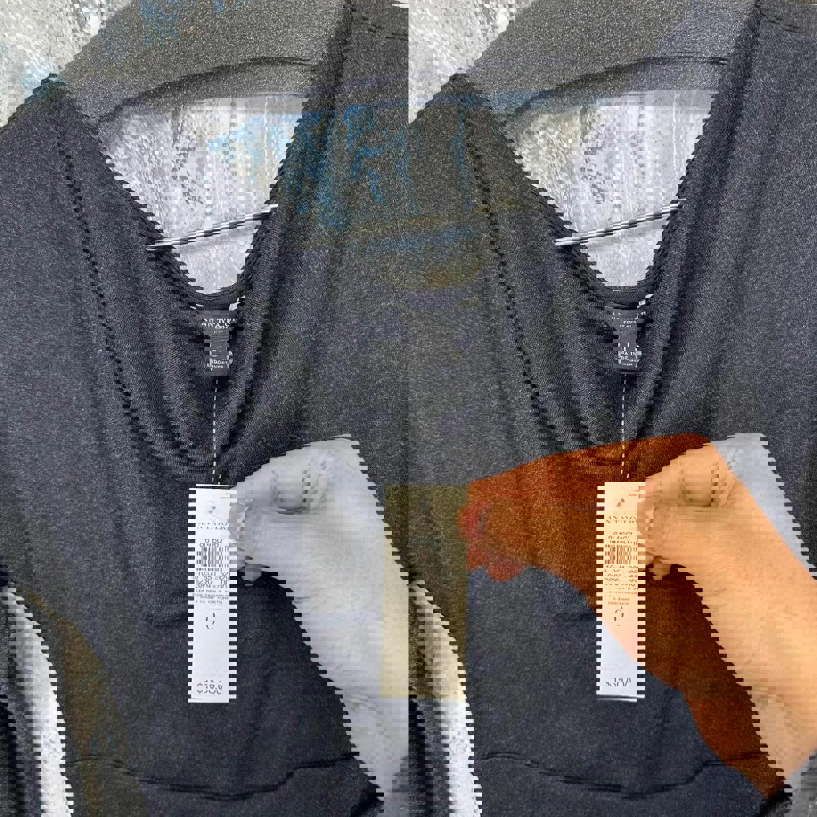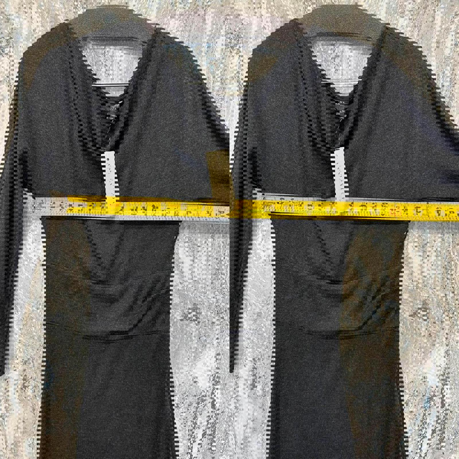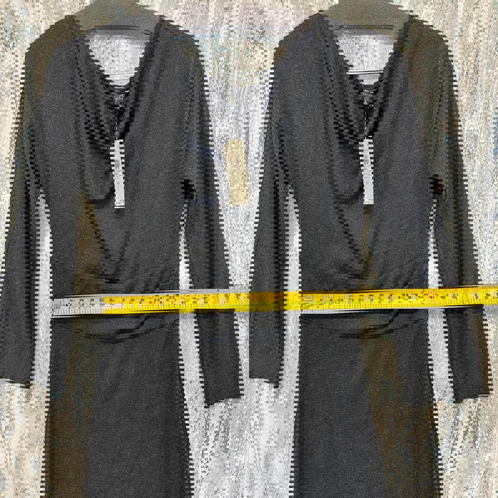 This dress features a flattering cowl neckline and three-quarter sleeves, designed in a sleek black fabric. Brand new with tags