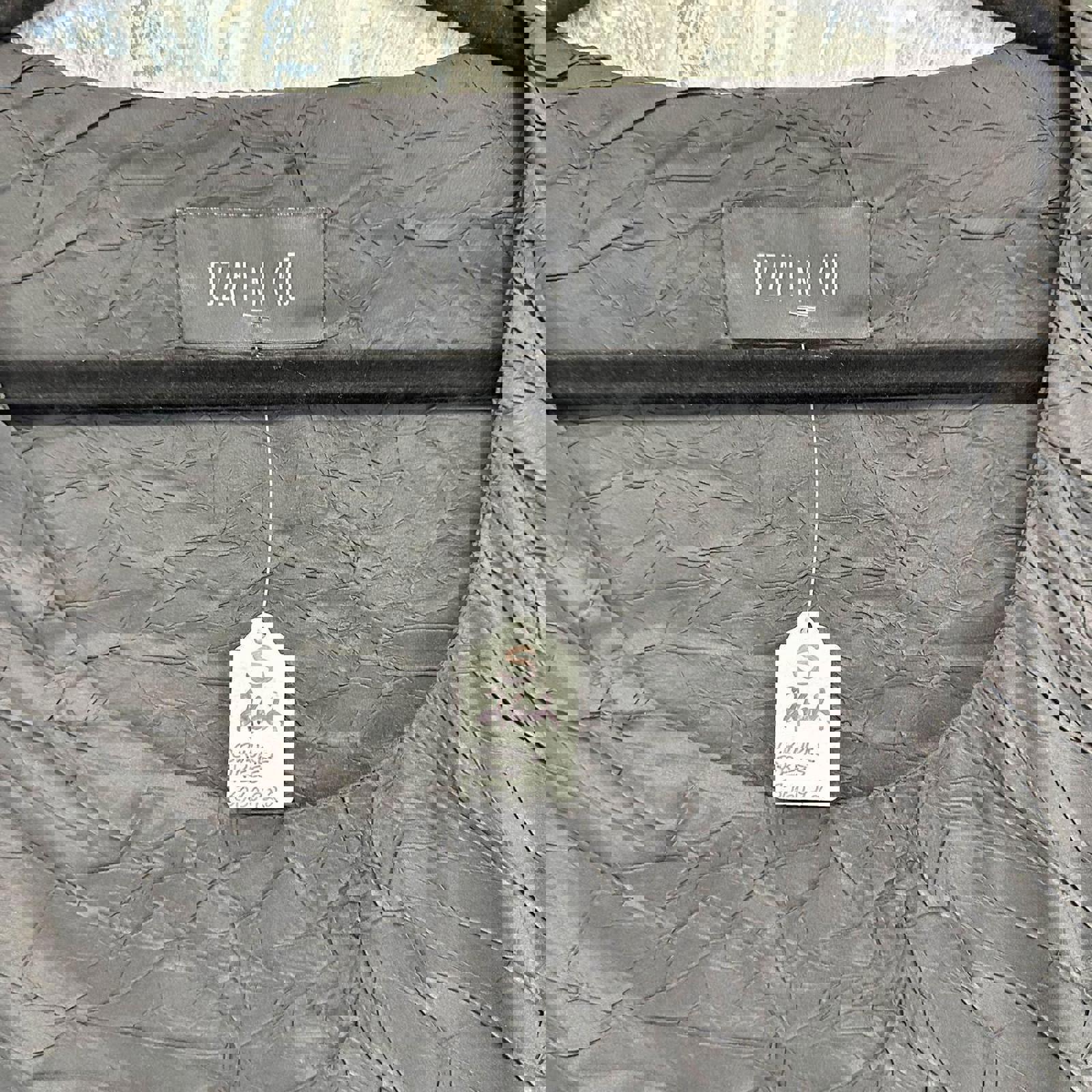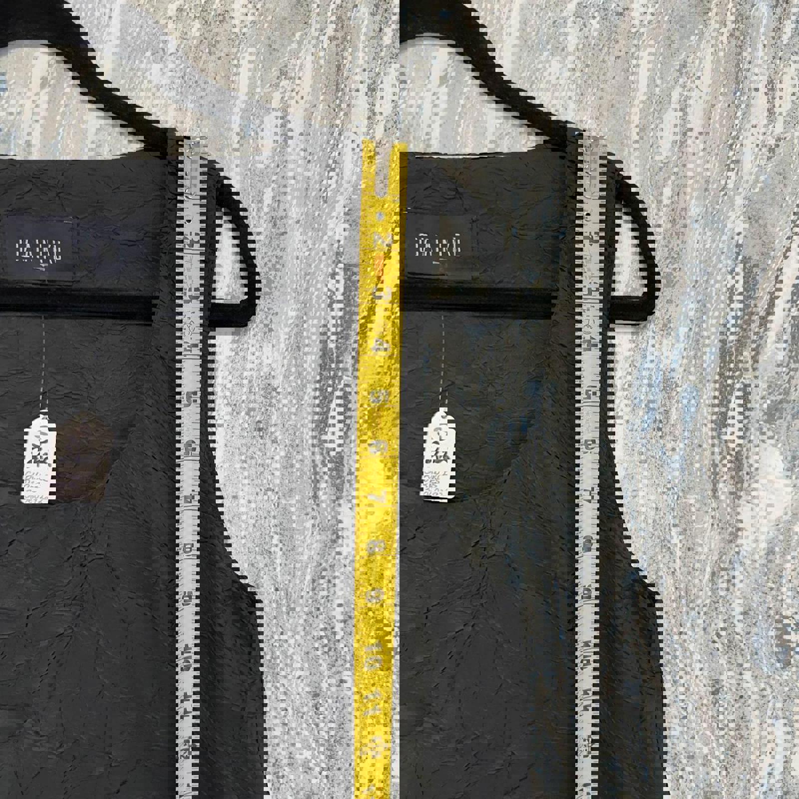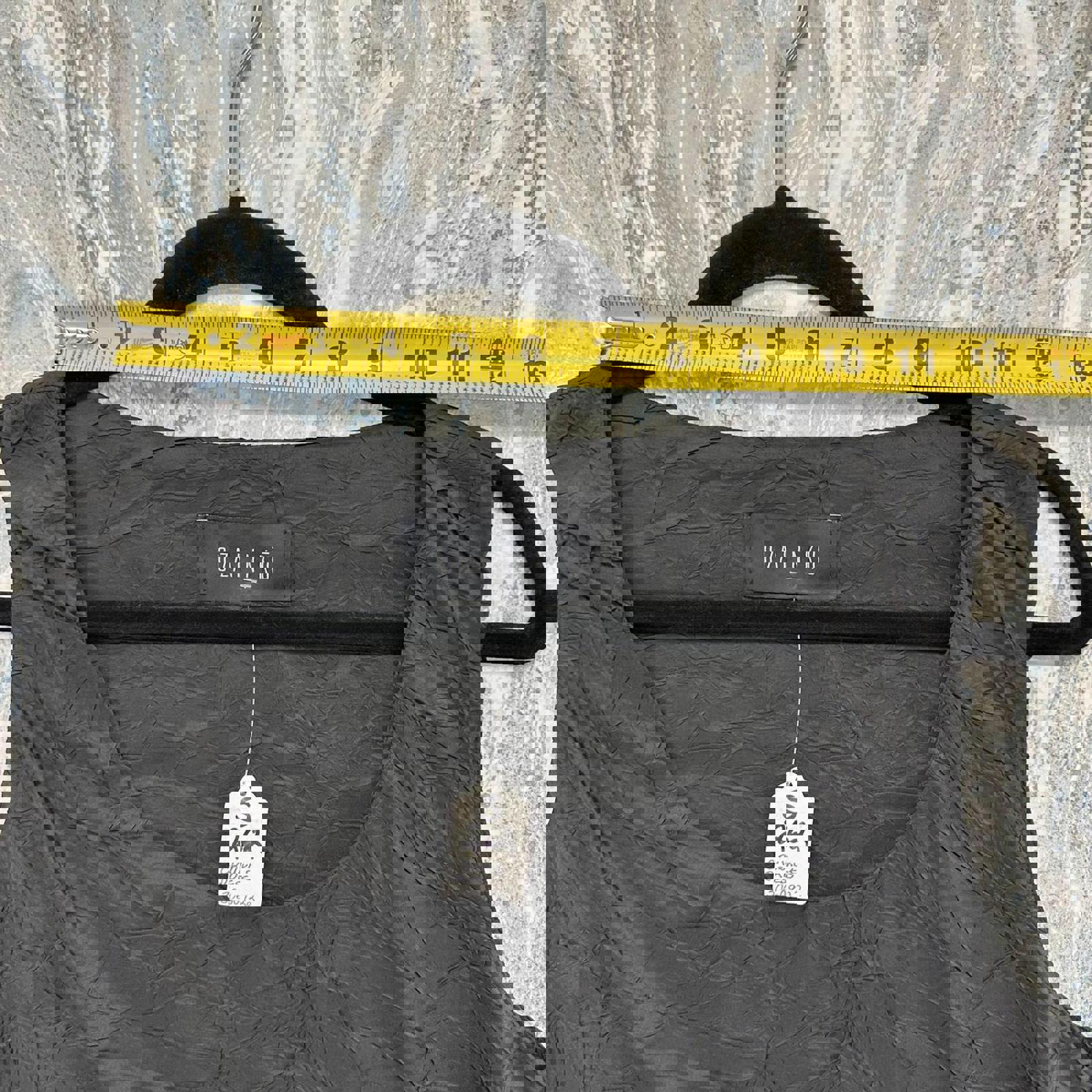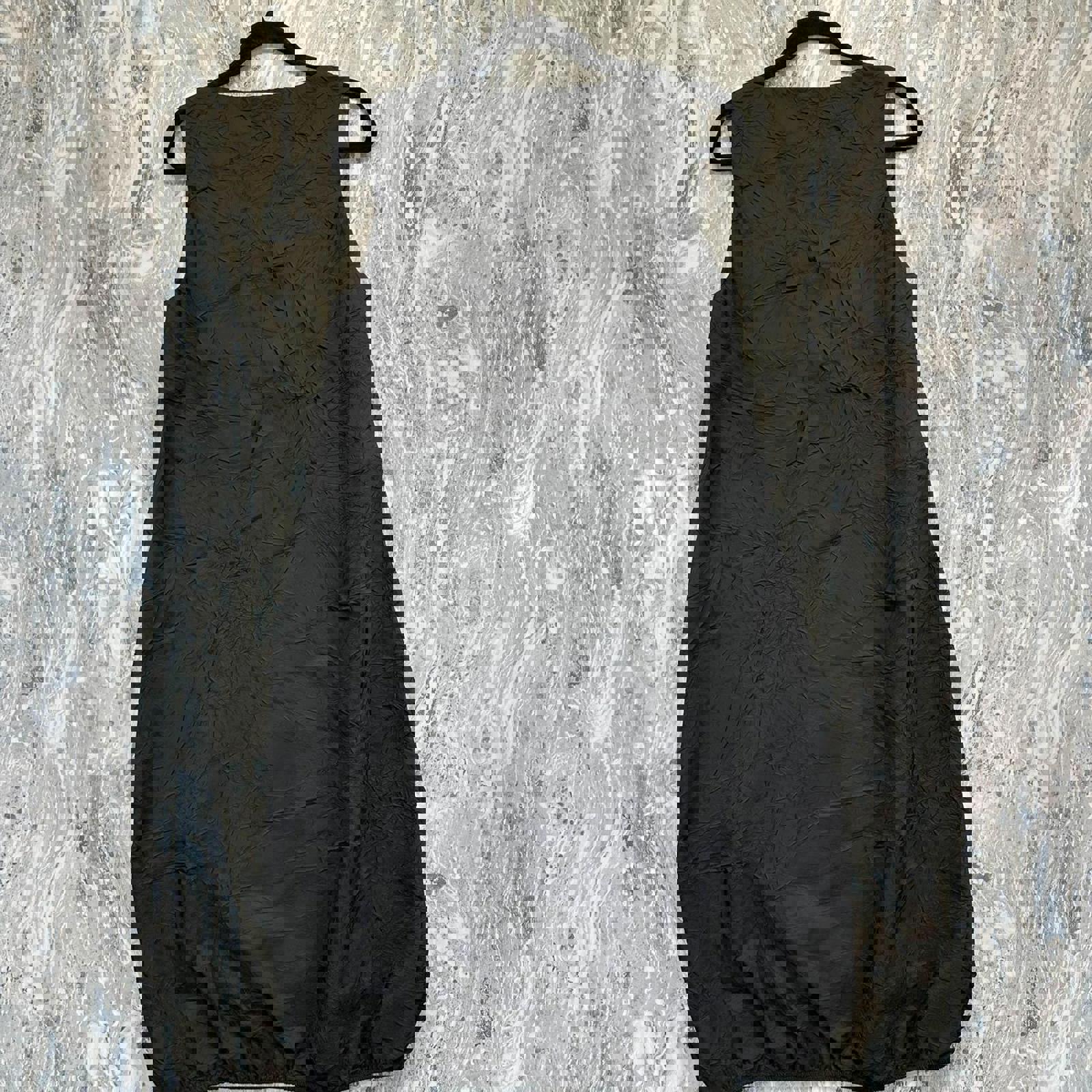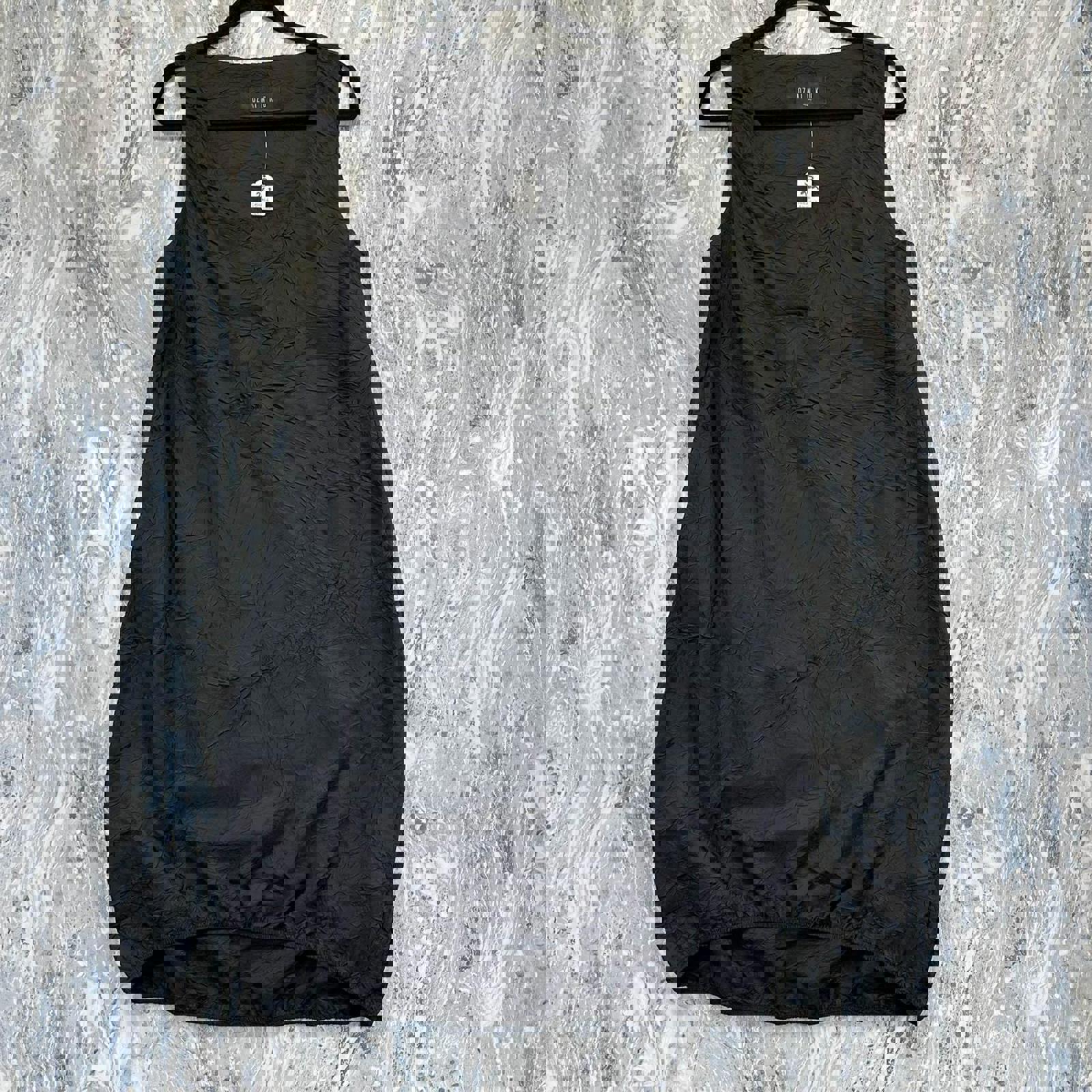 This black dress features a unique crinkle texture and a relaxed, sleeveless silhouette with a subtly rounded hem.