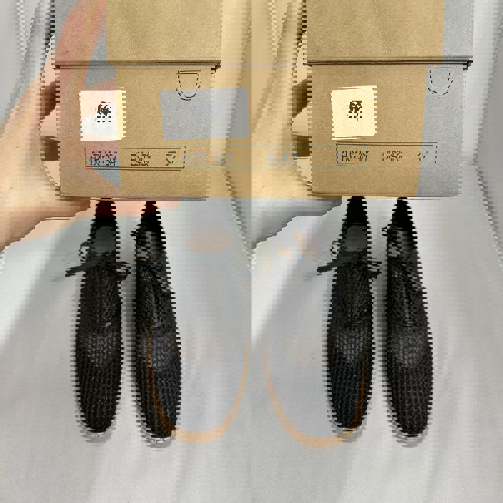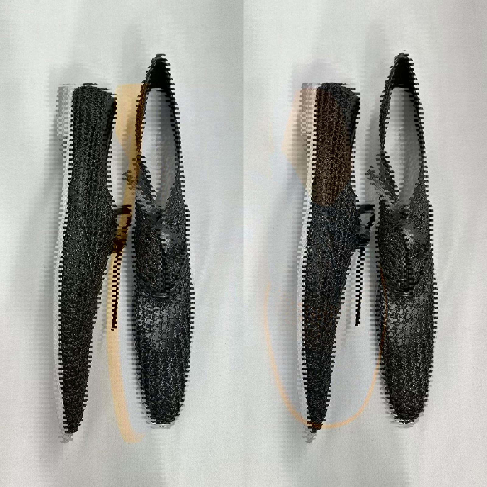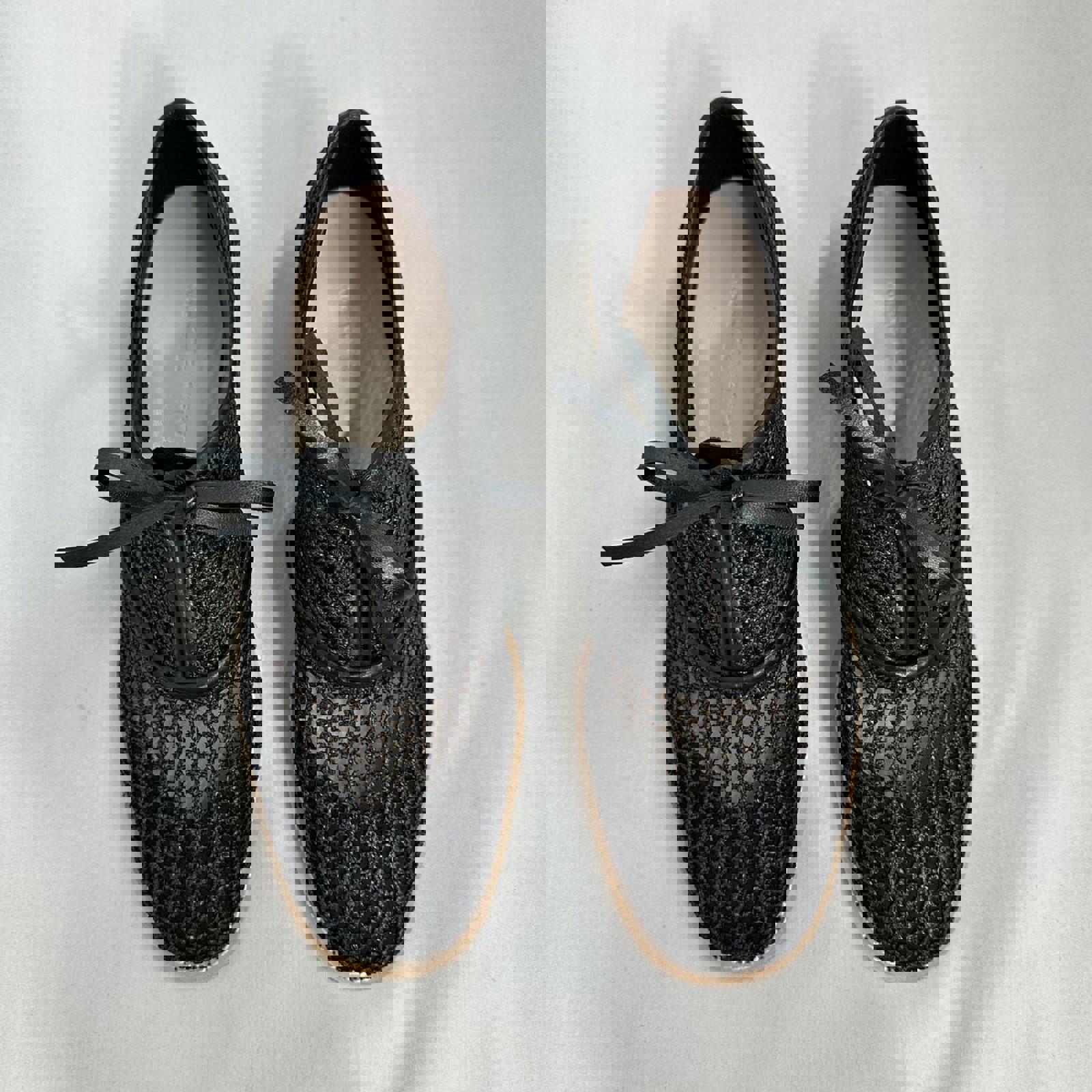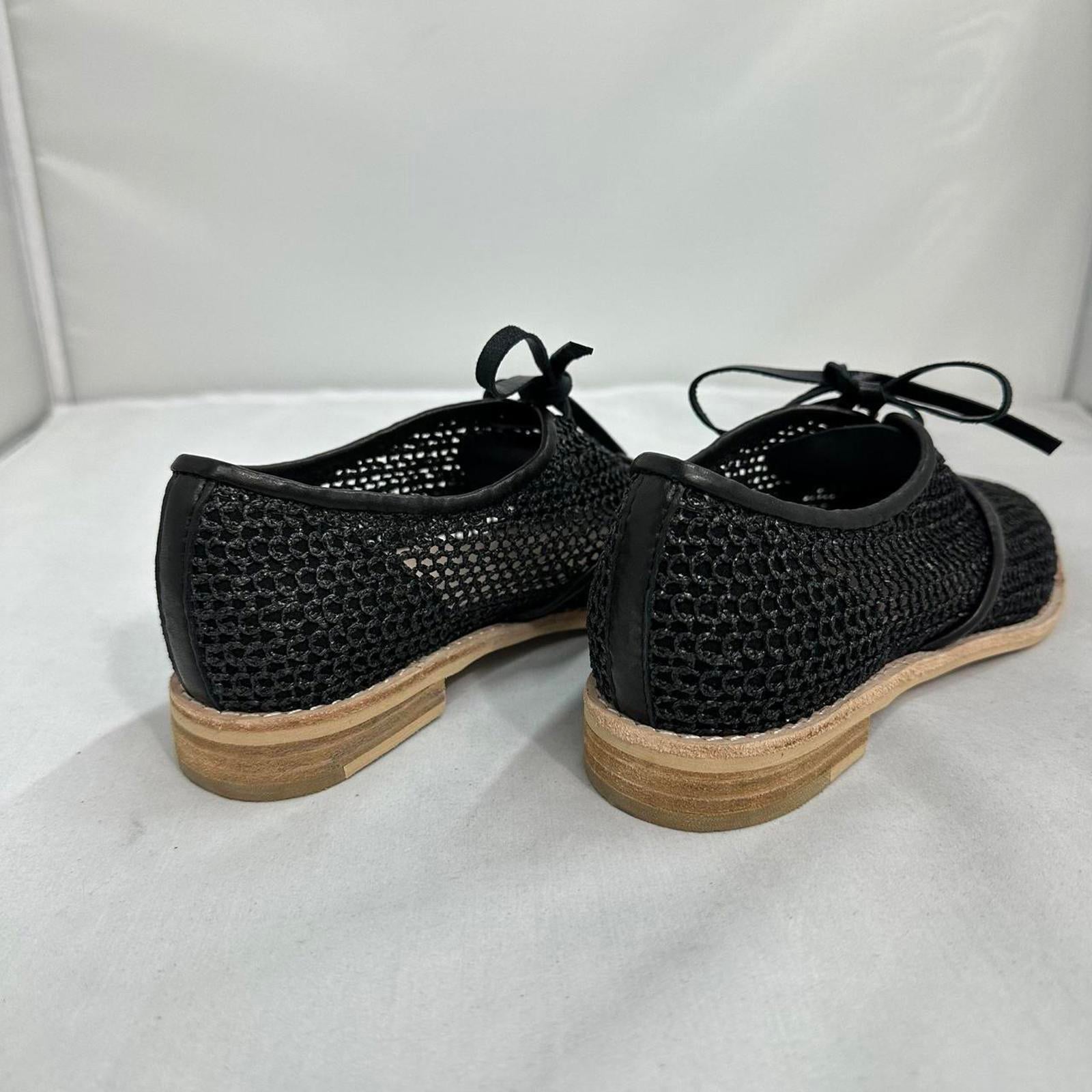 Chic black mesh loafers with lace-up detailing and contrasting wooden soles.