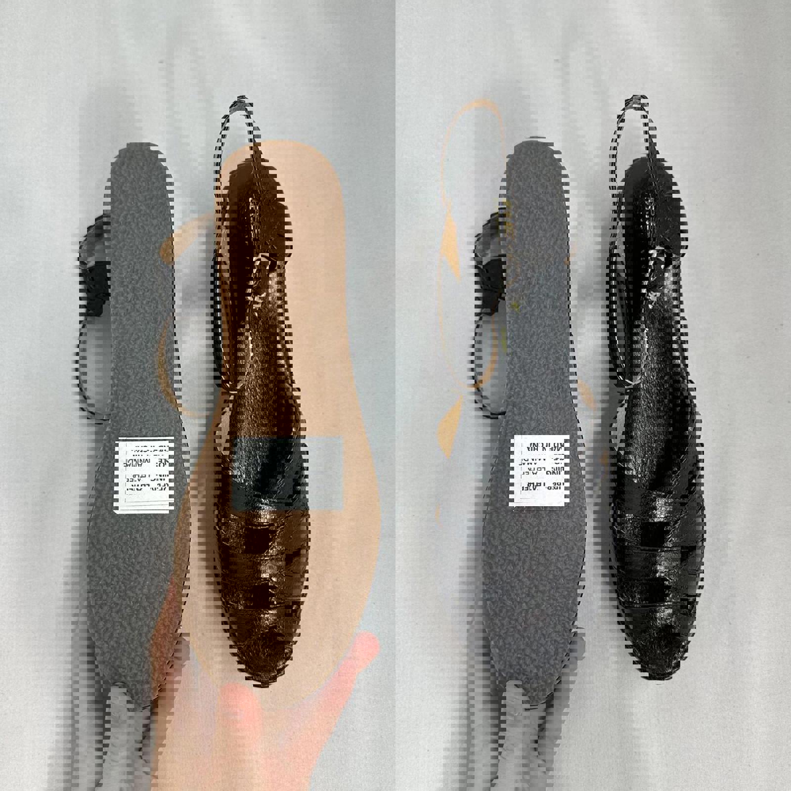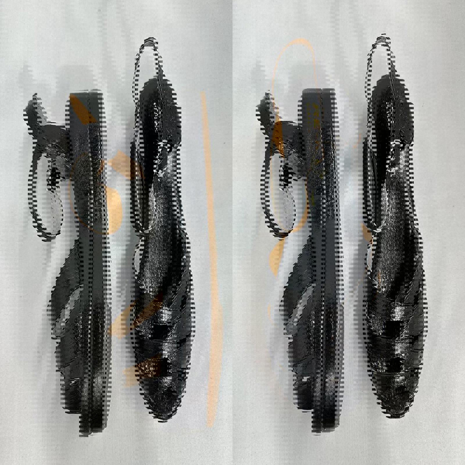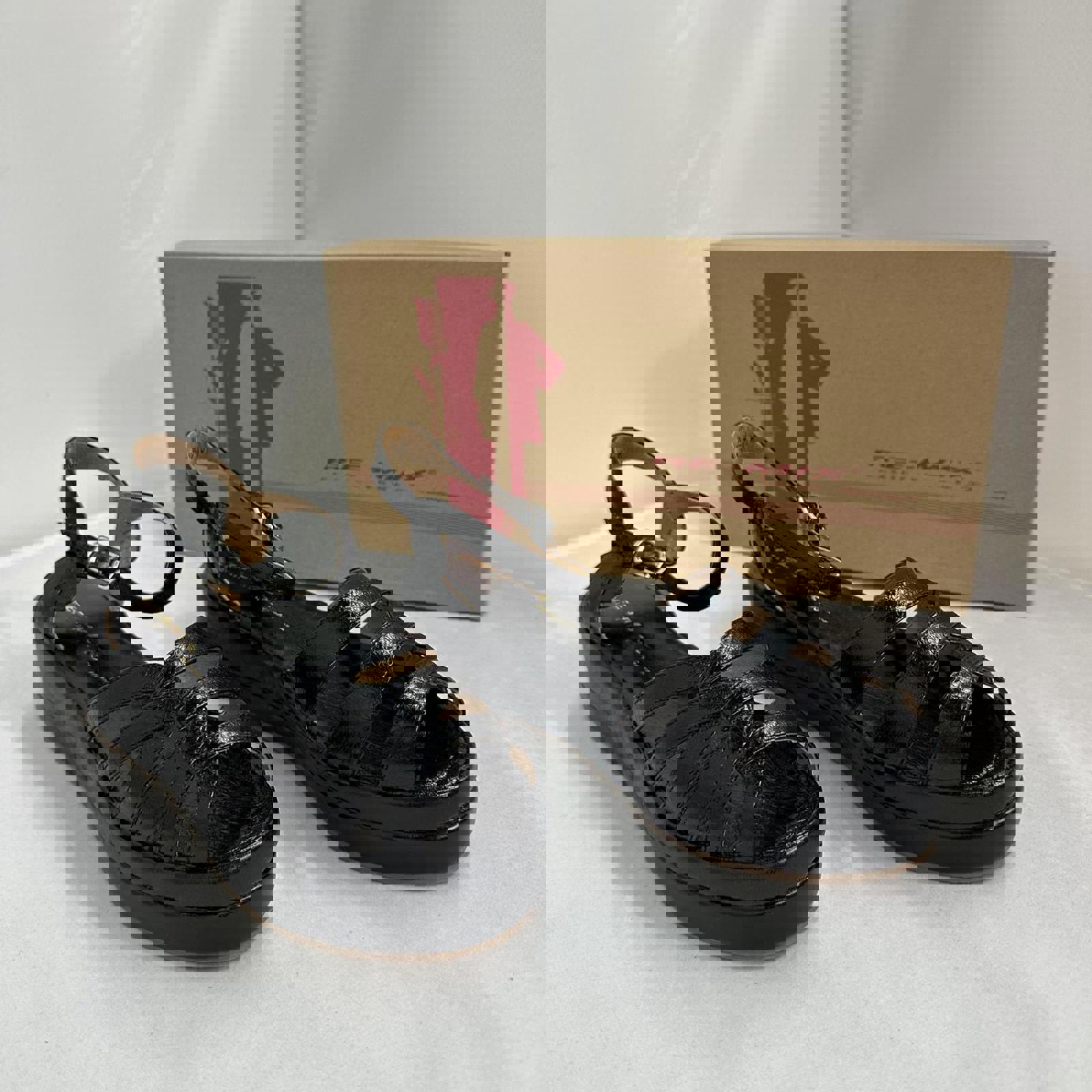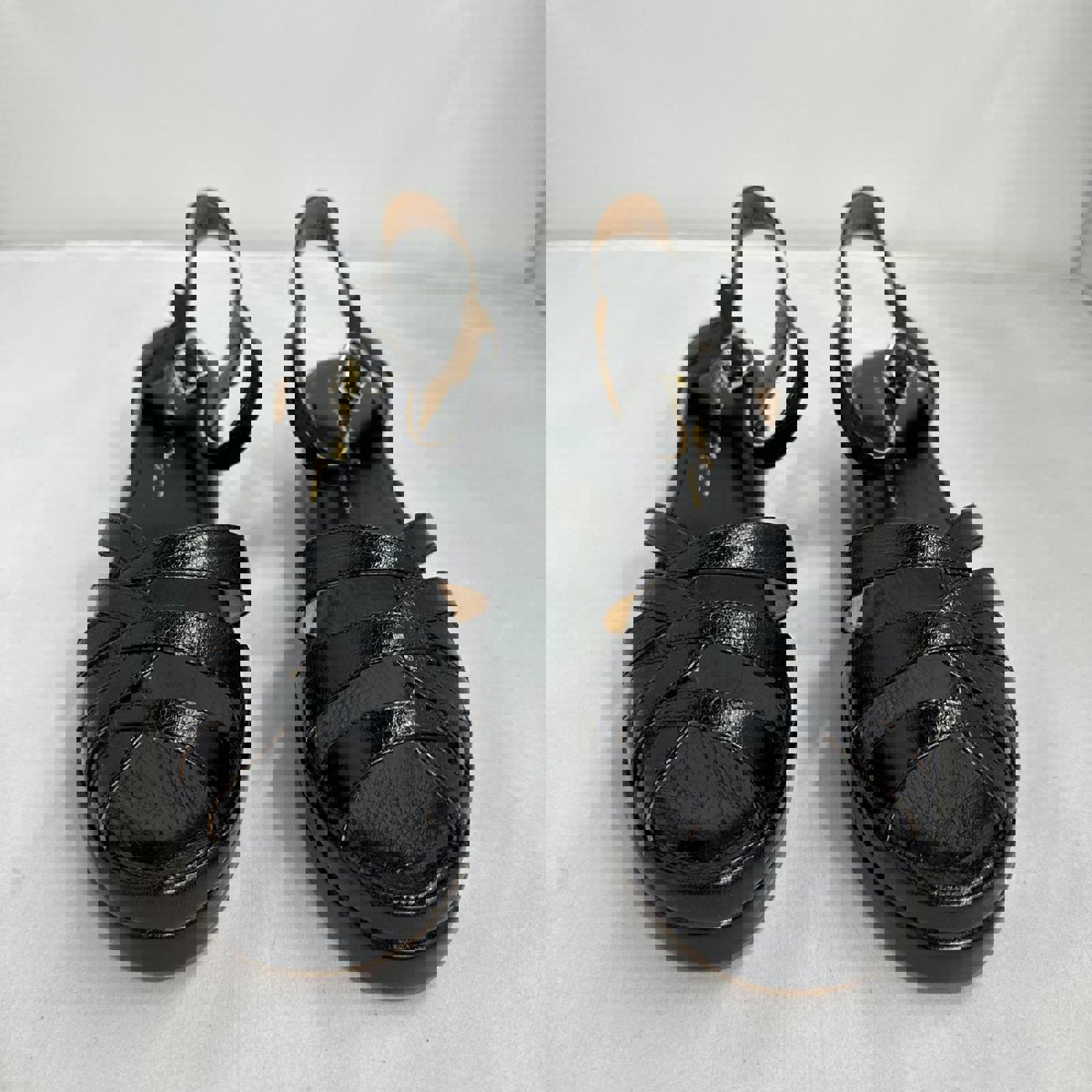 Sleek black patent leather sandals featuring a woven strappy design and adjustable ankle strap on a platform sole.