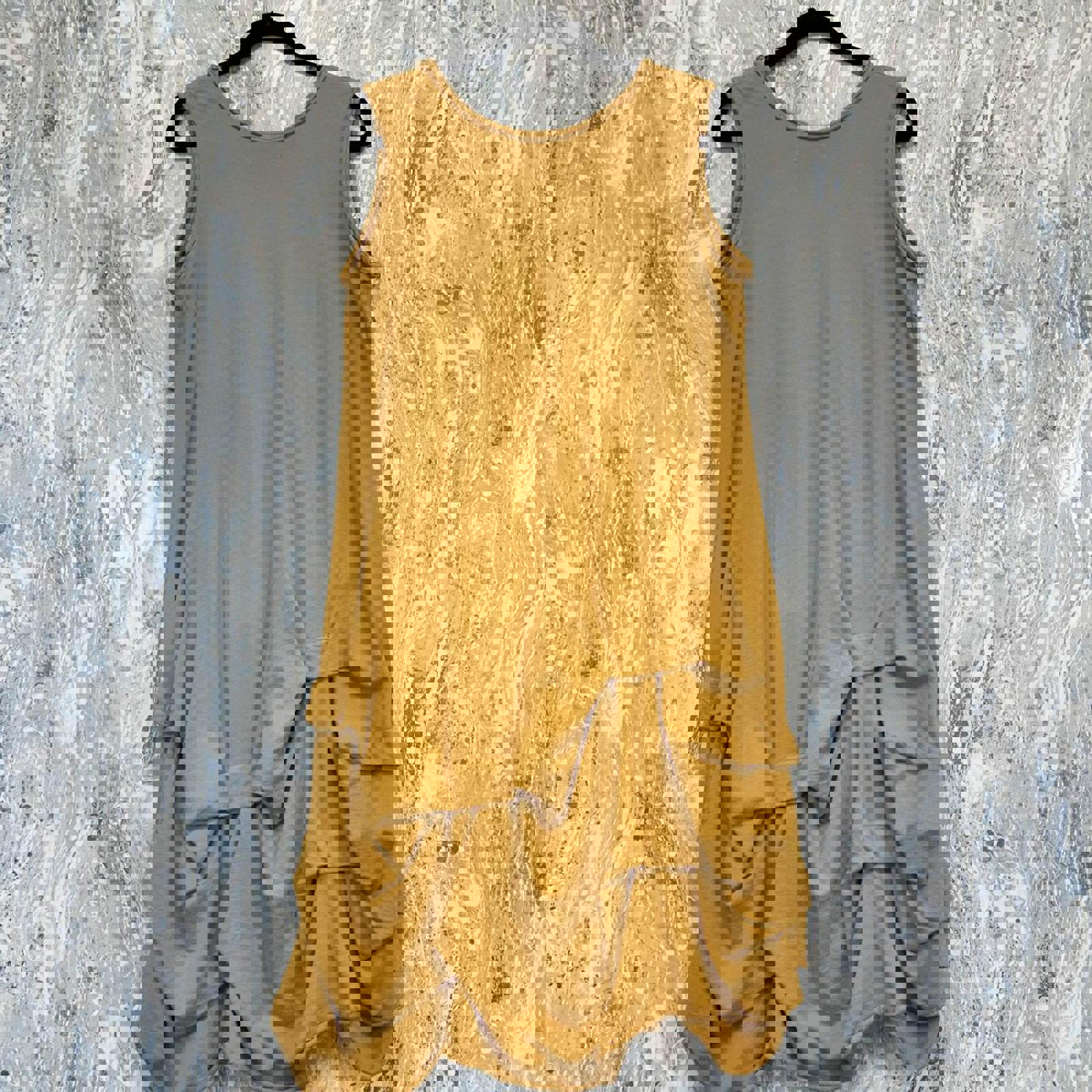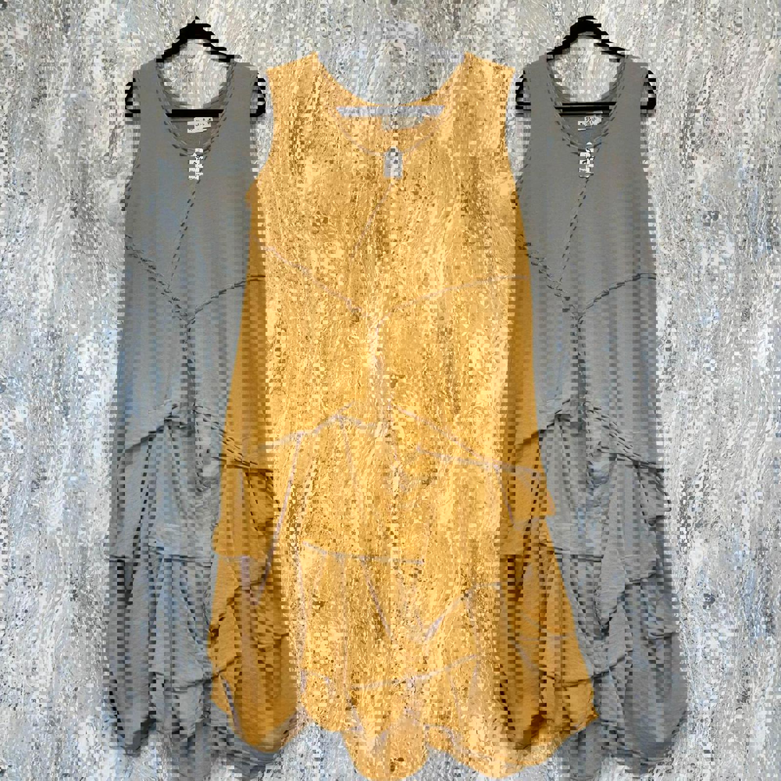 Mustard yellow sleeveless tank dress with unique layered ruffle design and asymmetrical hem.