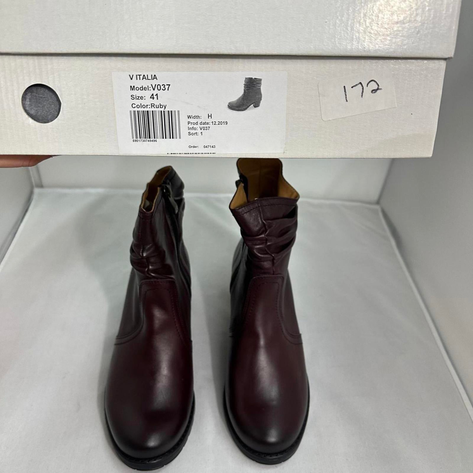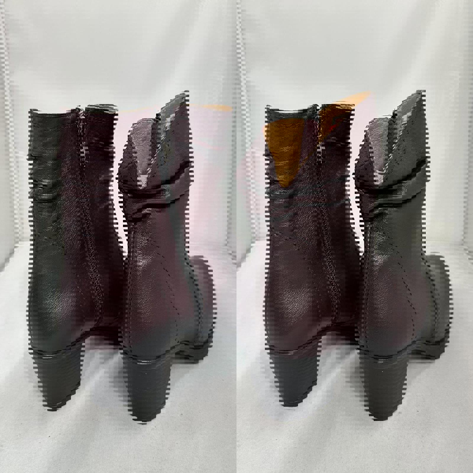 Elegant burgundy leather ankle boots featuring a ruched design and side zippers, with a stylish mid-heel.