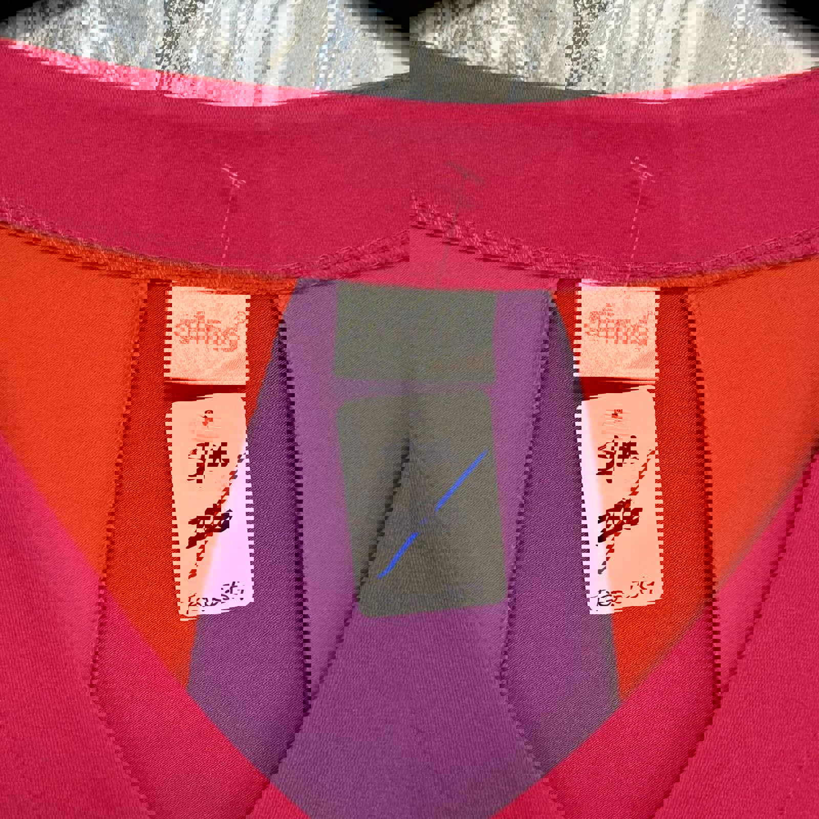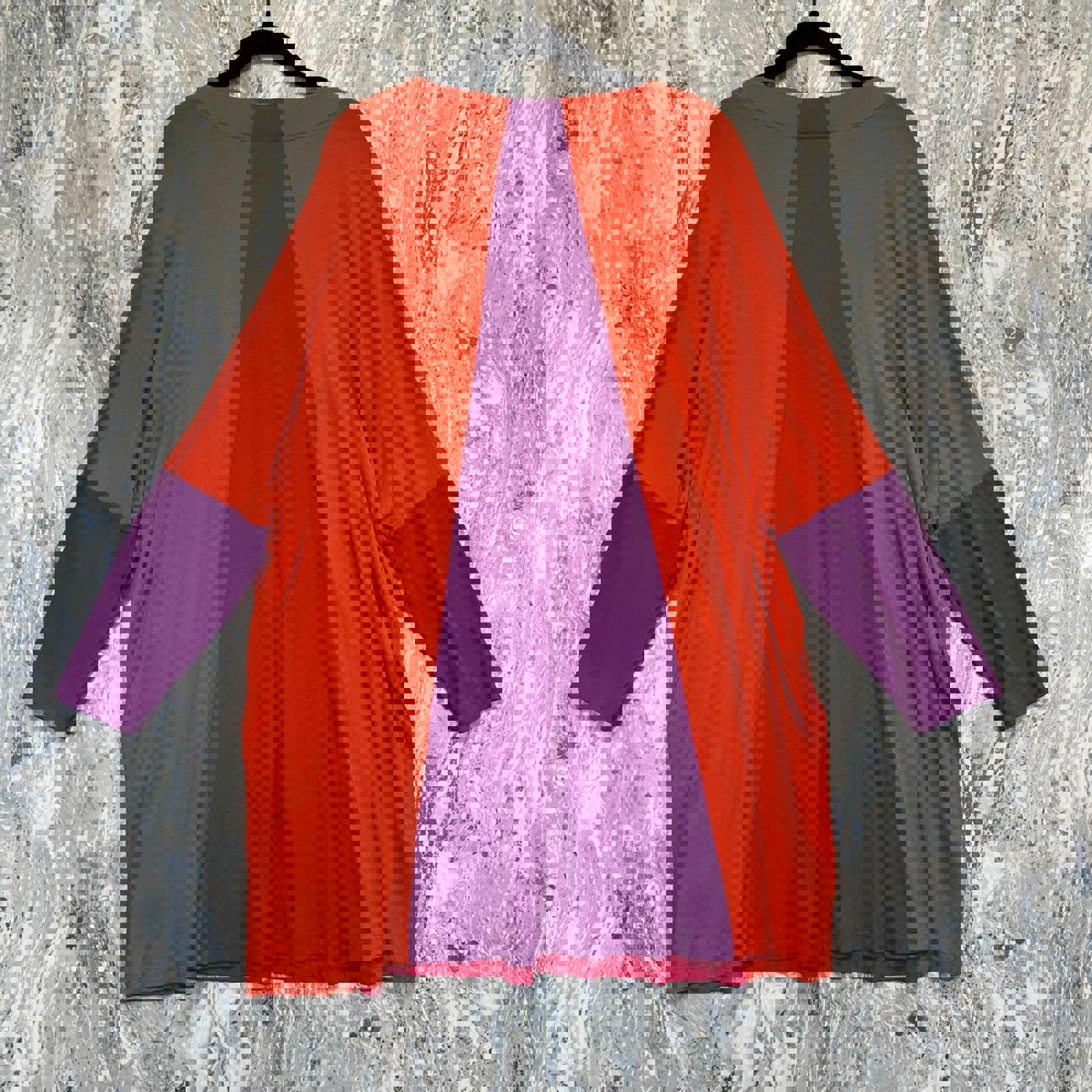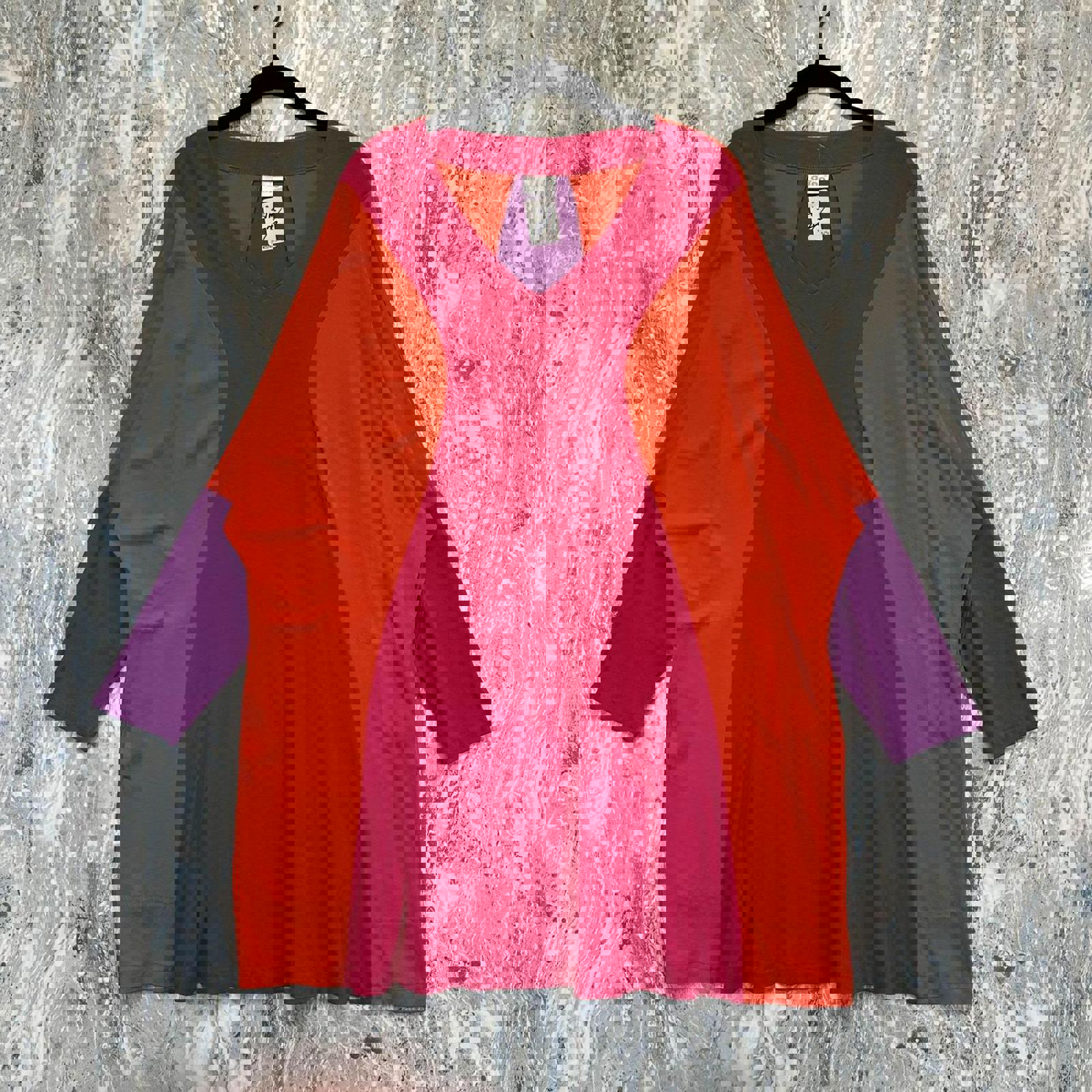 Vibrant V-neck blouse featuring a striking colorblock design with long sleeves and relaxed fit.