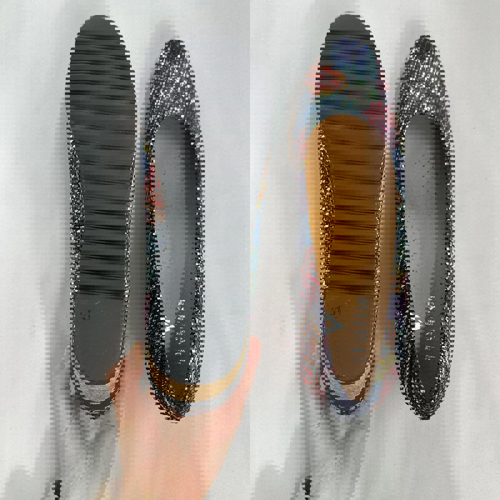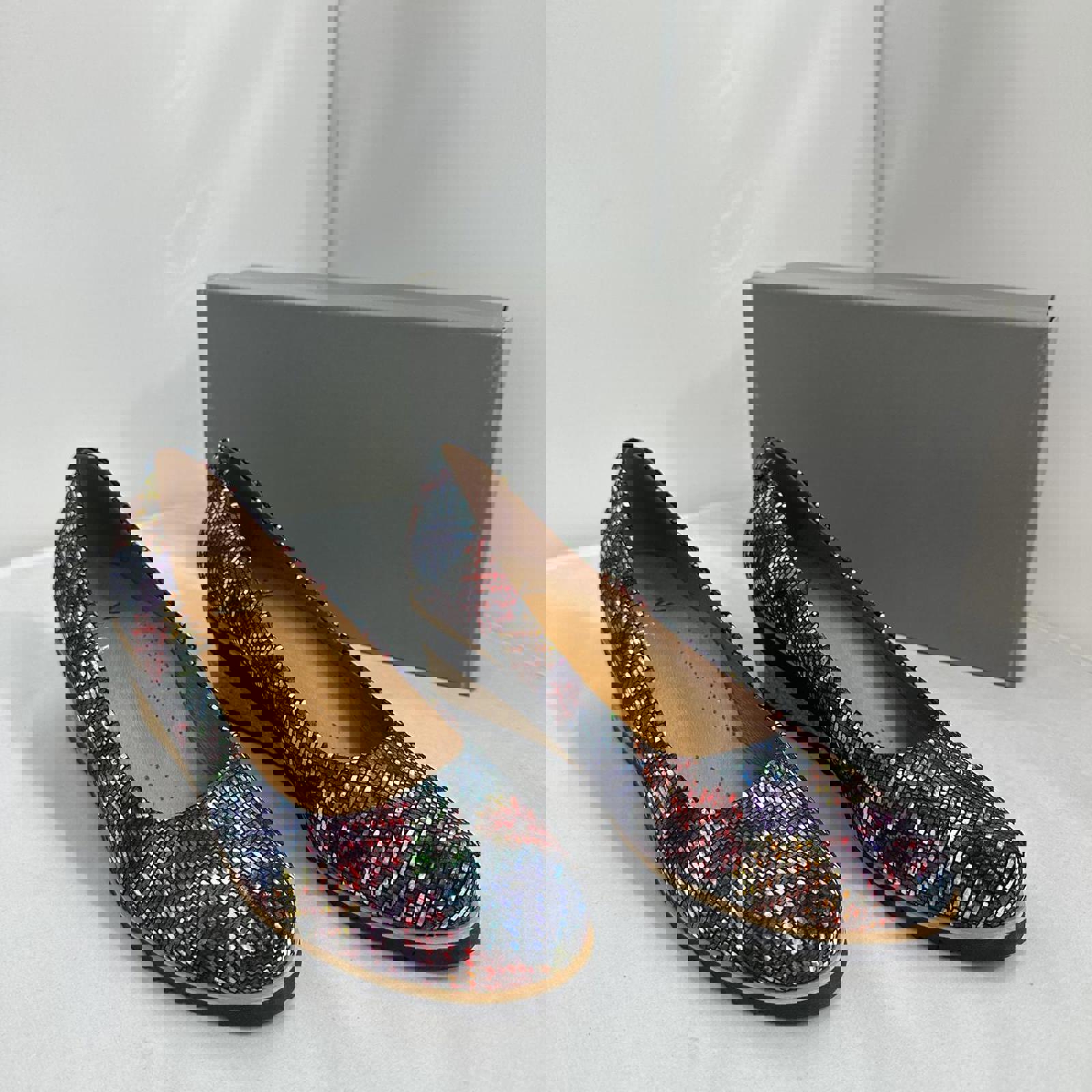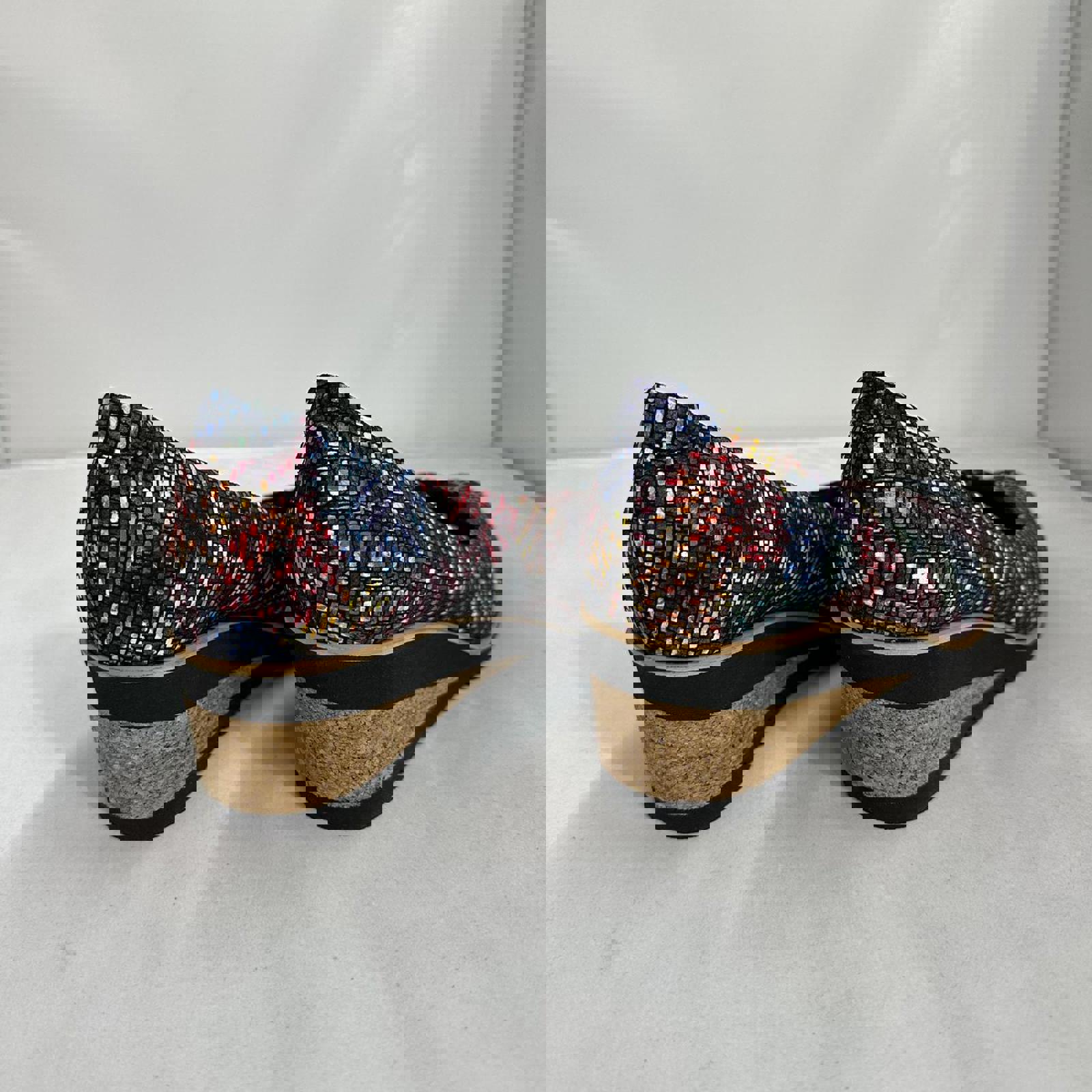 These wedge shoes feature a vibrant geometric pattern with a textured sole and a comfortable insole.