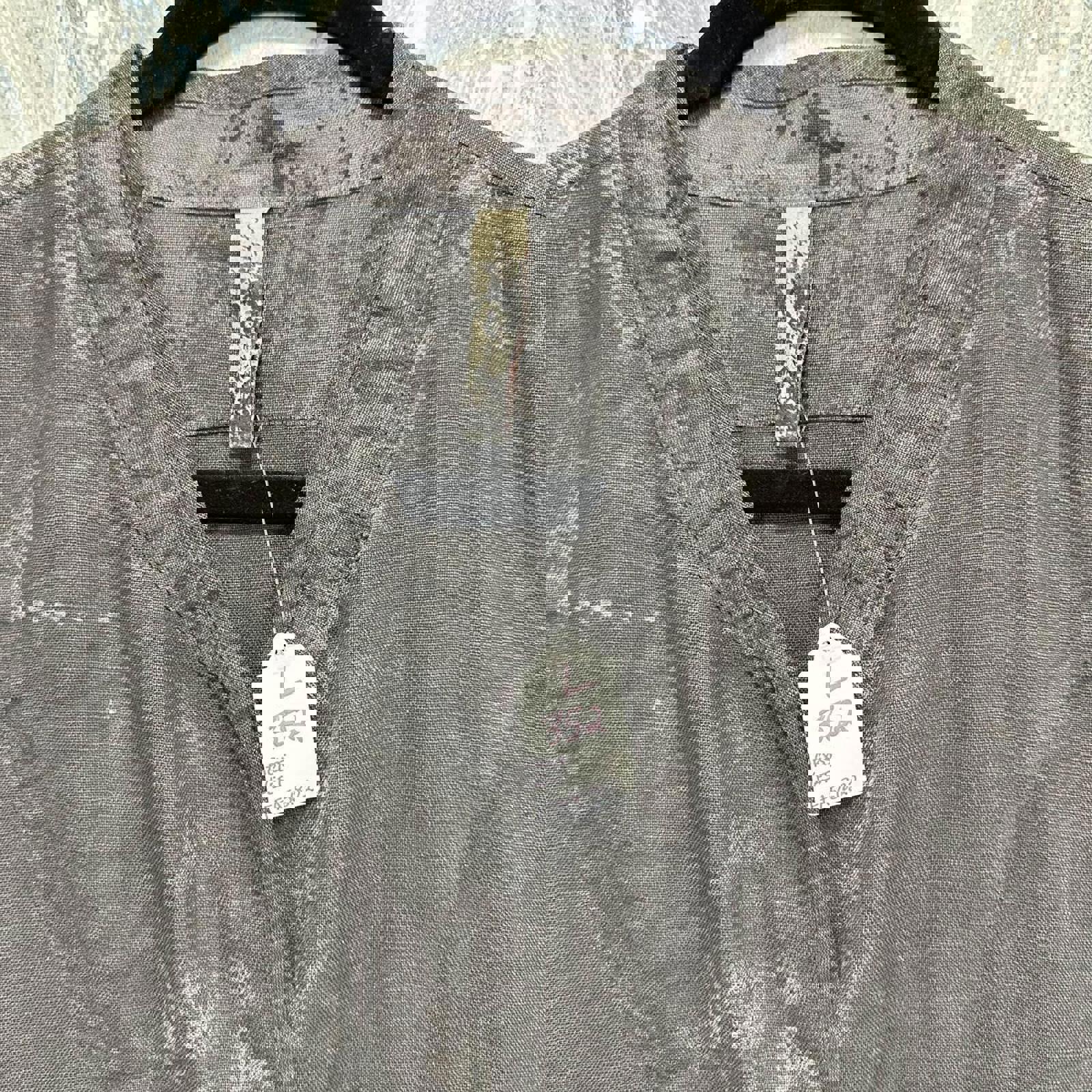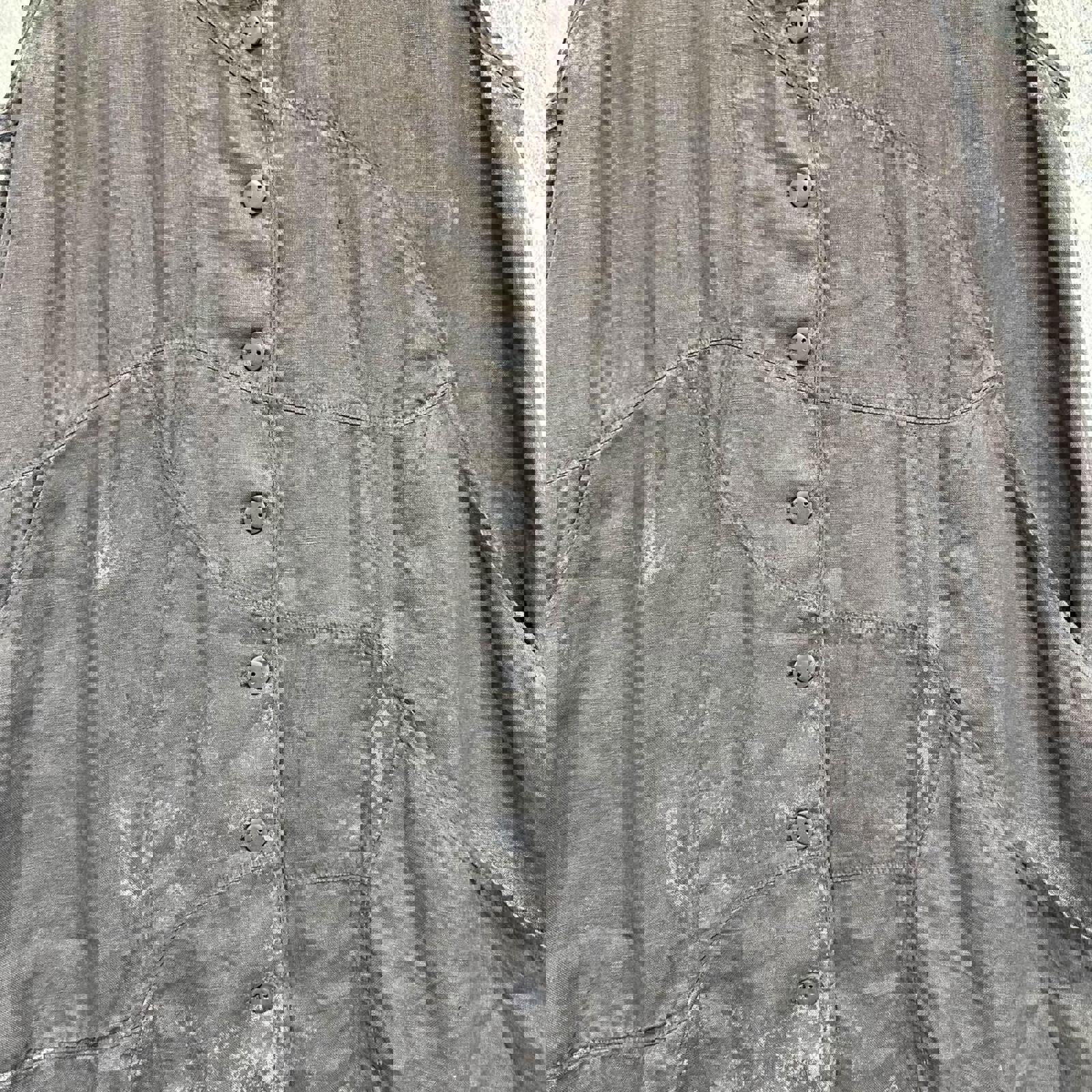 This garment is a sleeveless, dark grey vest dress with button-up closure and an asymmetrical, paneled design.