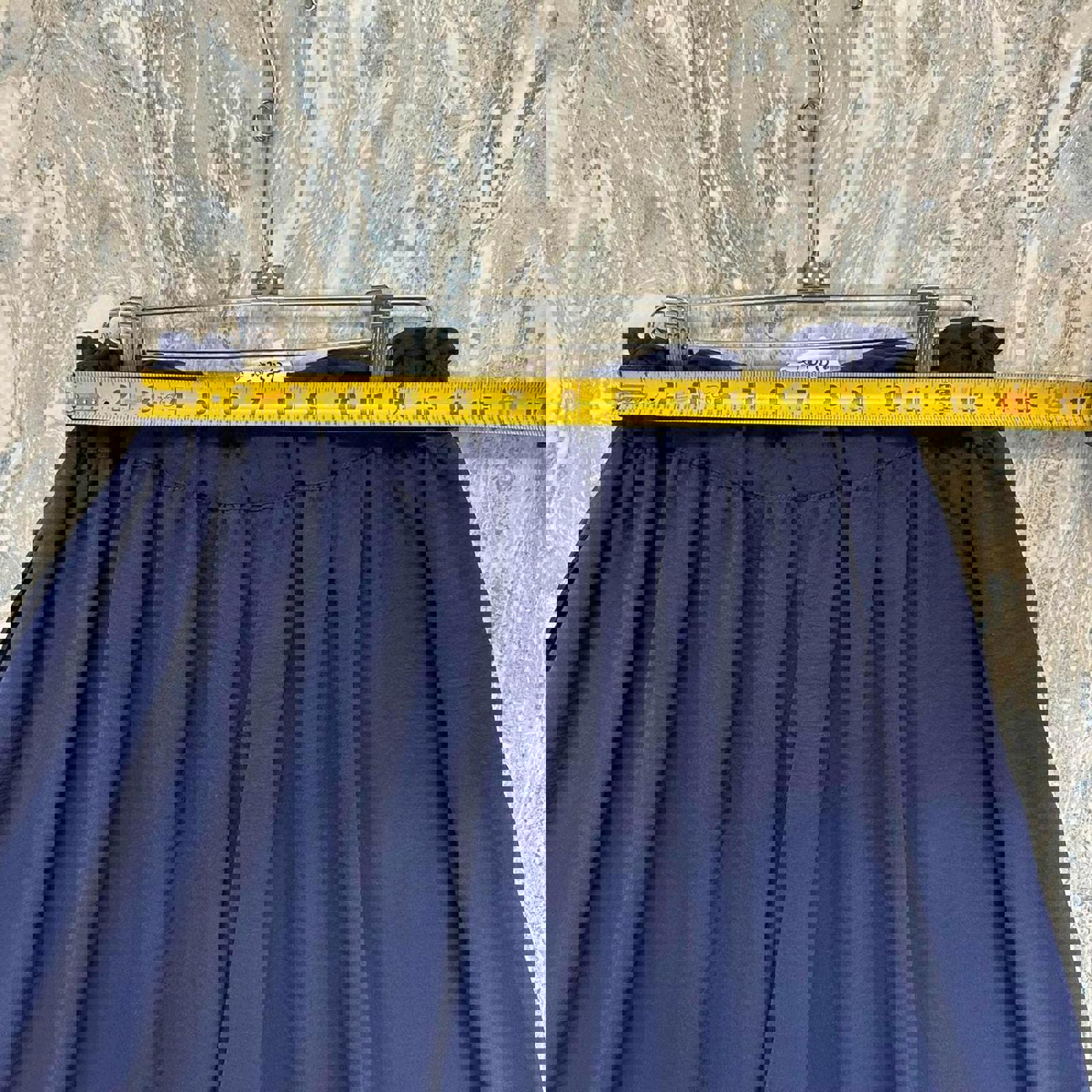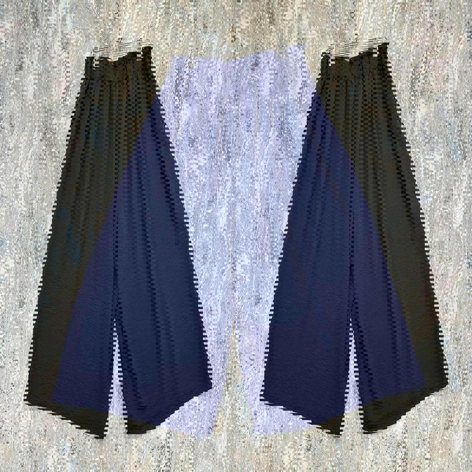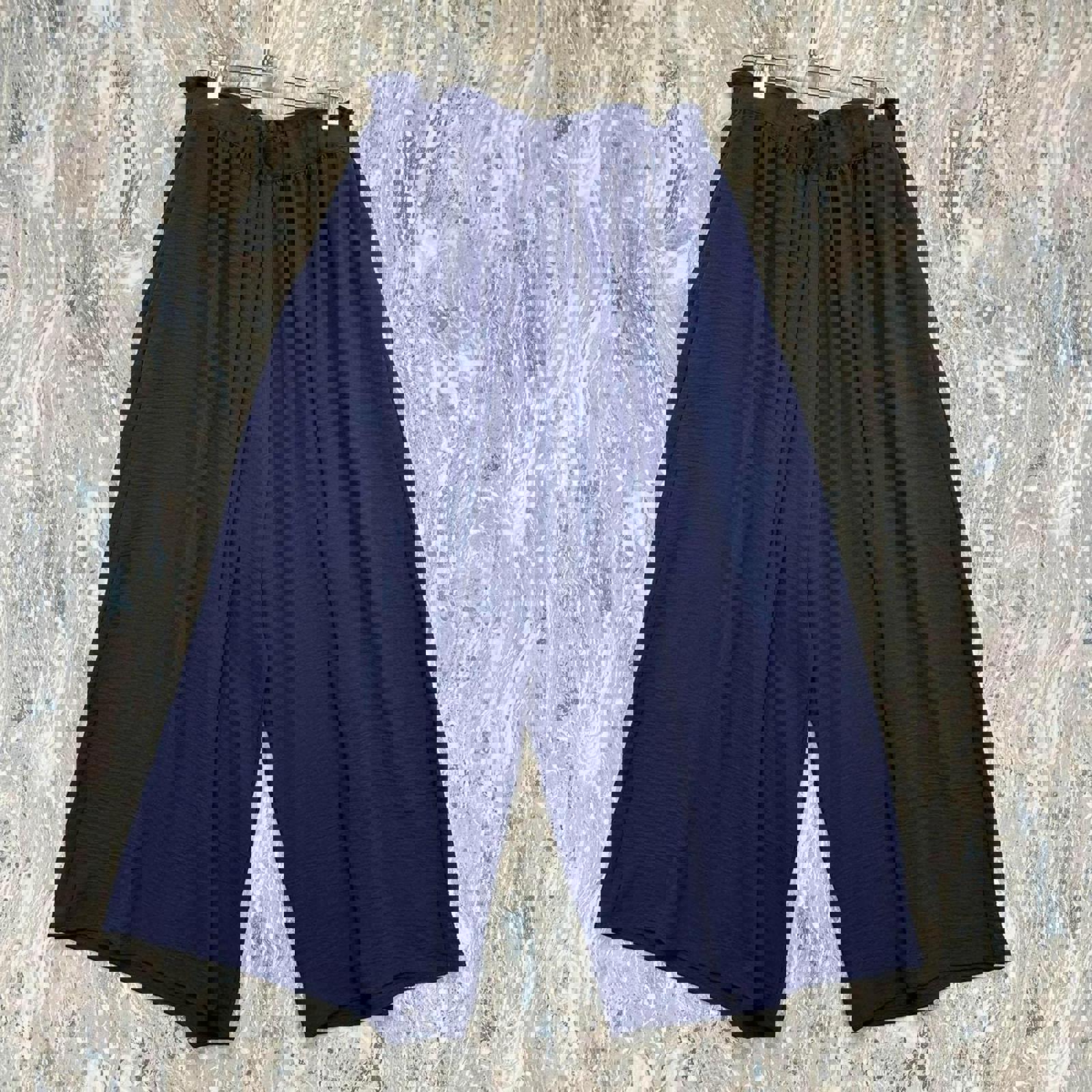 Navy blue wide leg pants featuring an elastic waistband for comfortable fit. Lightweight and flowy fabric ideal for casual wear. New with tags.