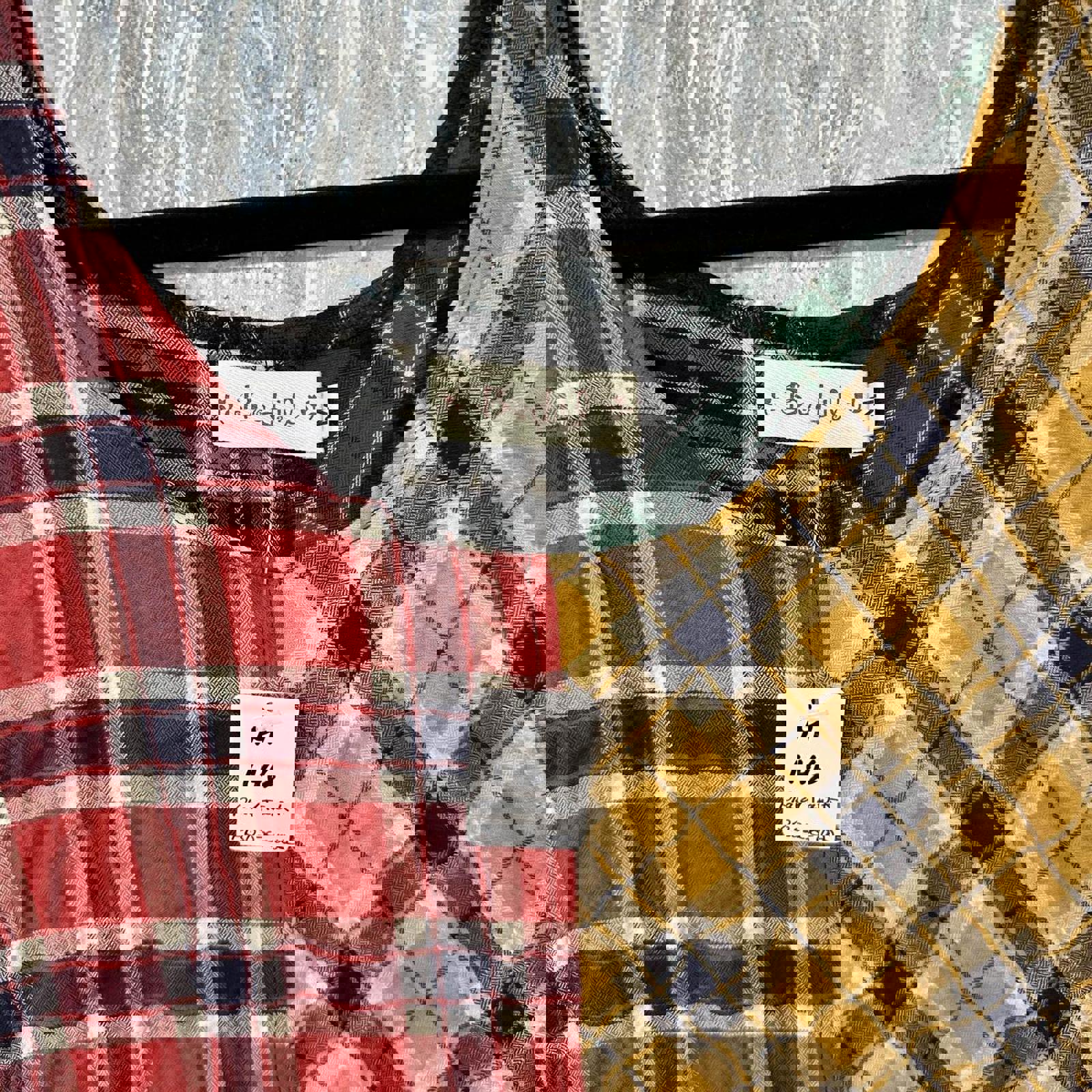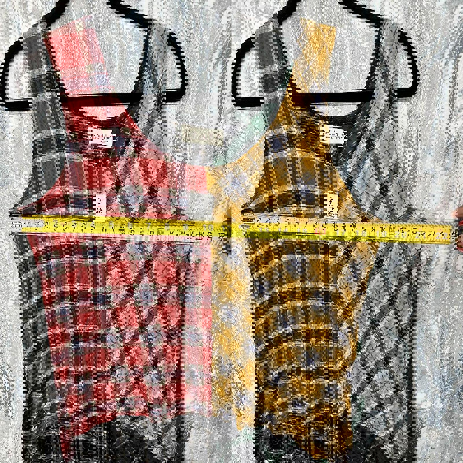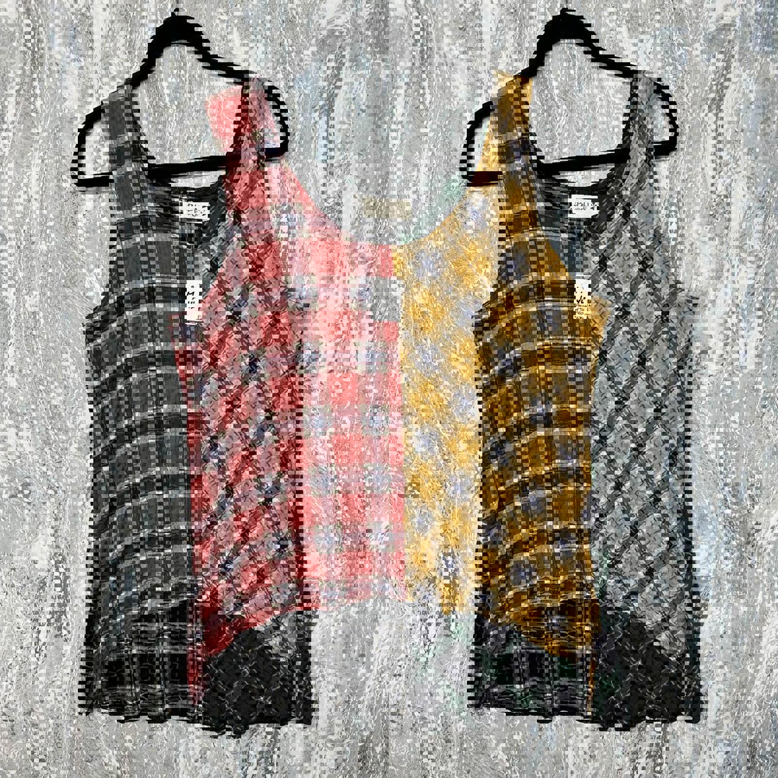 Colorful patchwork plaid sleeveless top featuring a mix of red, yellow, black, and green panels in a loose fit. Designer brand new with tags.