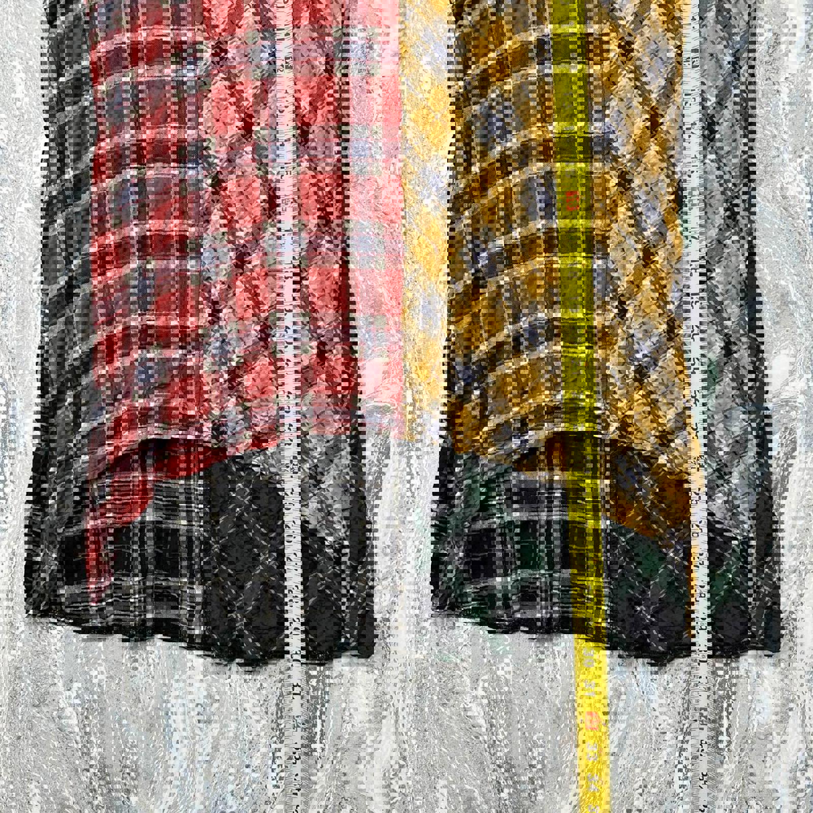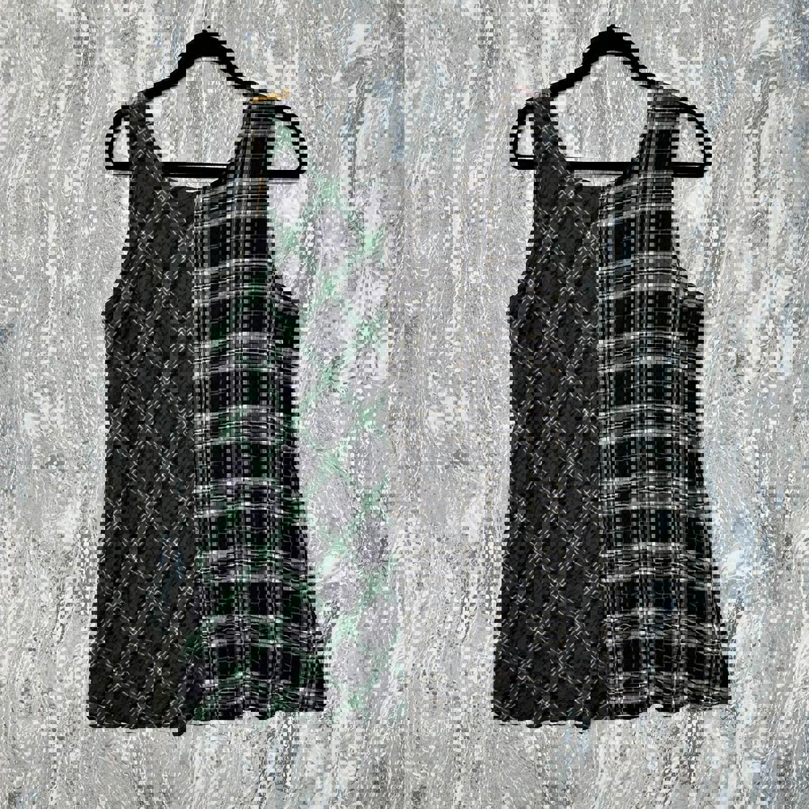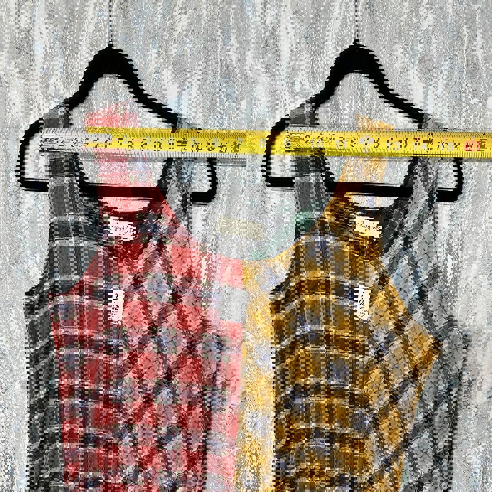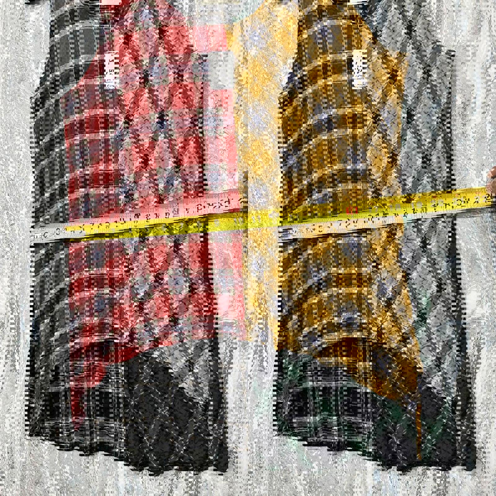 Colorful patchwork plaid sleeveless top featuring a mix of red, yellow, black, and green panels in a loose fit. Designer brand new with tags.