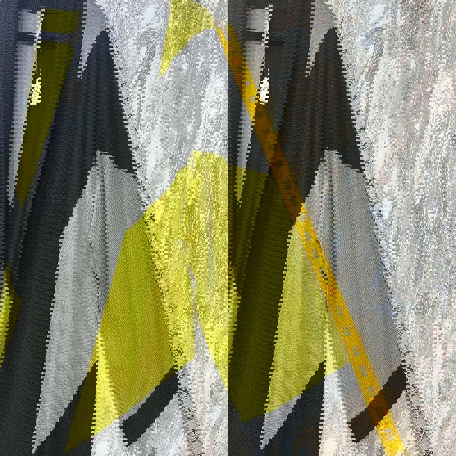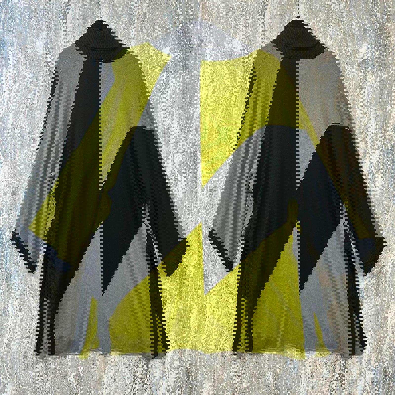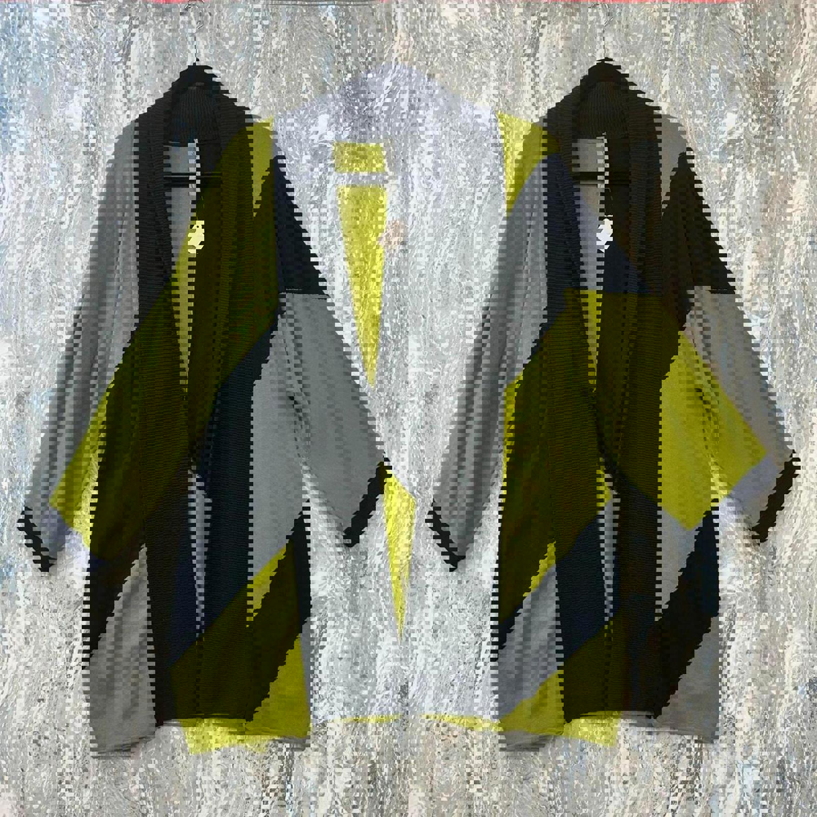 A draped cardigan featuring bold black geometric patterns on a green background. #cardigan #artsy #casual #minimalist #avantgarde