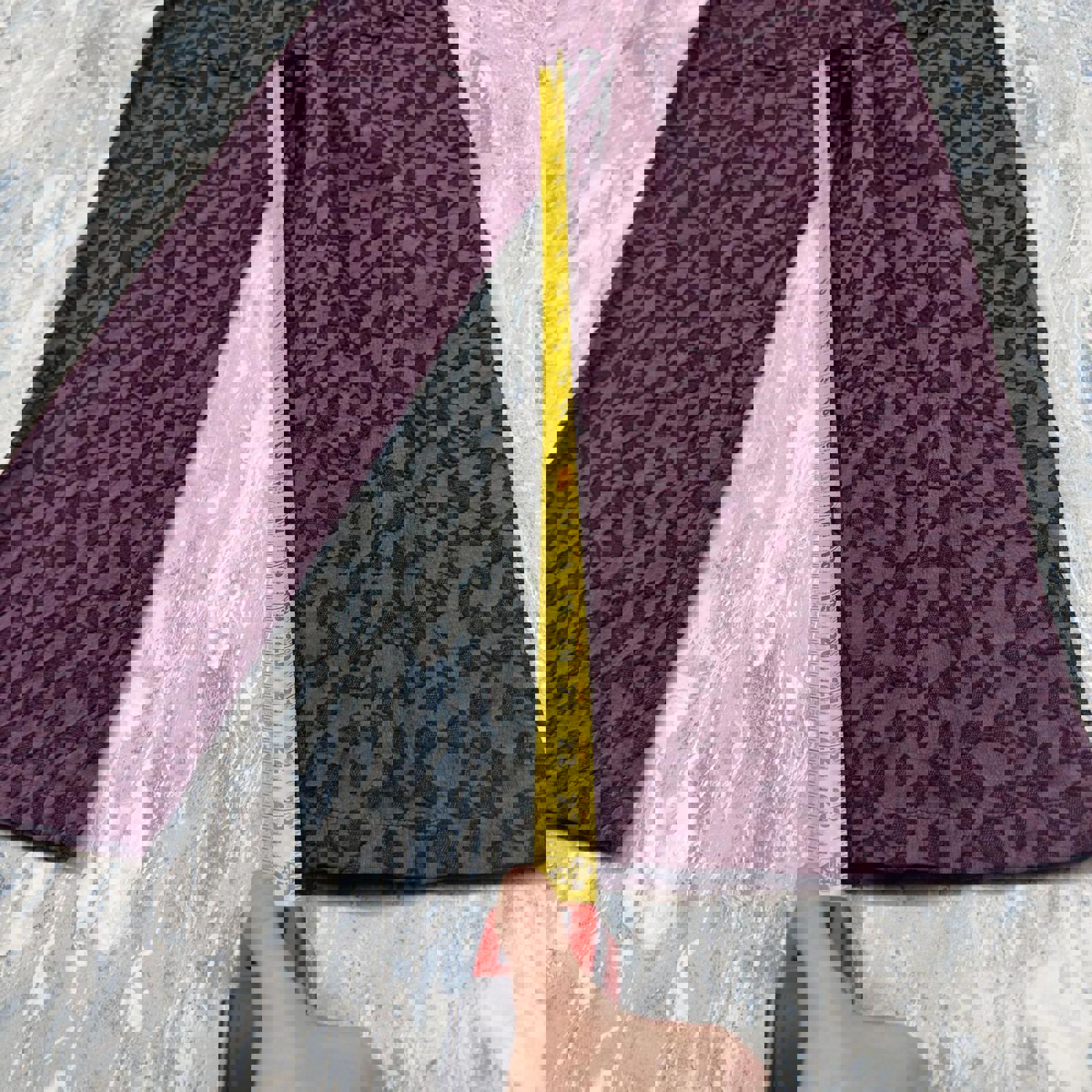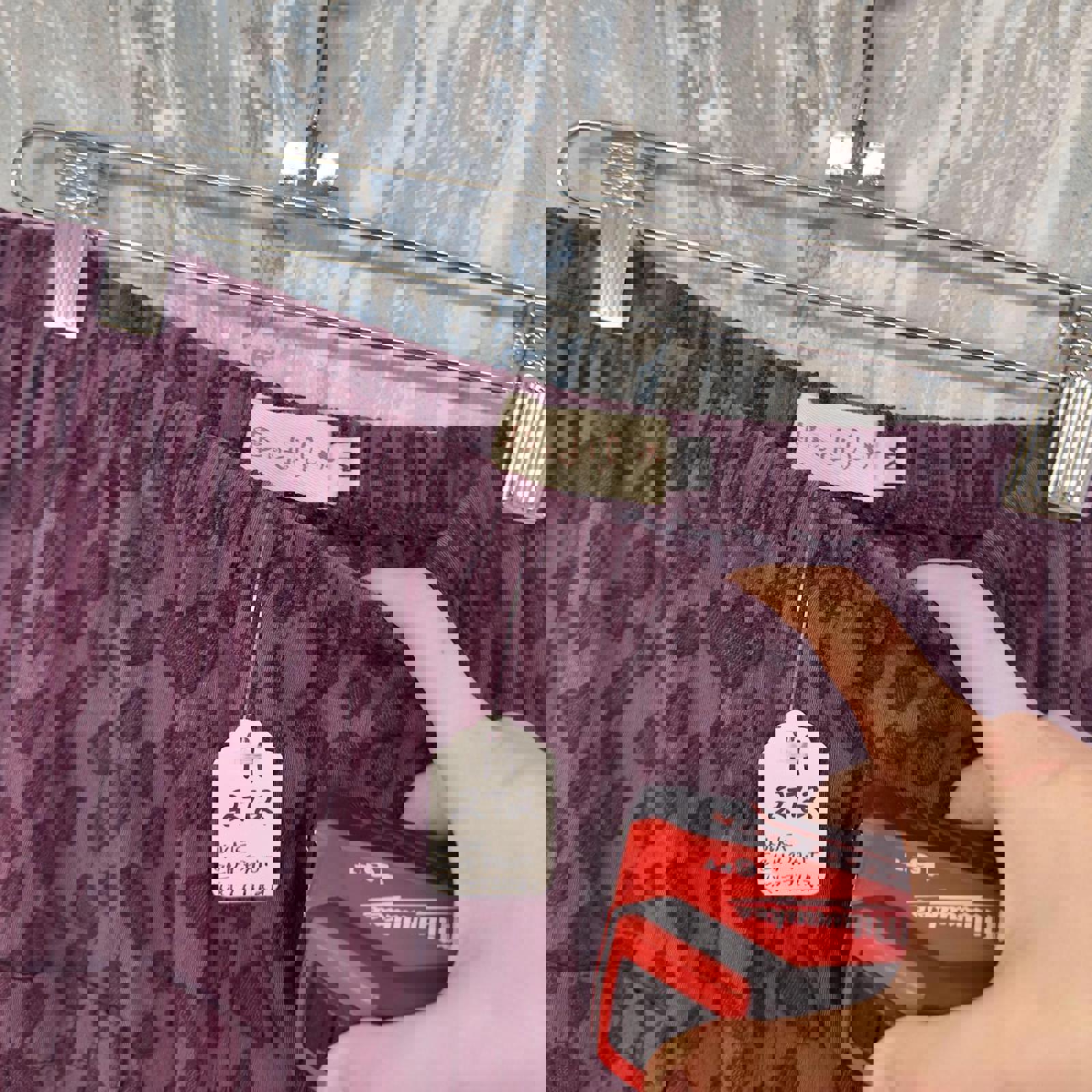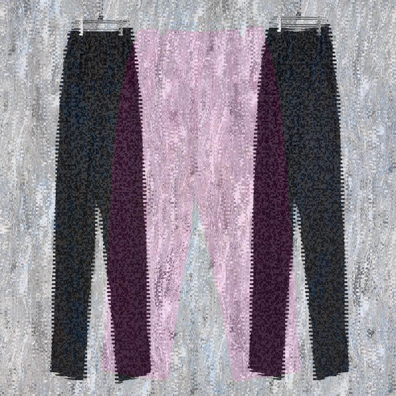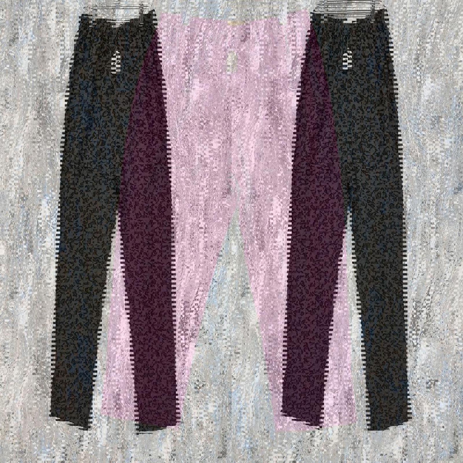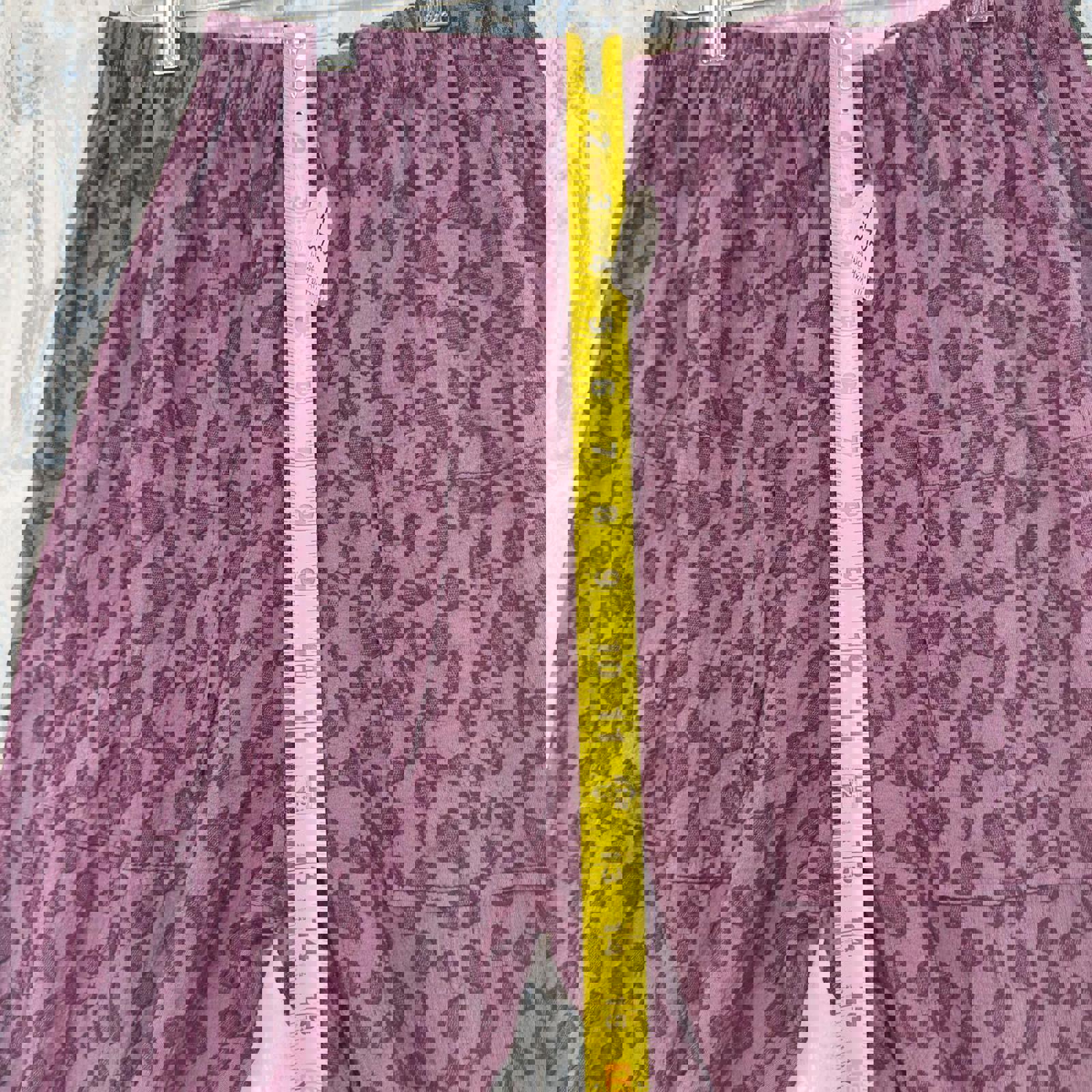 Mid-rise purple pants with a subtle leopard print and practical front pockets.