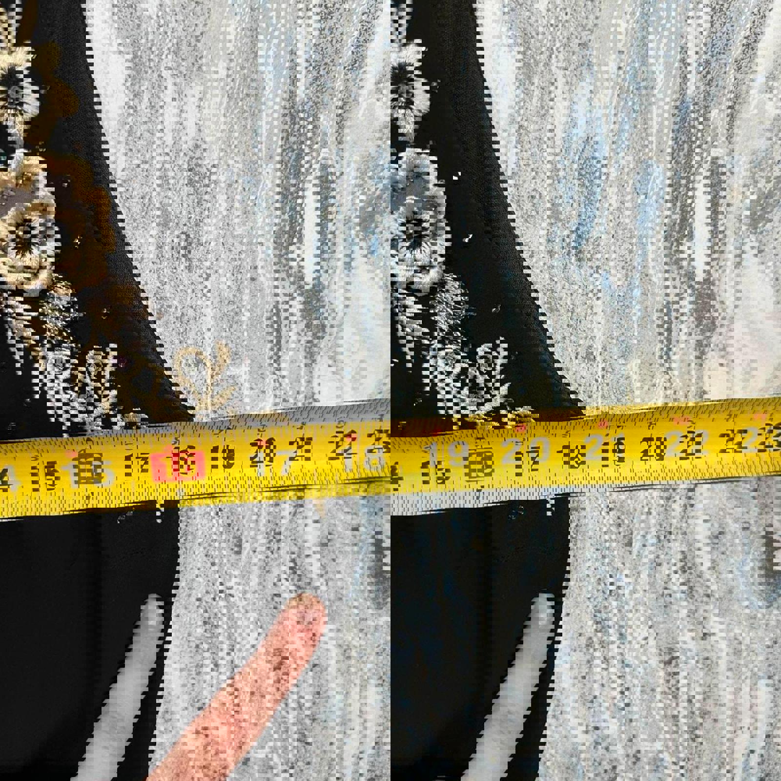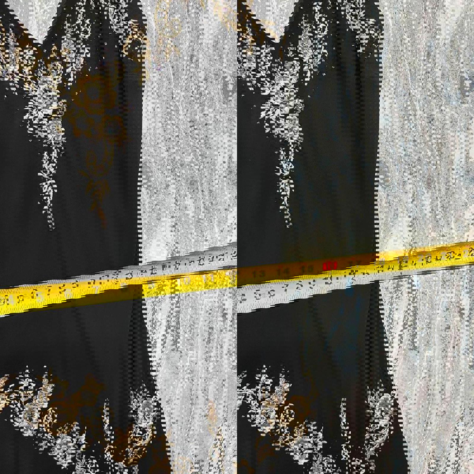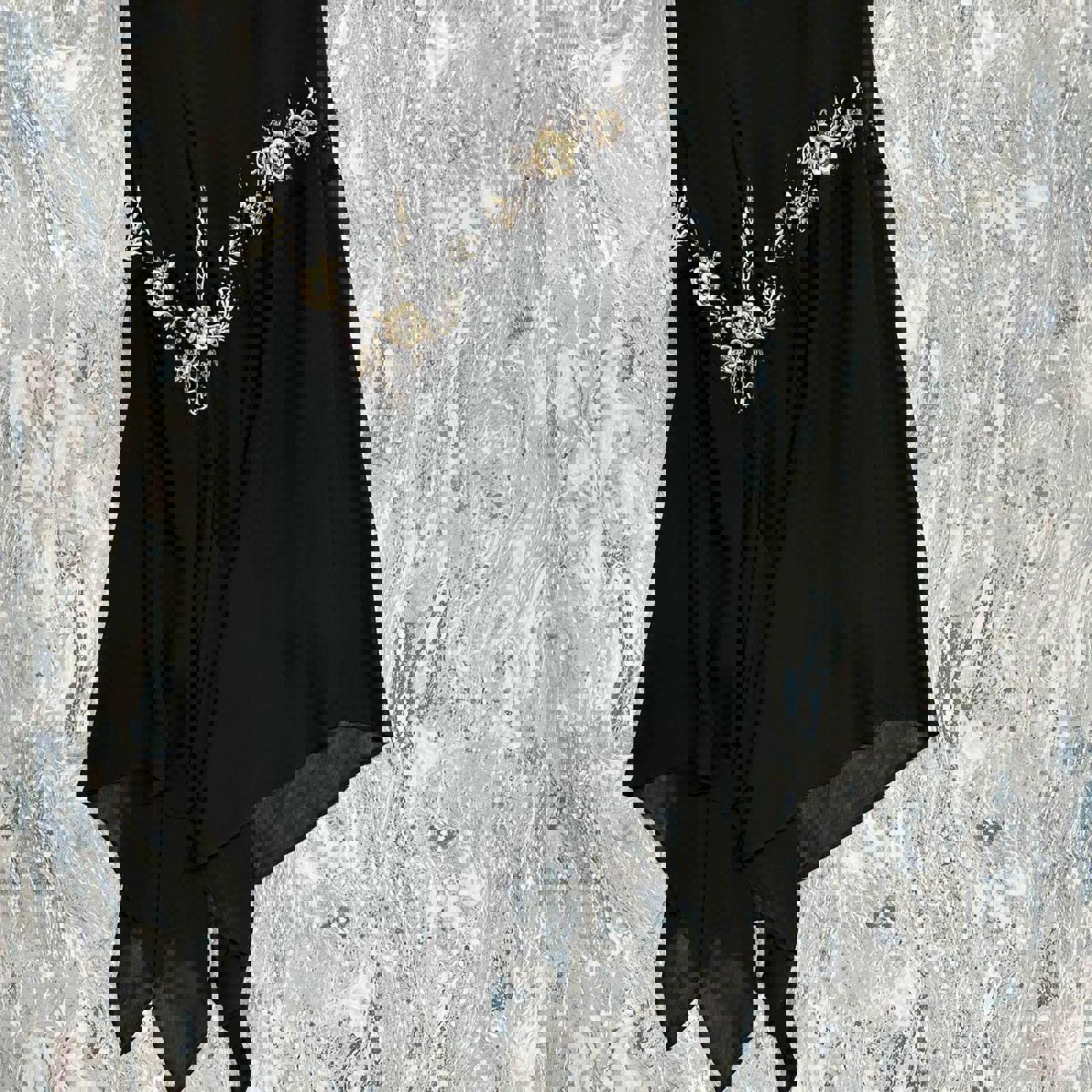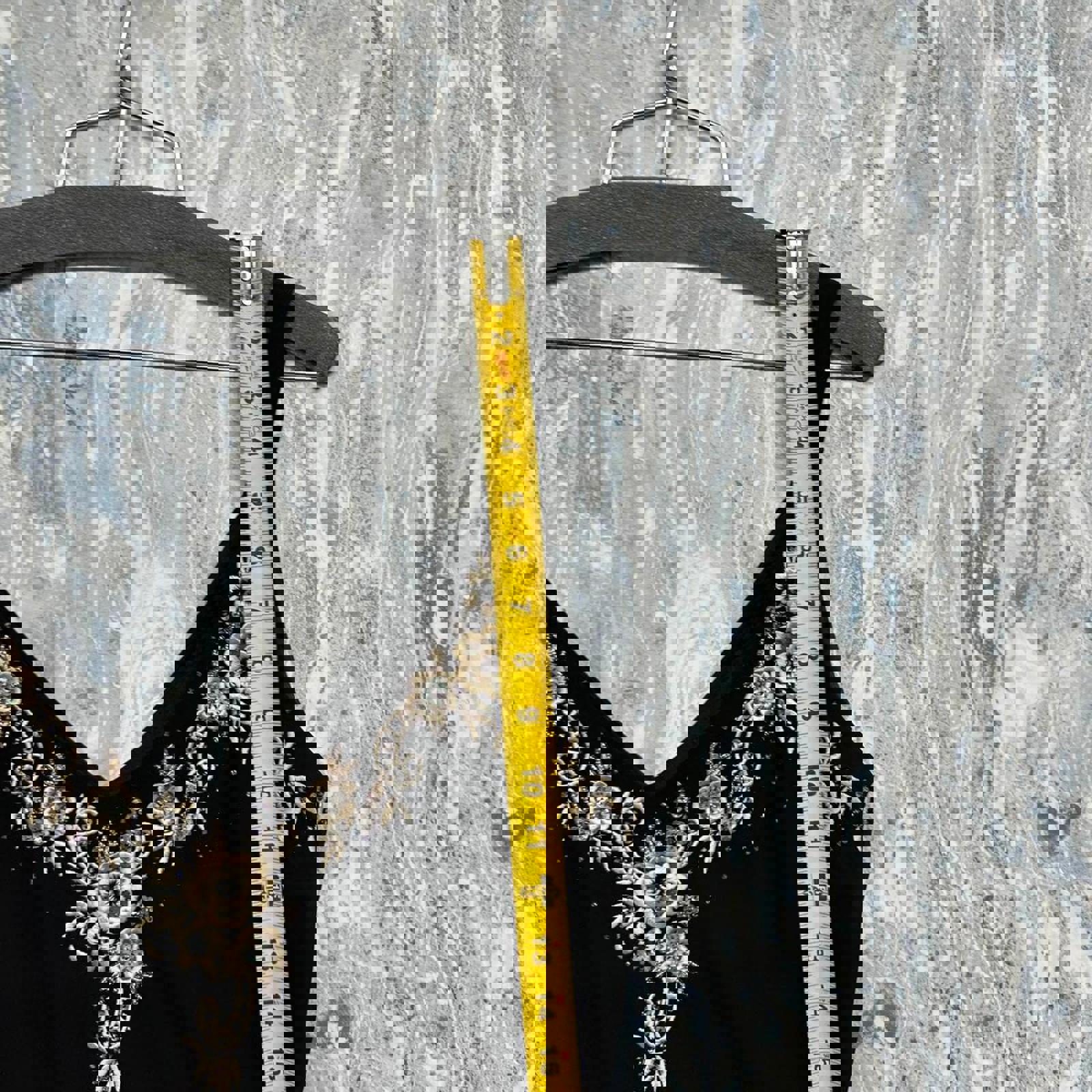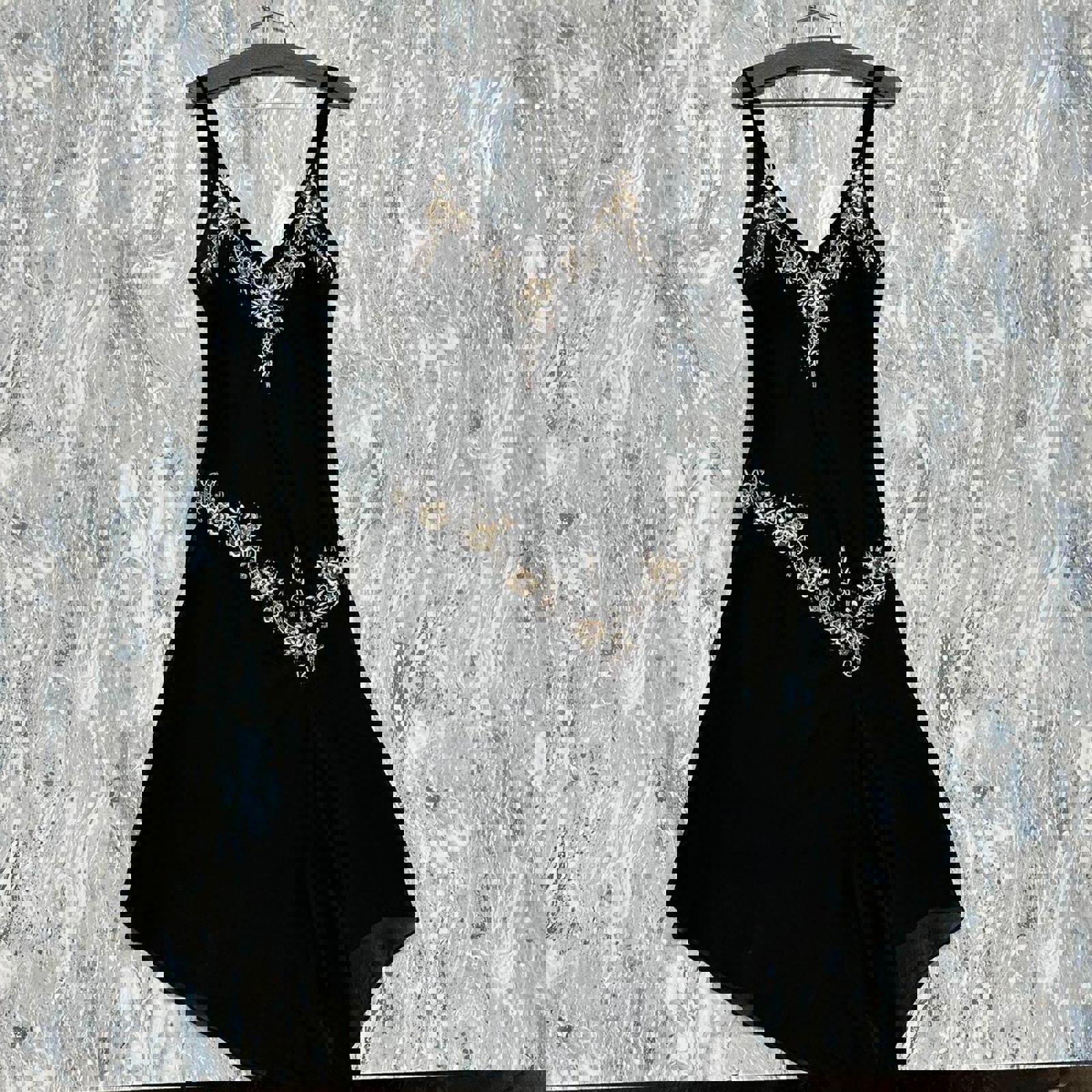 Elegant black dress featuring intricate floral embroidery along the neckline and waist. Sleeveless design with a flattering V-neck cut. Size 10, made from imported fabric.