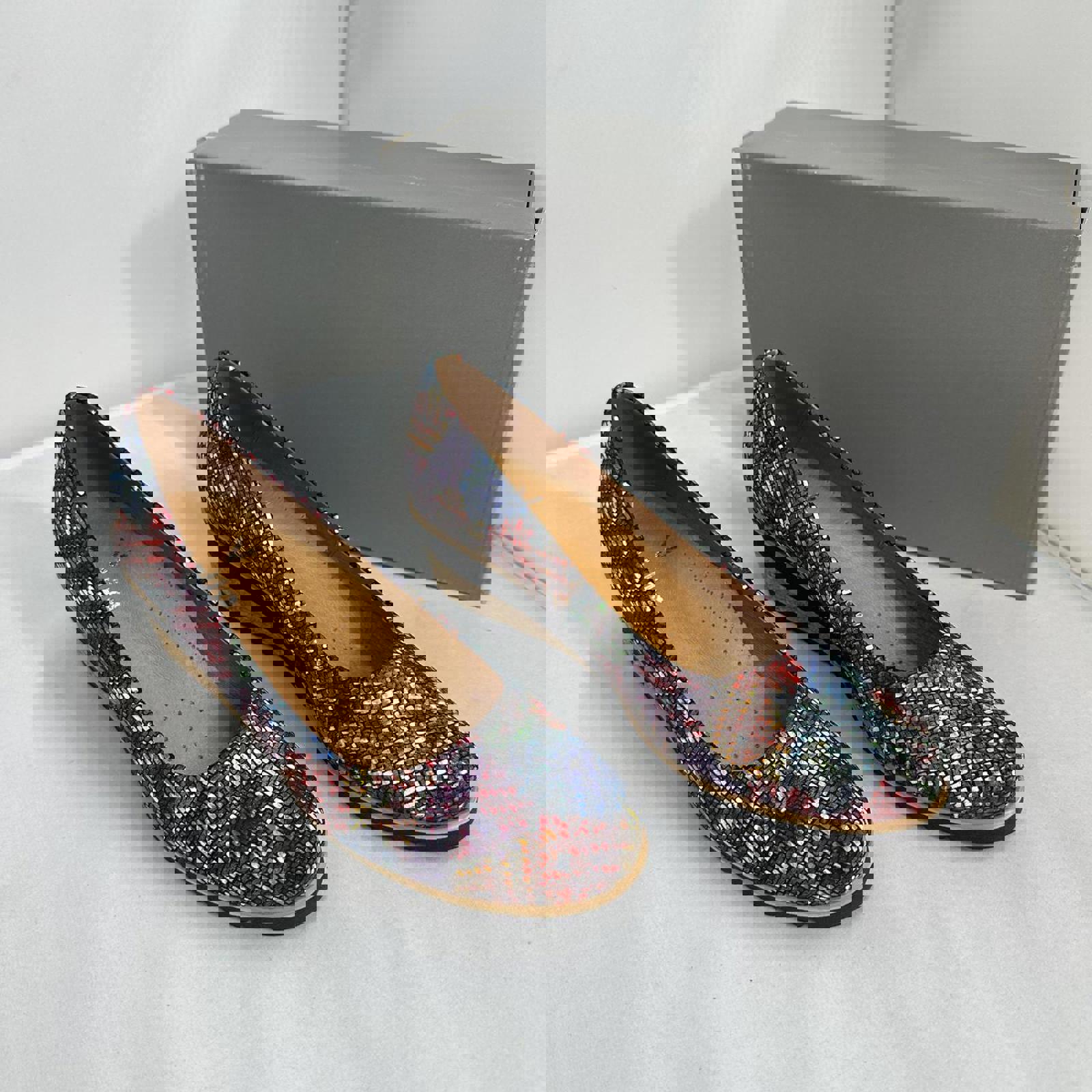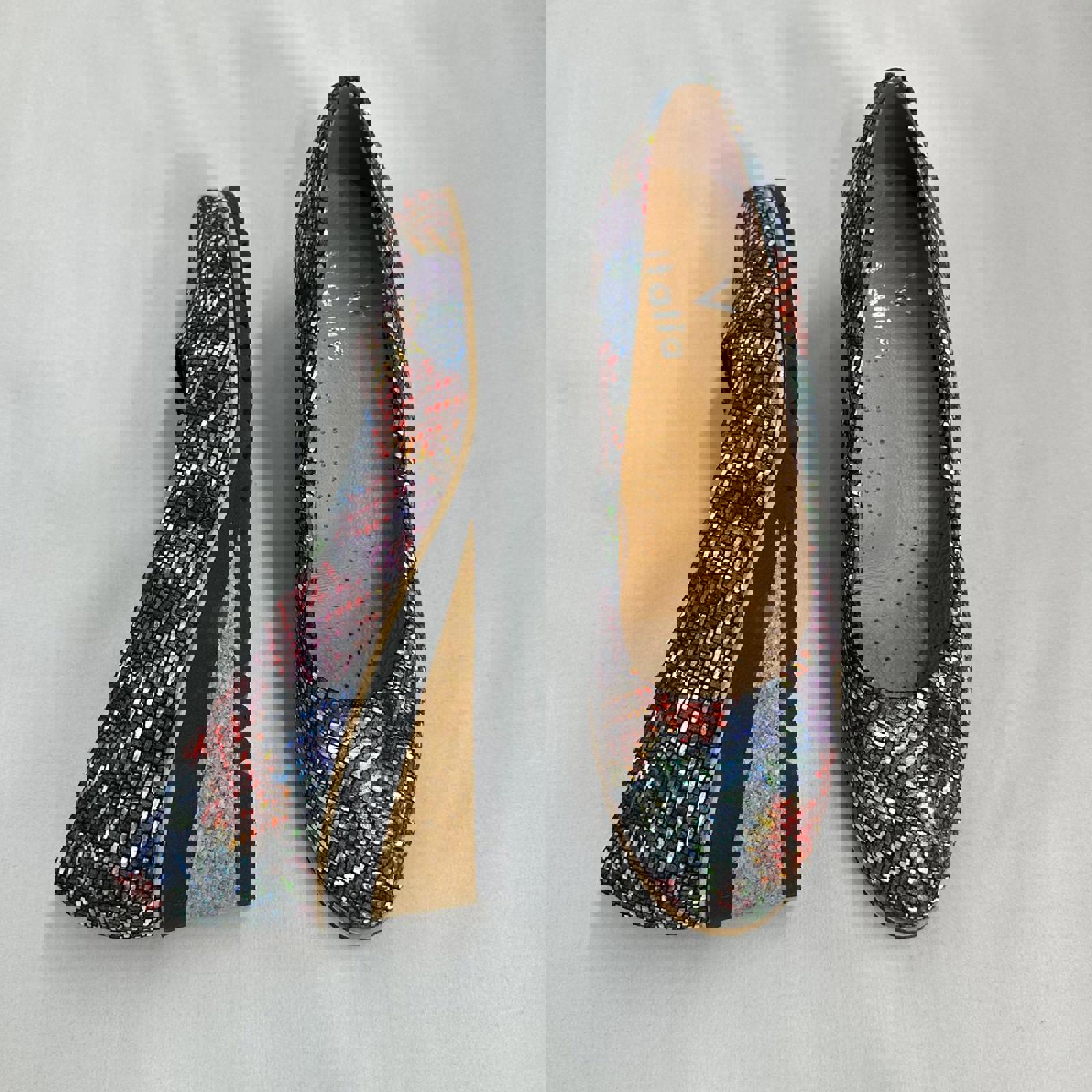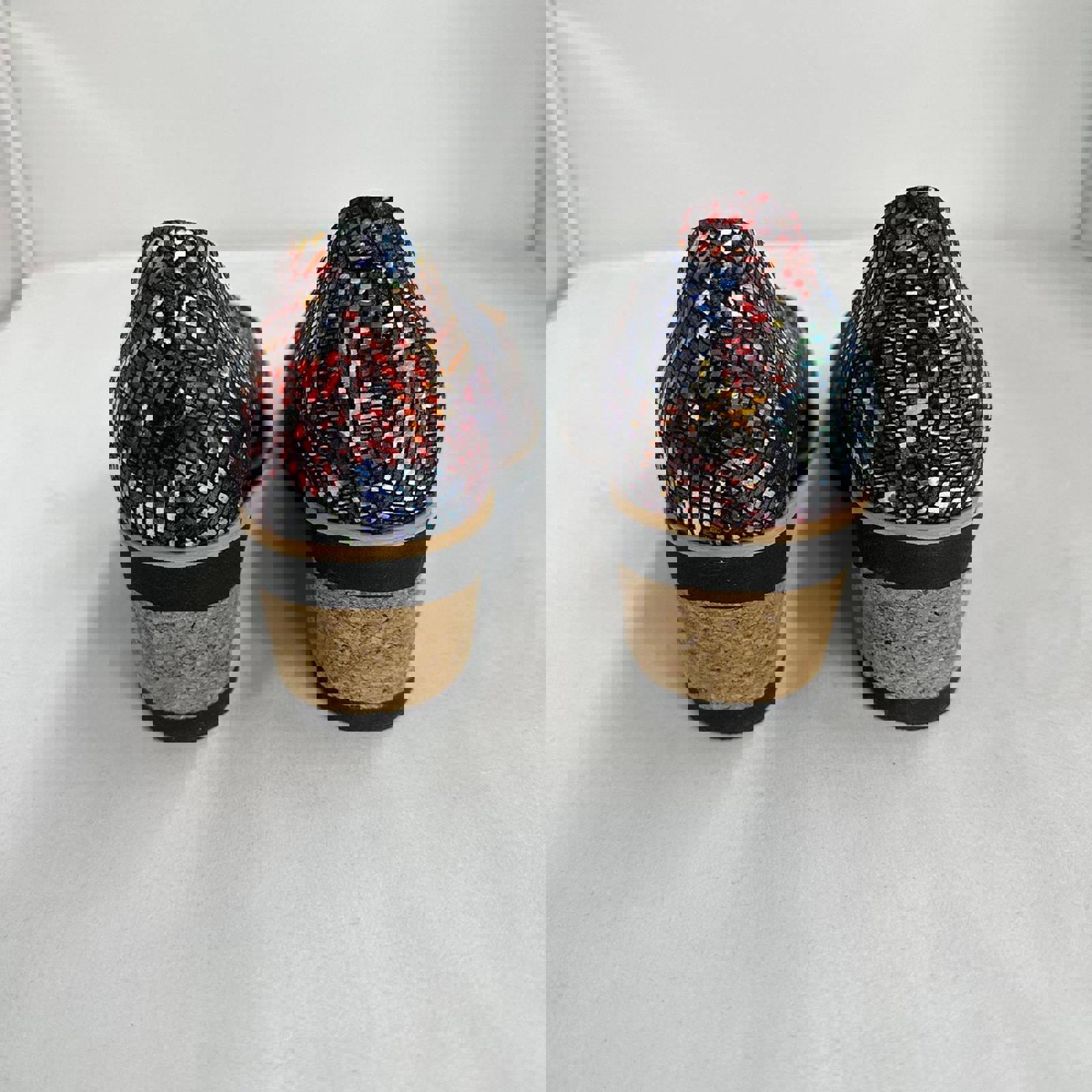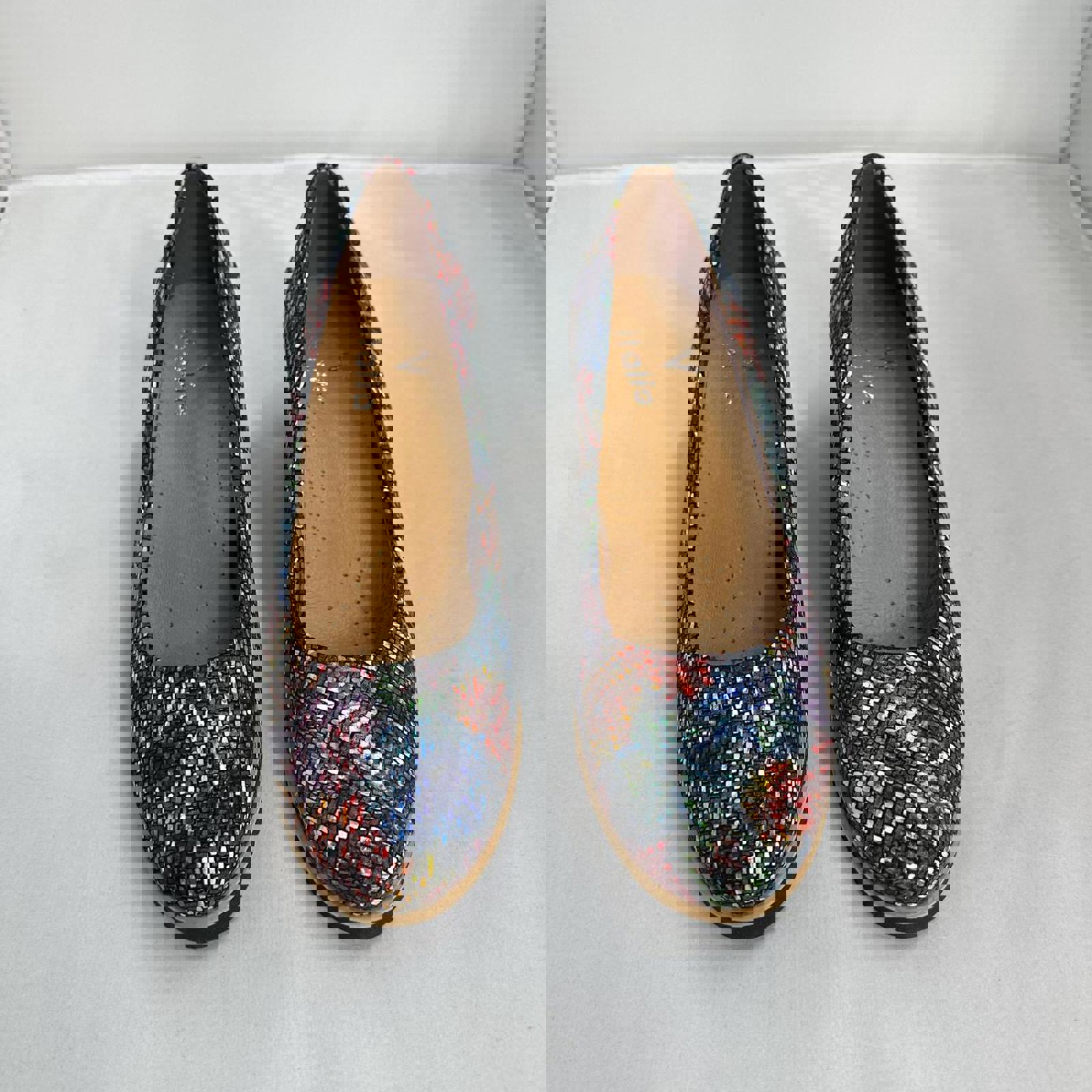 Vibrant multicolor patterned shoes featuring a comfortable wedge heel and perforated insole for breathability.