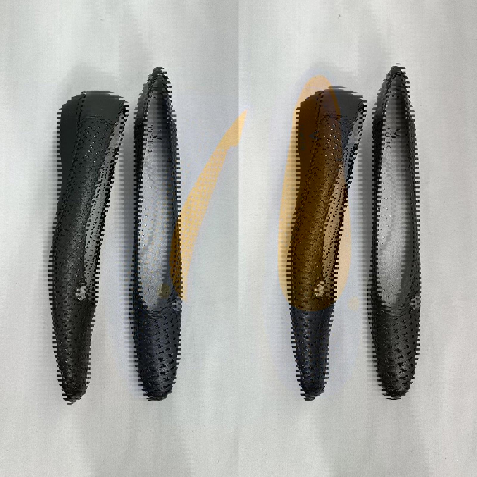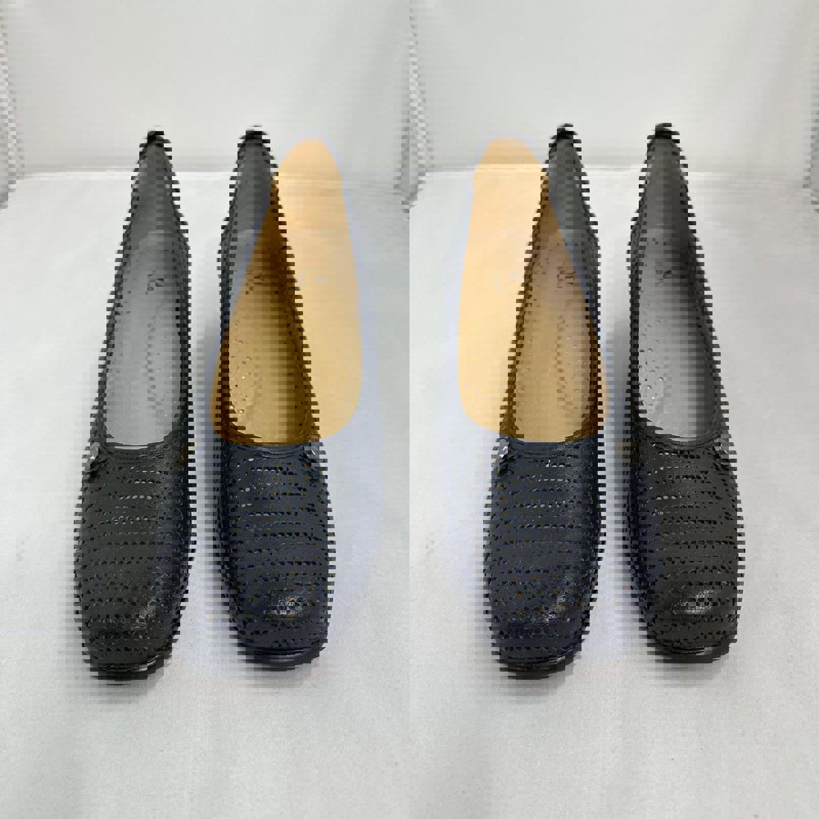 These navy wedge shoes feature a perforated design with a small emblem detail, offering both style and breathability.