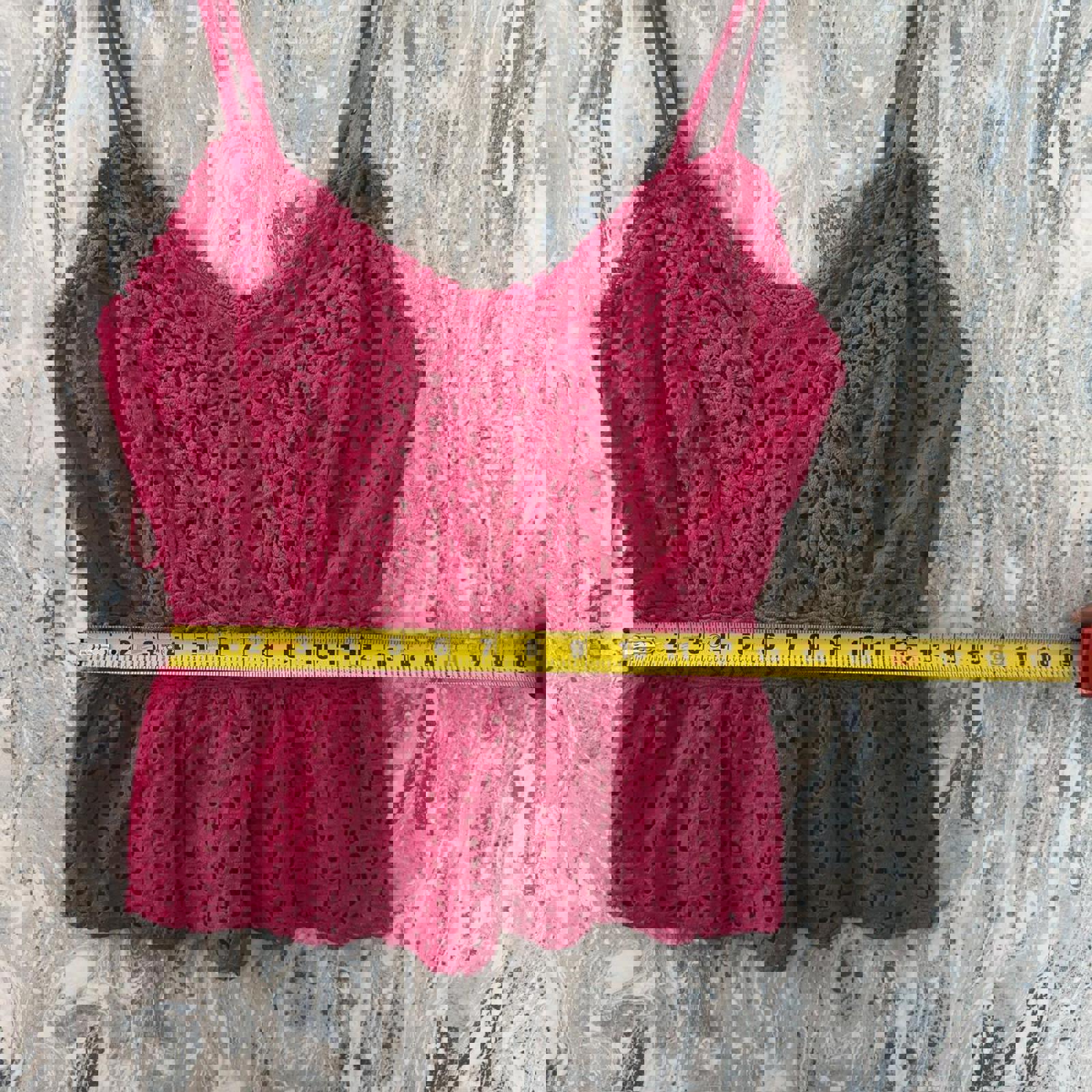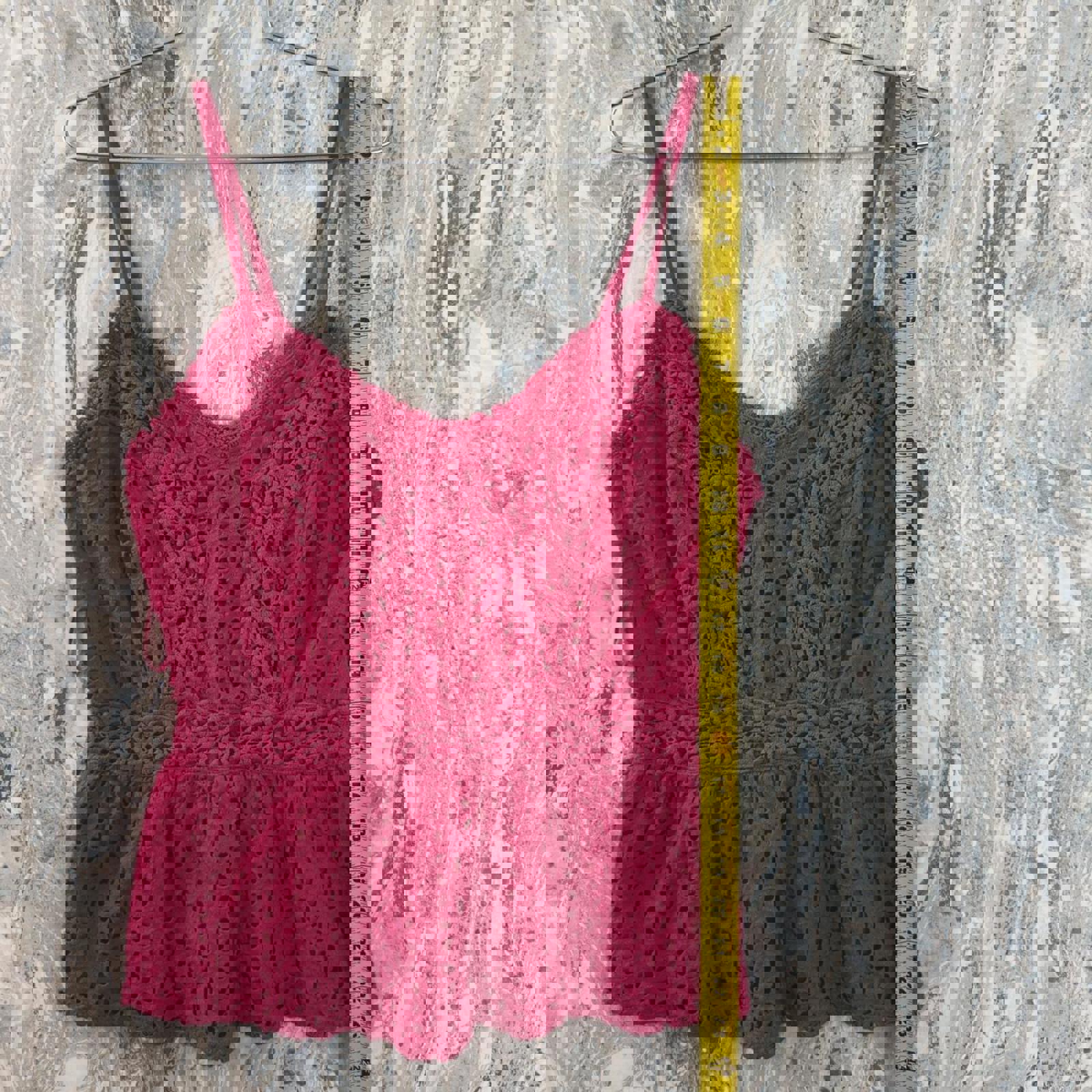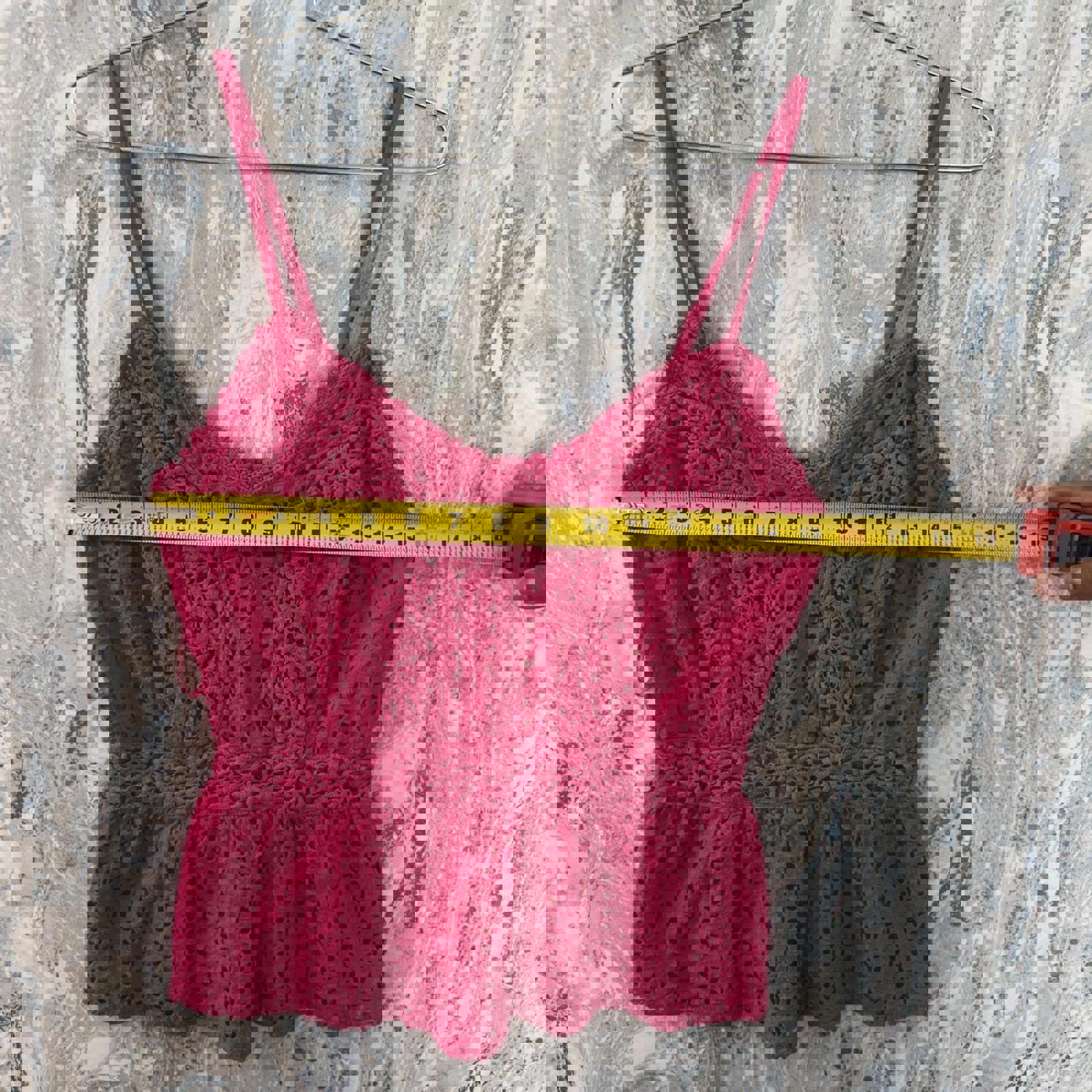 This pink lace camisole top features delicate floral lace with a flattering peplum waist. It has adjustable double spaghetti straps for a customizable fit. The top measures approximately 15 inches across the bust and 13 inches at the waist, suitable for a small size. Perfect for layering or wearing alone in warmer weather.