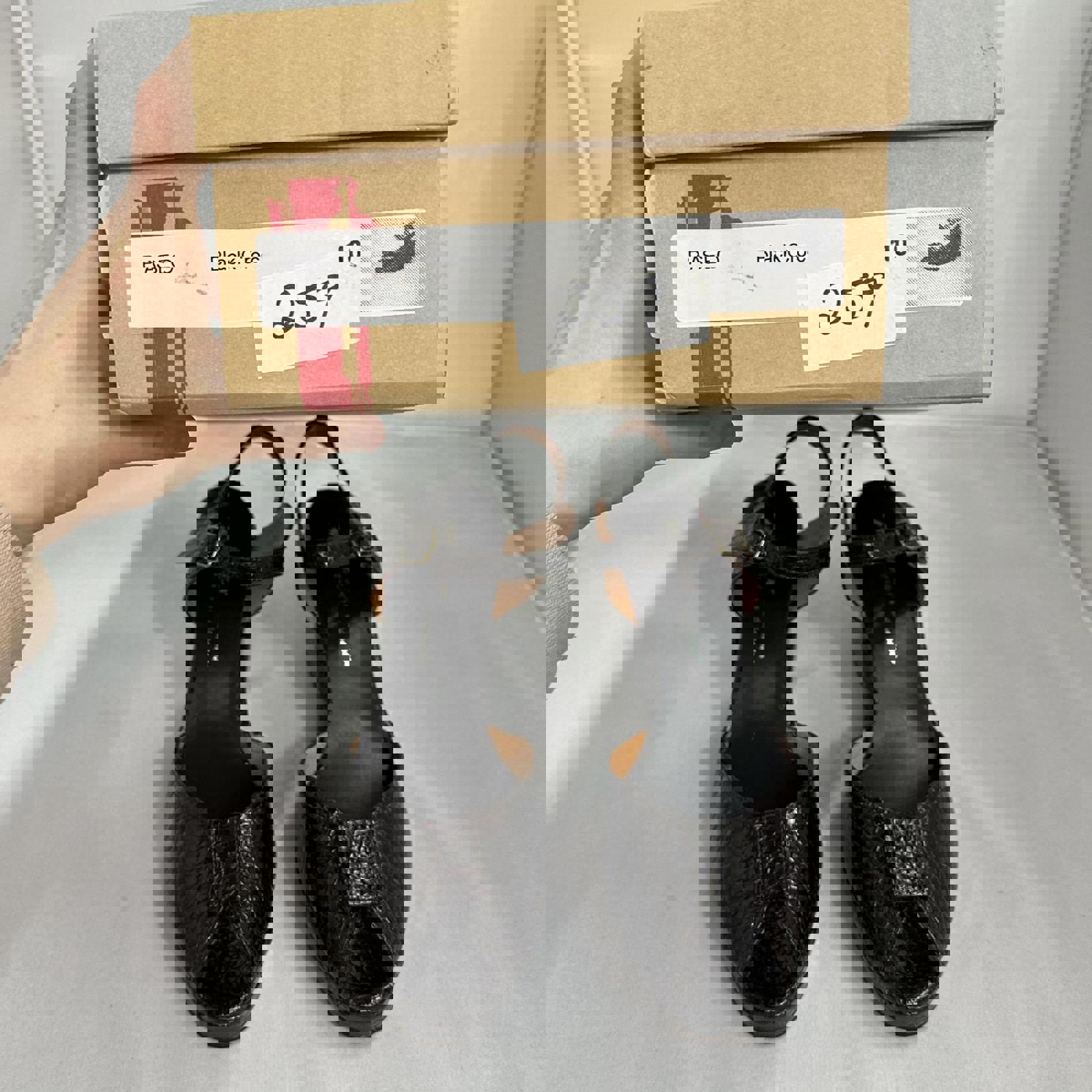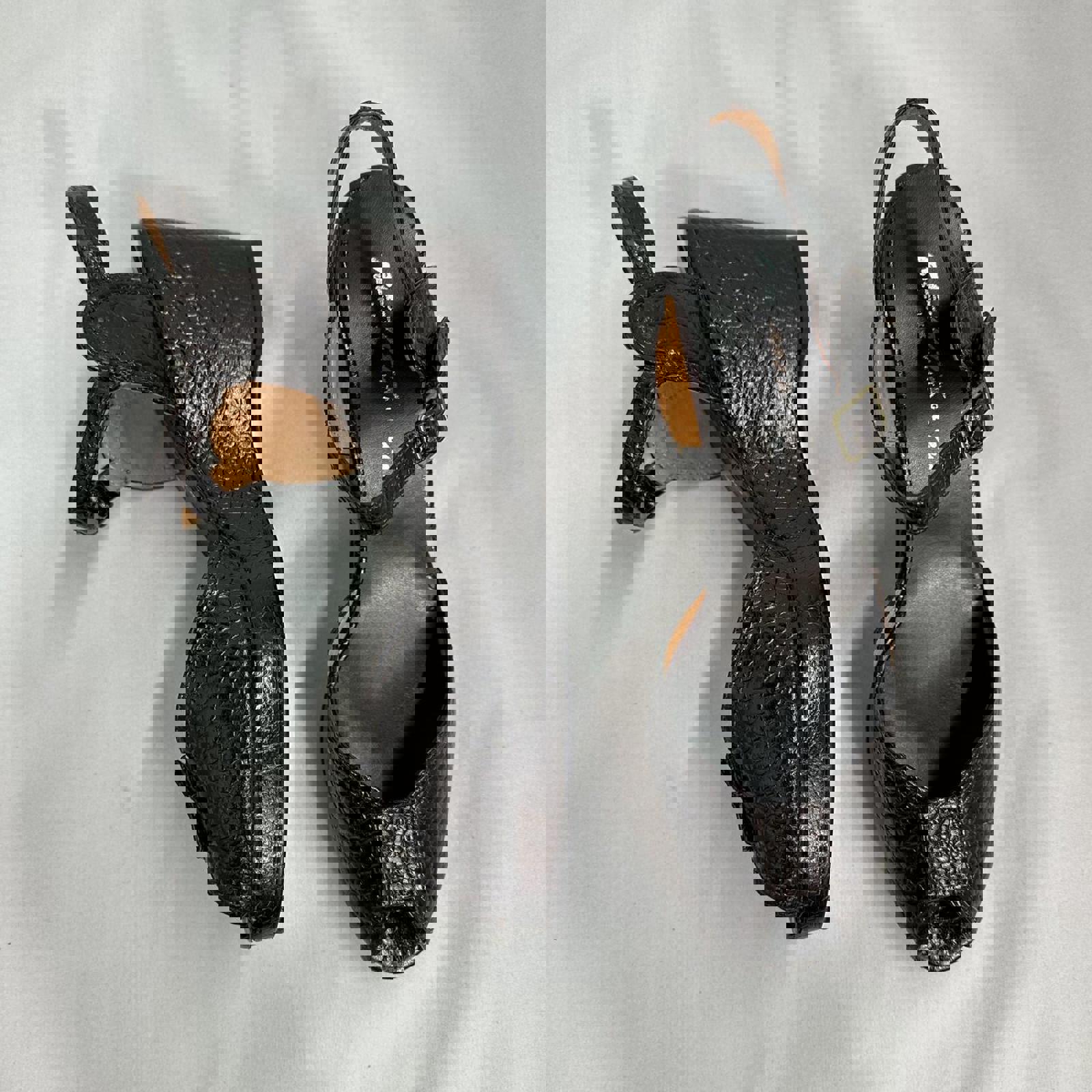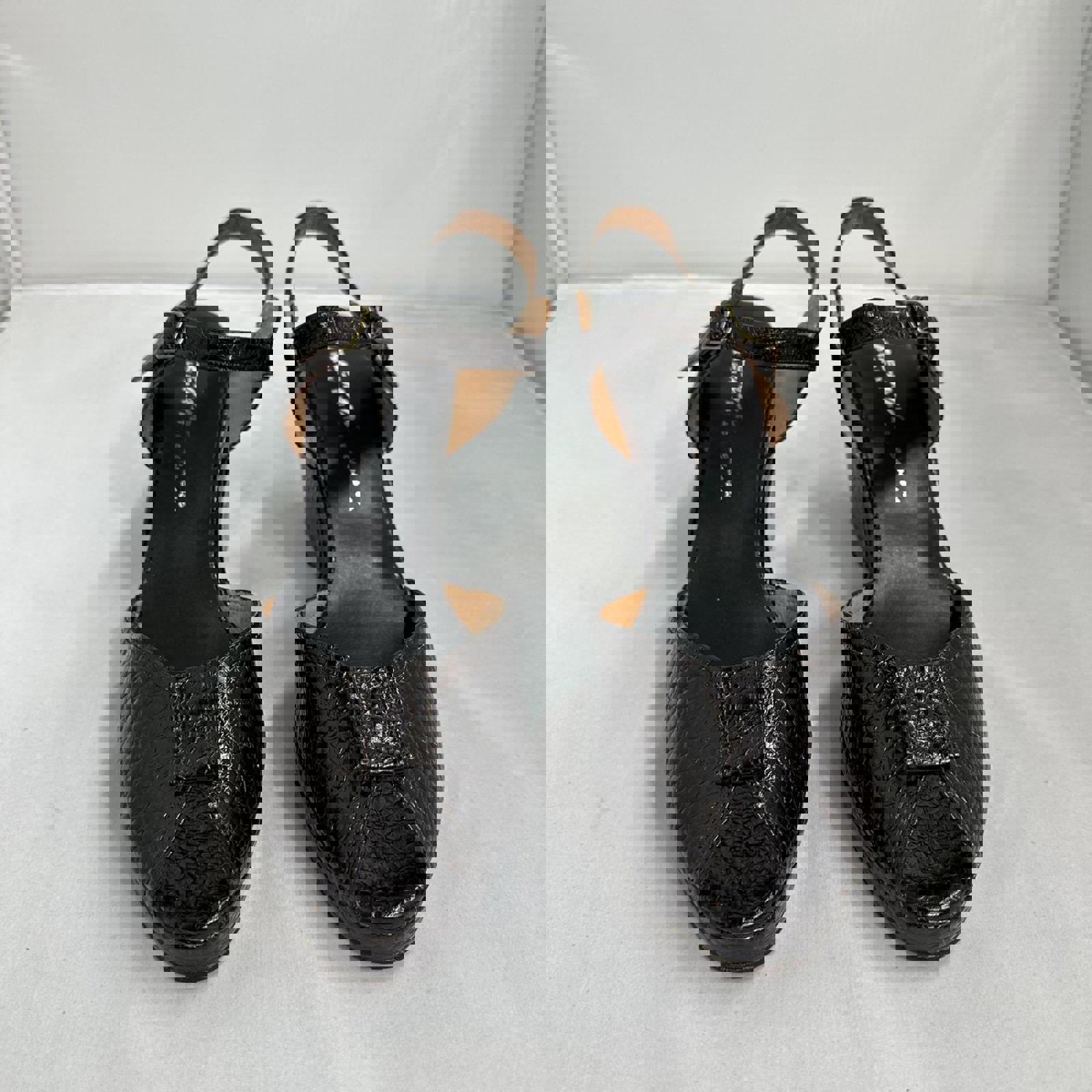 Stylish black croc-embossed wedge sandals featuring an adjustable ankle strap and peep-toe design.