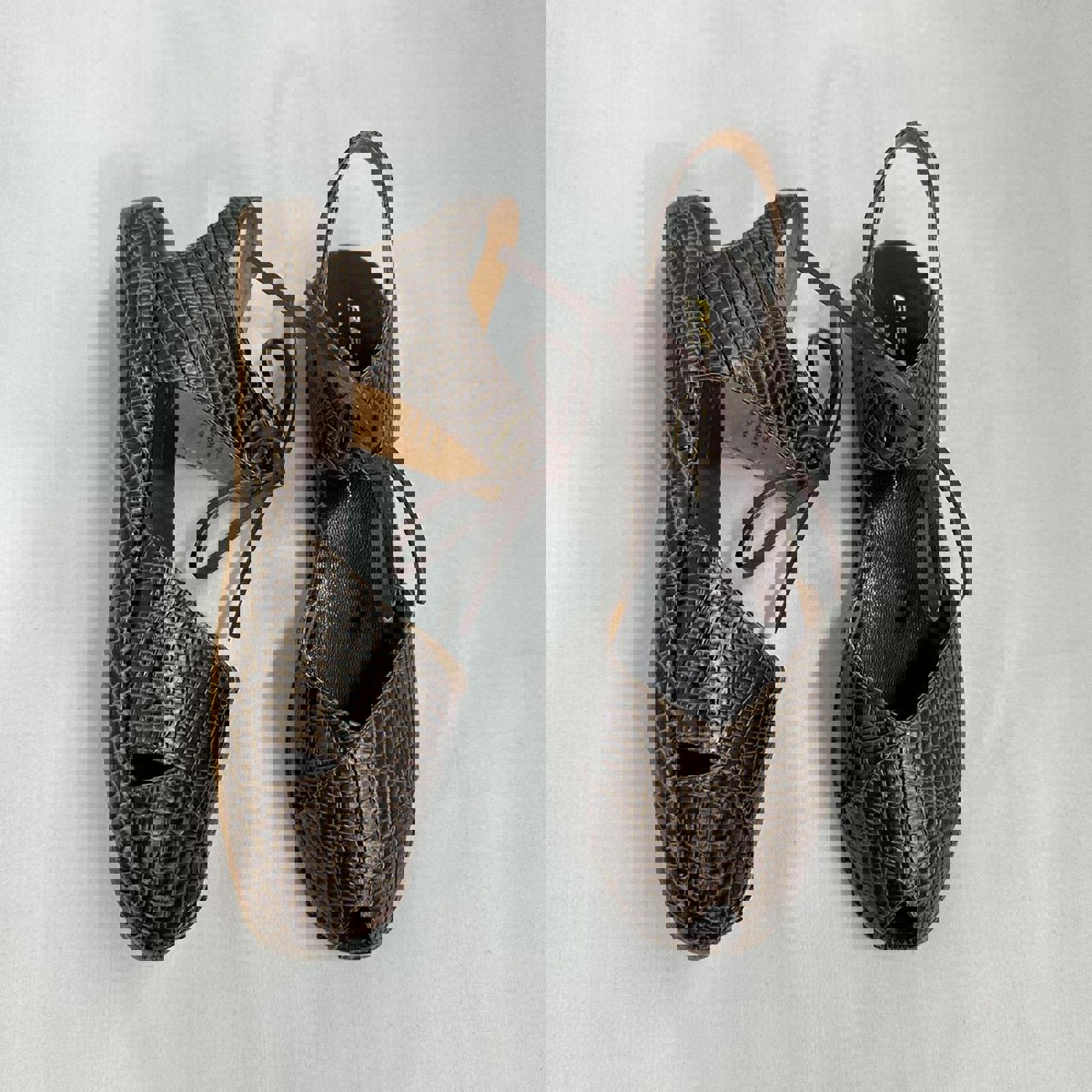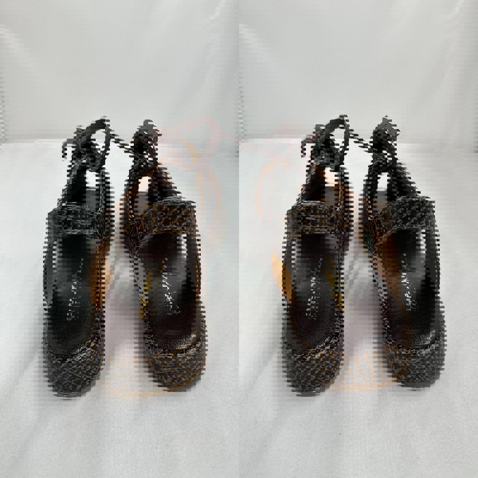 Brown peep toe sandals with a textured leather pattern and lace-up detail.