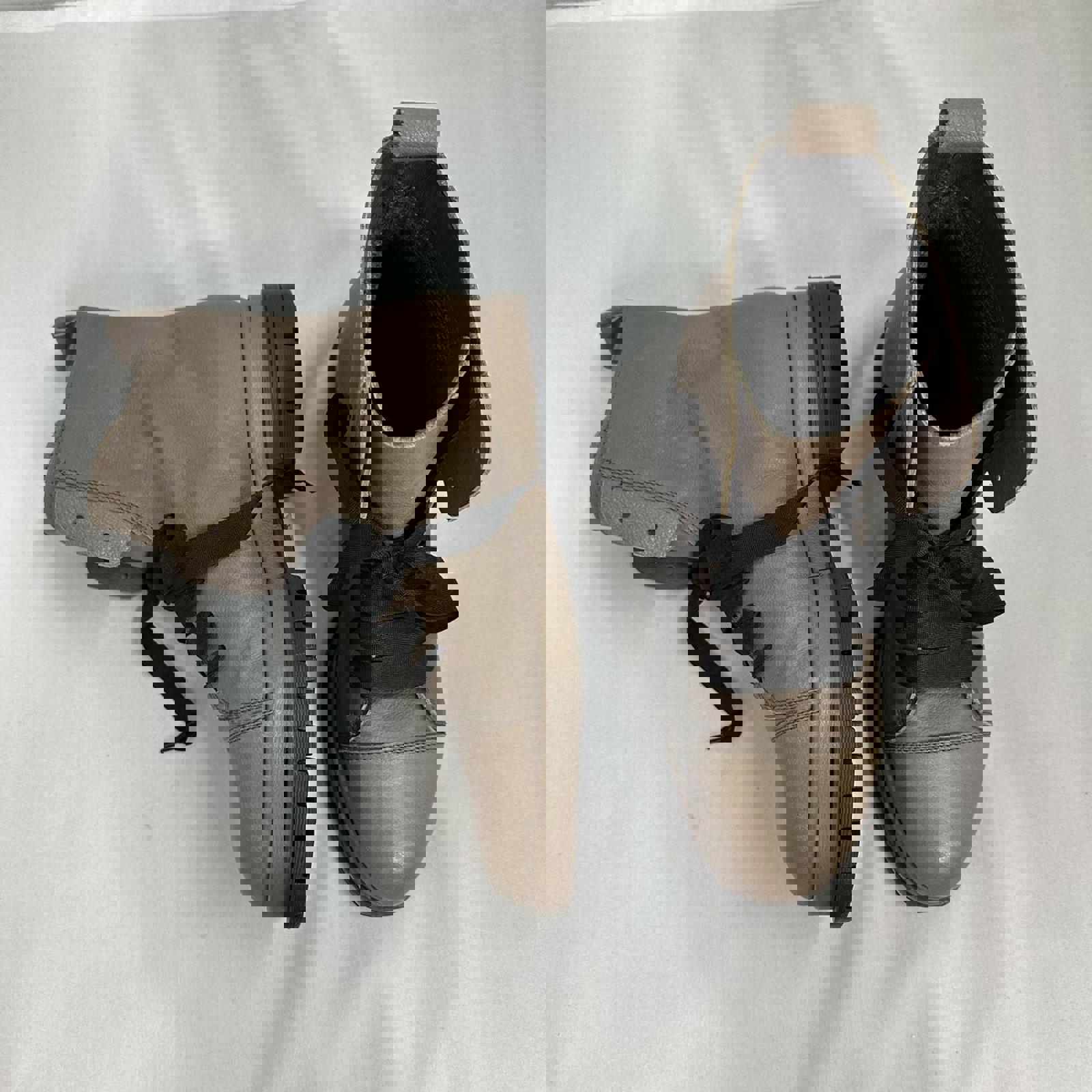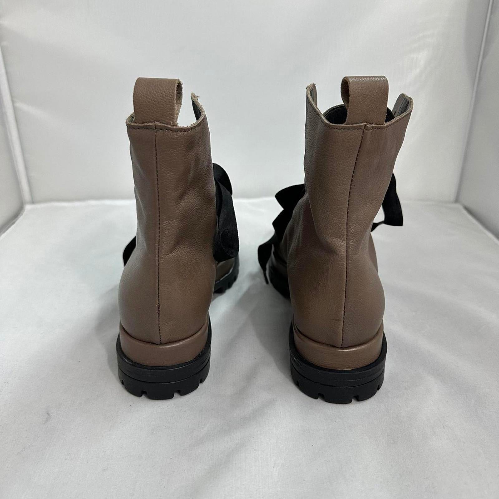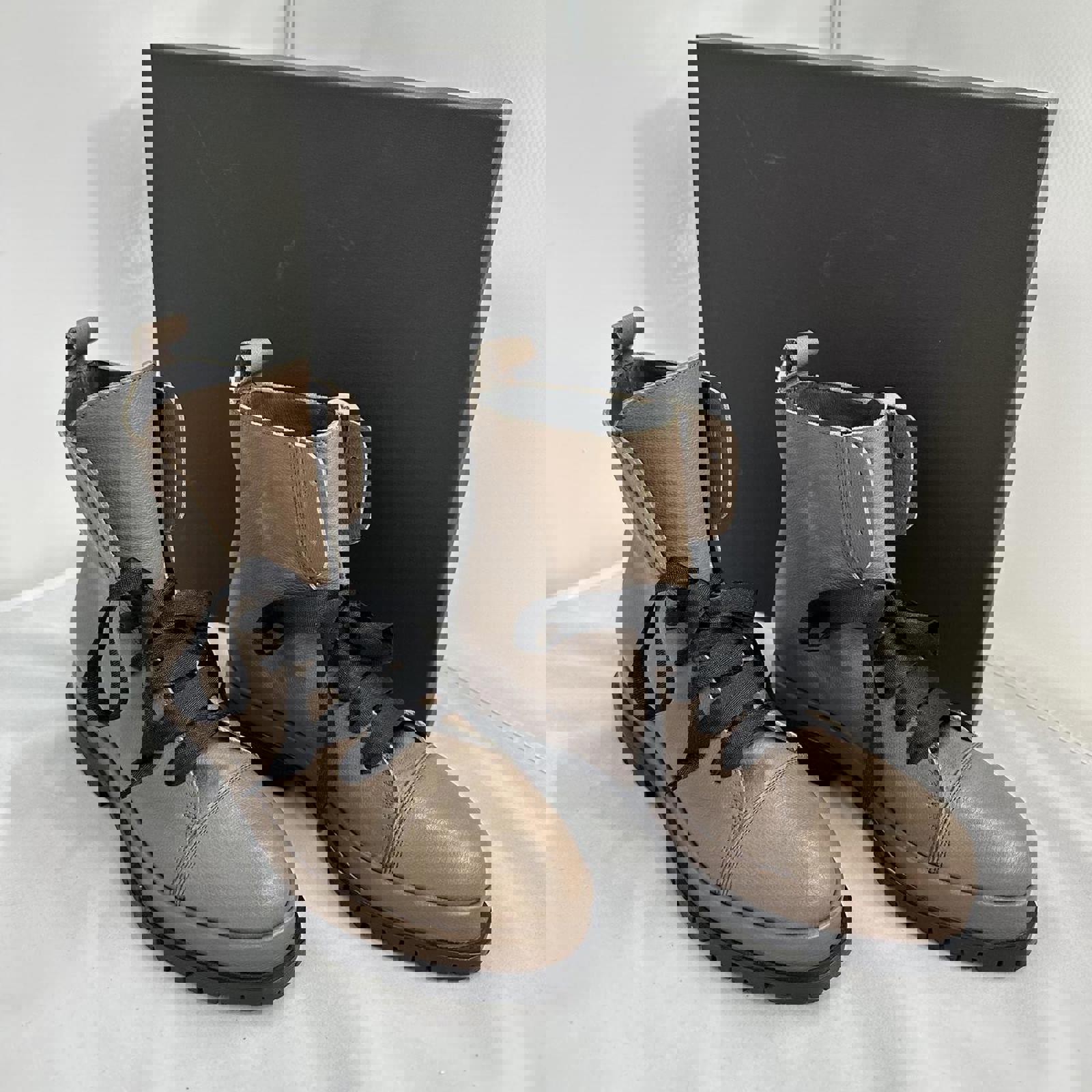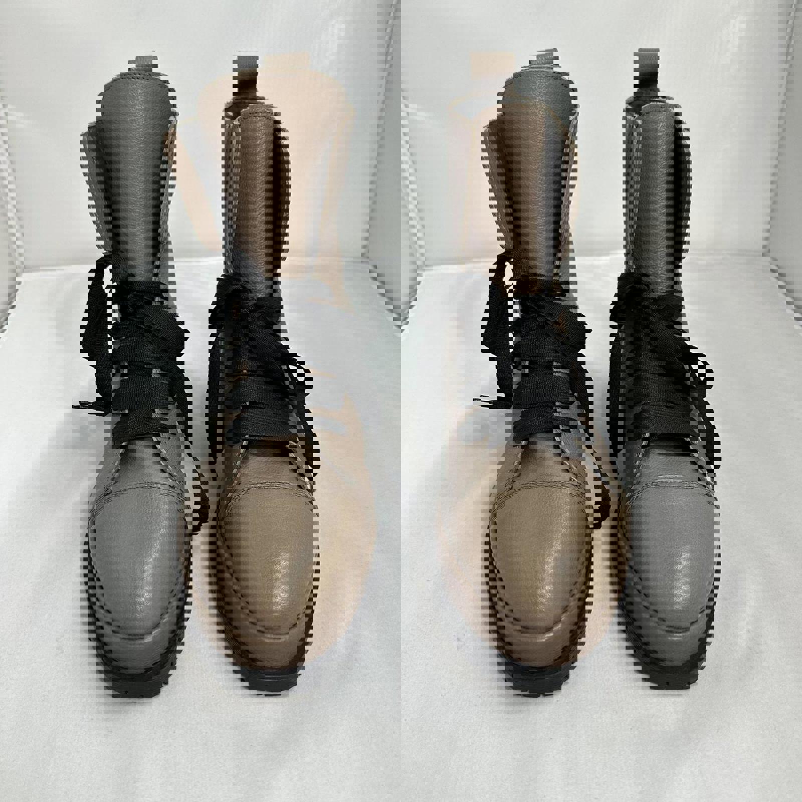 Taupe leather combat boots featuring black laces and a sturdy lug sole for a rugged look.