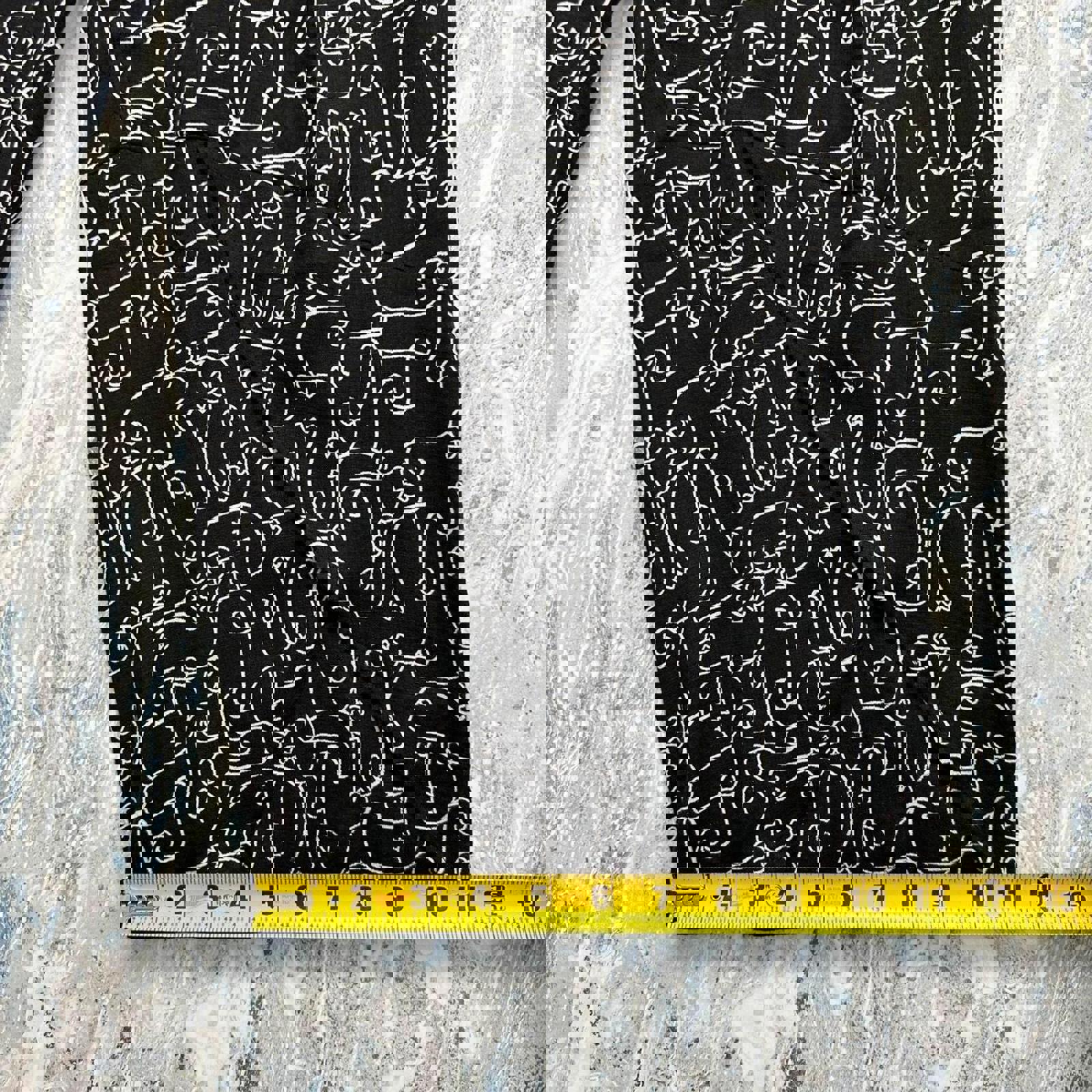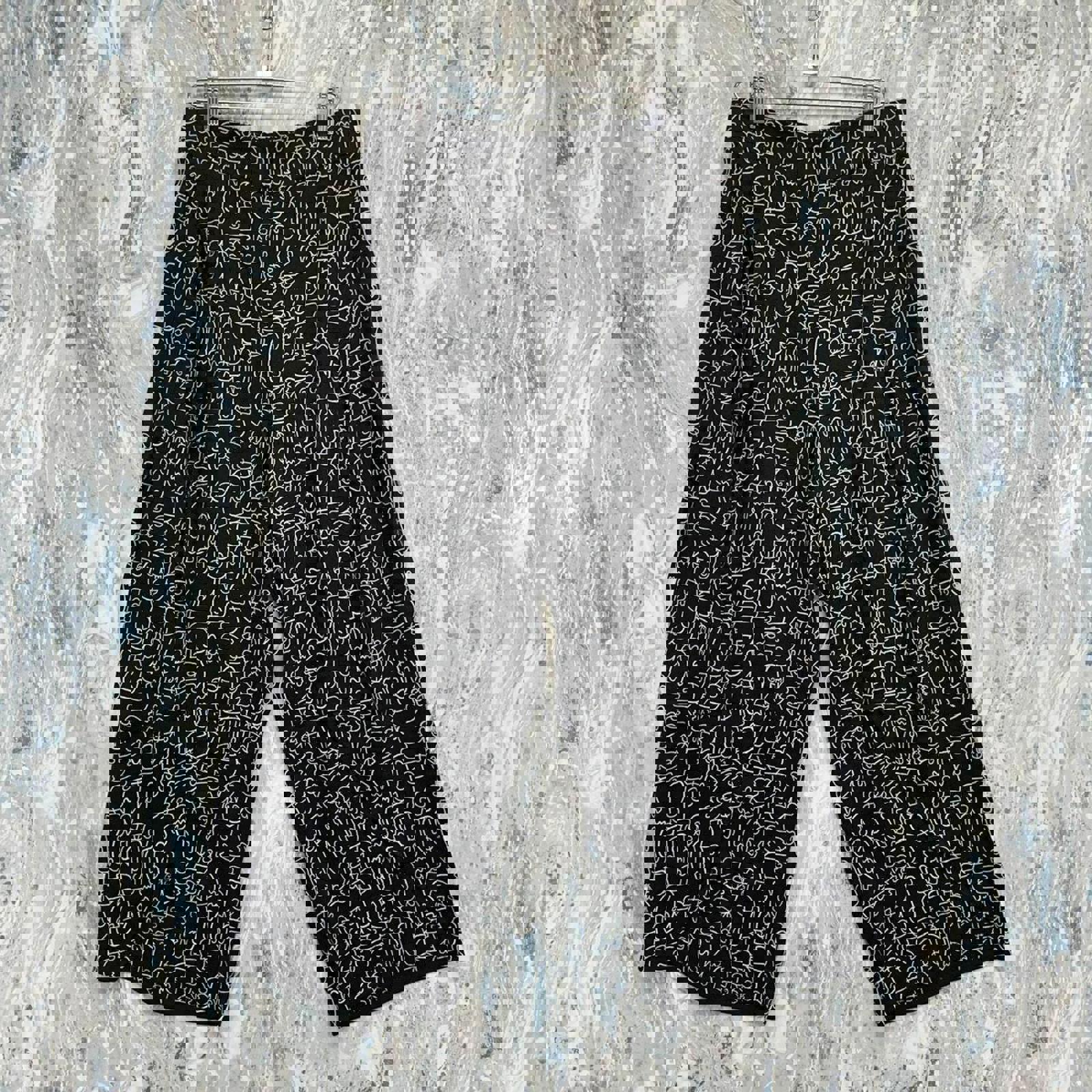 Black wide-leg pants with a bold abstract line art pattern in white. #vintage #pants #avantgarde #indie #boho