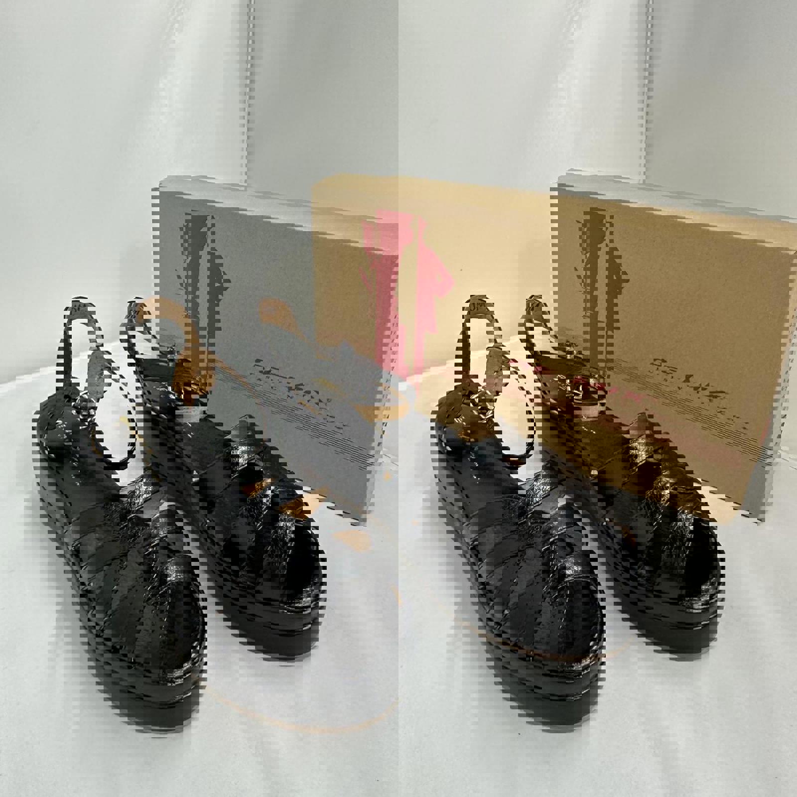 Black patent strappy platform sandals with adjustable buckle and open toe design.