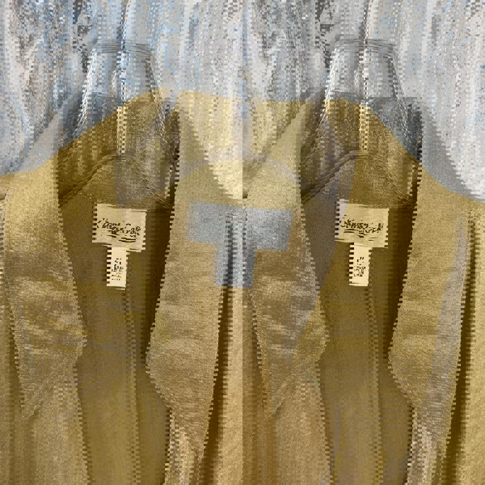 Coldwater Creek women's blouse in a metallic gold fabric. Features a wrap front with a tie detail at the waist and a classic collar. Three-quarter length sleeves with wide cuffs. Size PL (Plus Large).