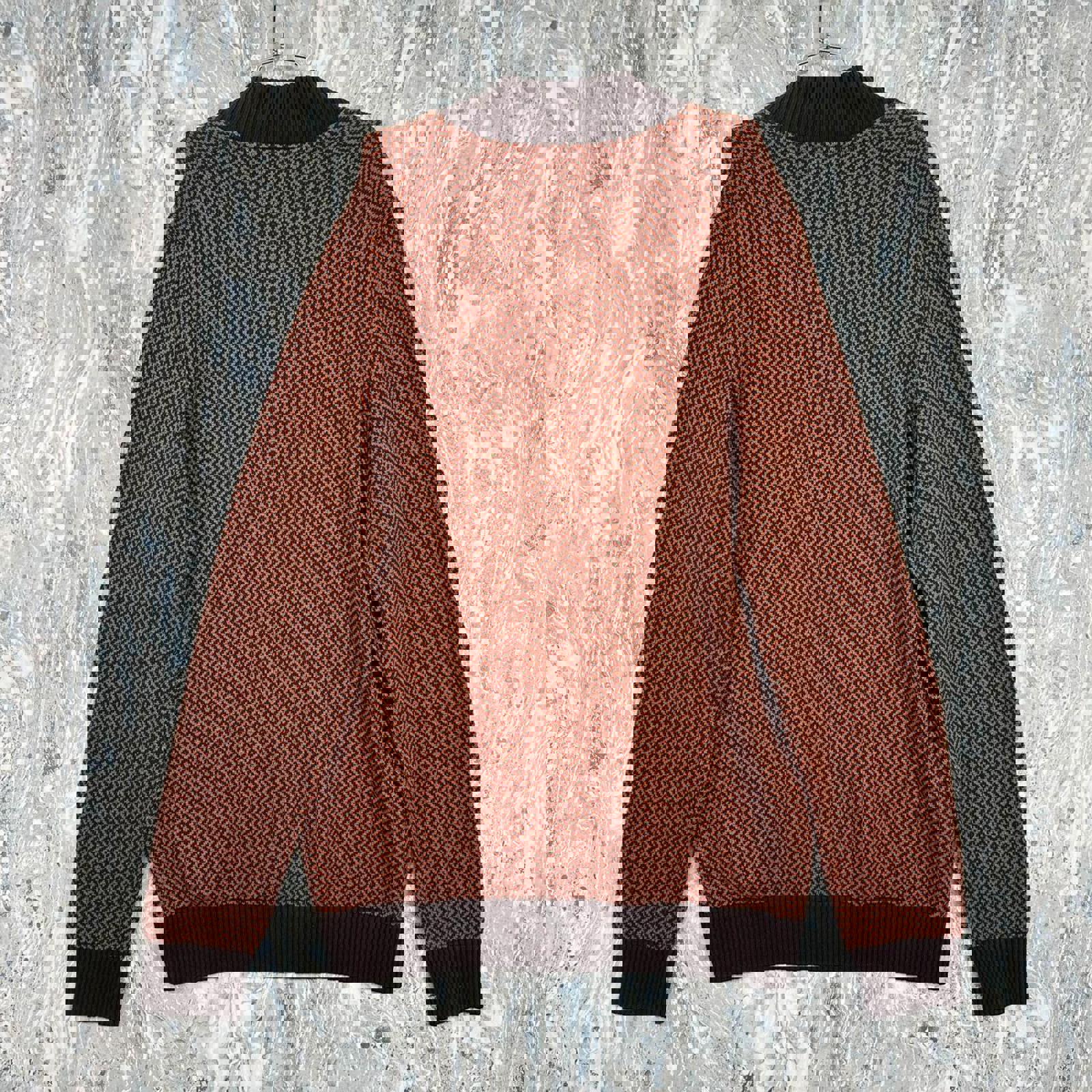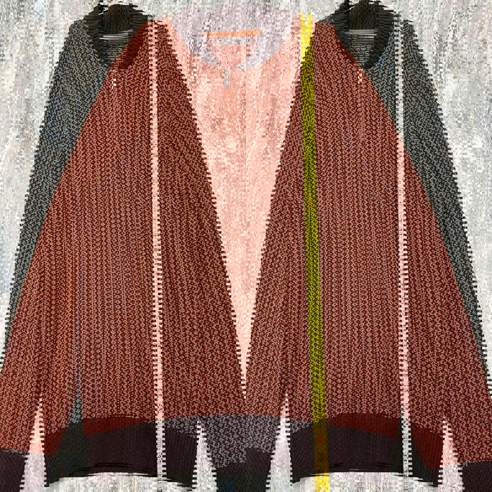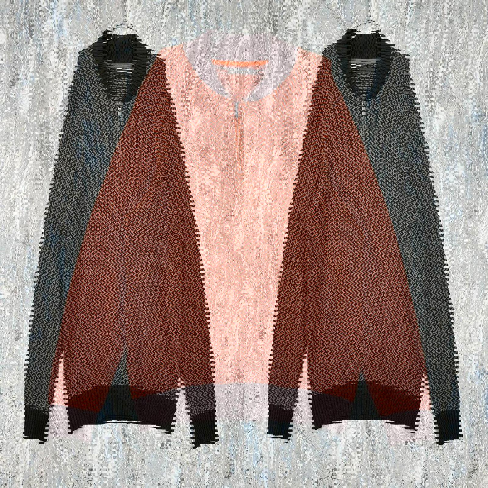 Men's sweater in size 3XL featuring a distinctive orange chevron pattern with dark brown ribbed collar, cuffs, and hem.