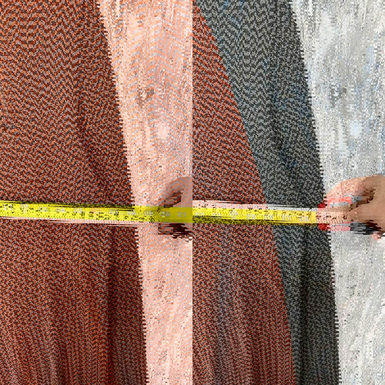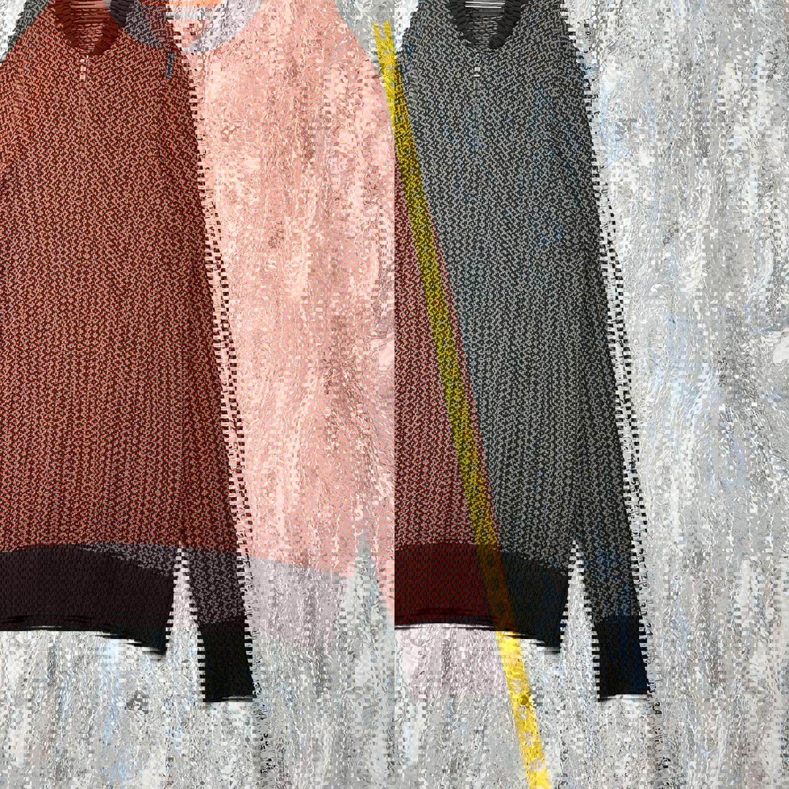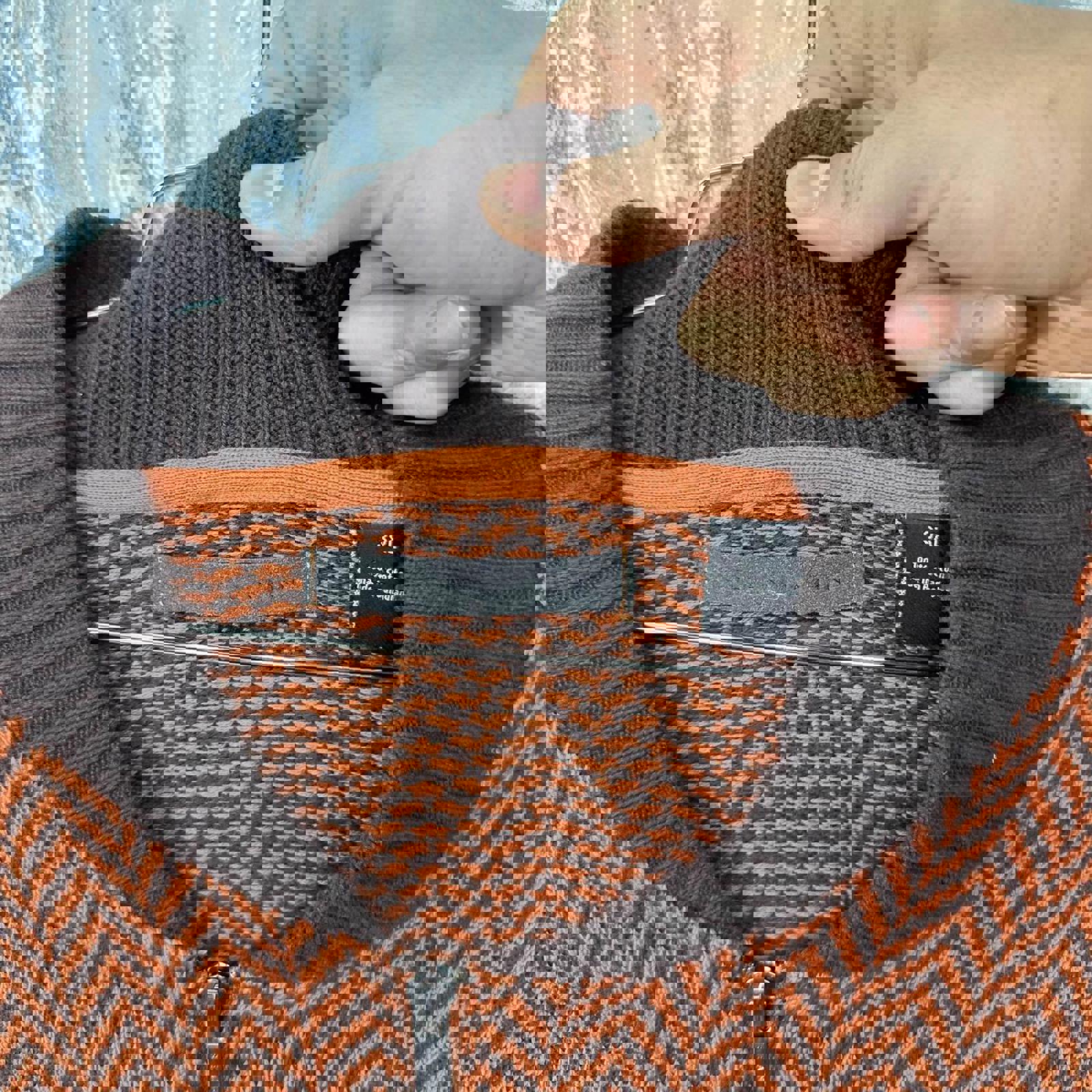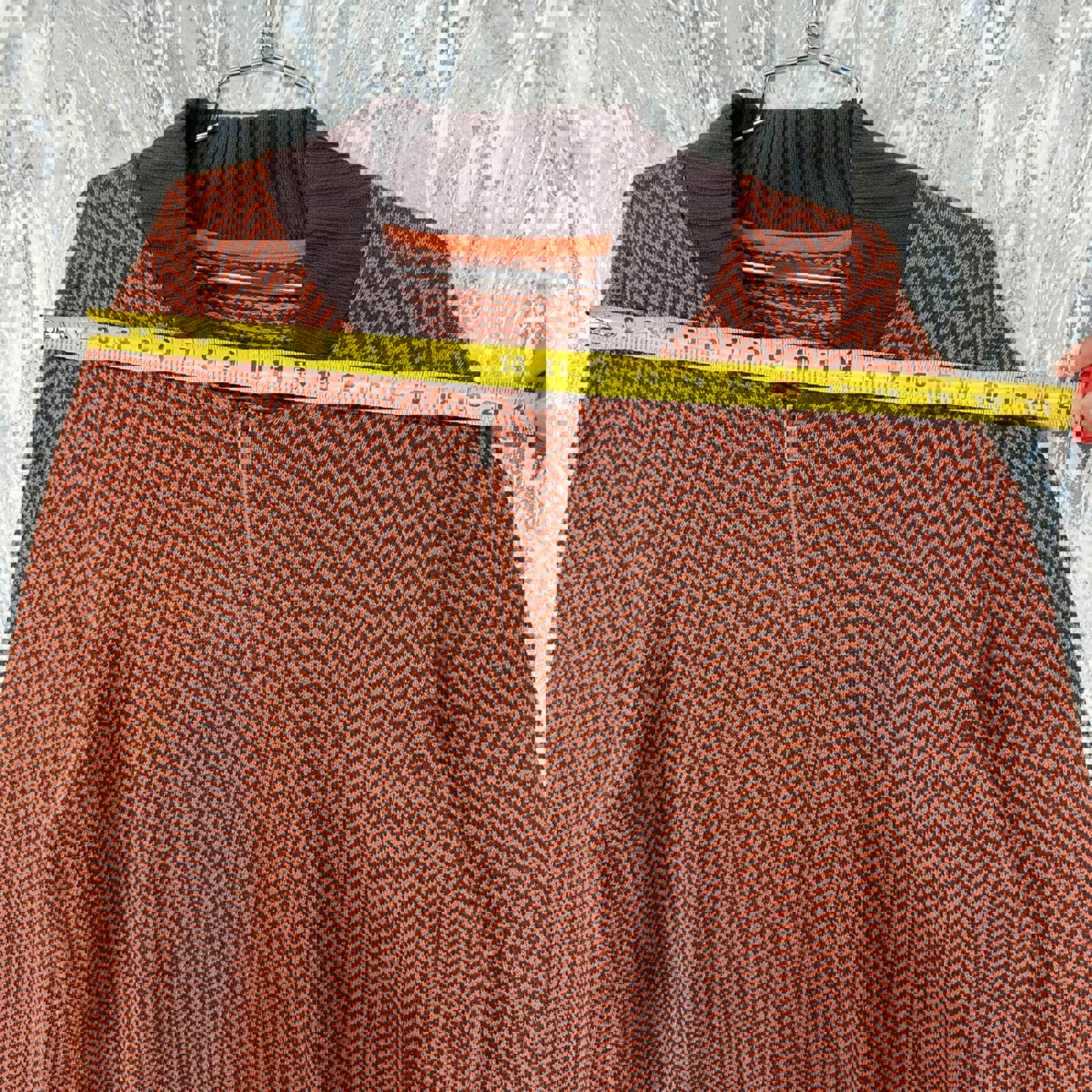 Men's sweater in size 3XL featuring a distinctive orange chevron pattern with dark brown ribbed collar, cuffs, and hem.