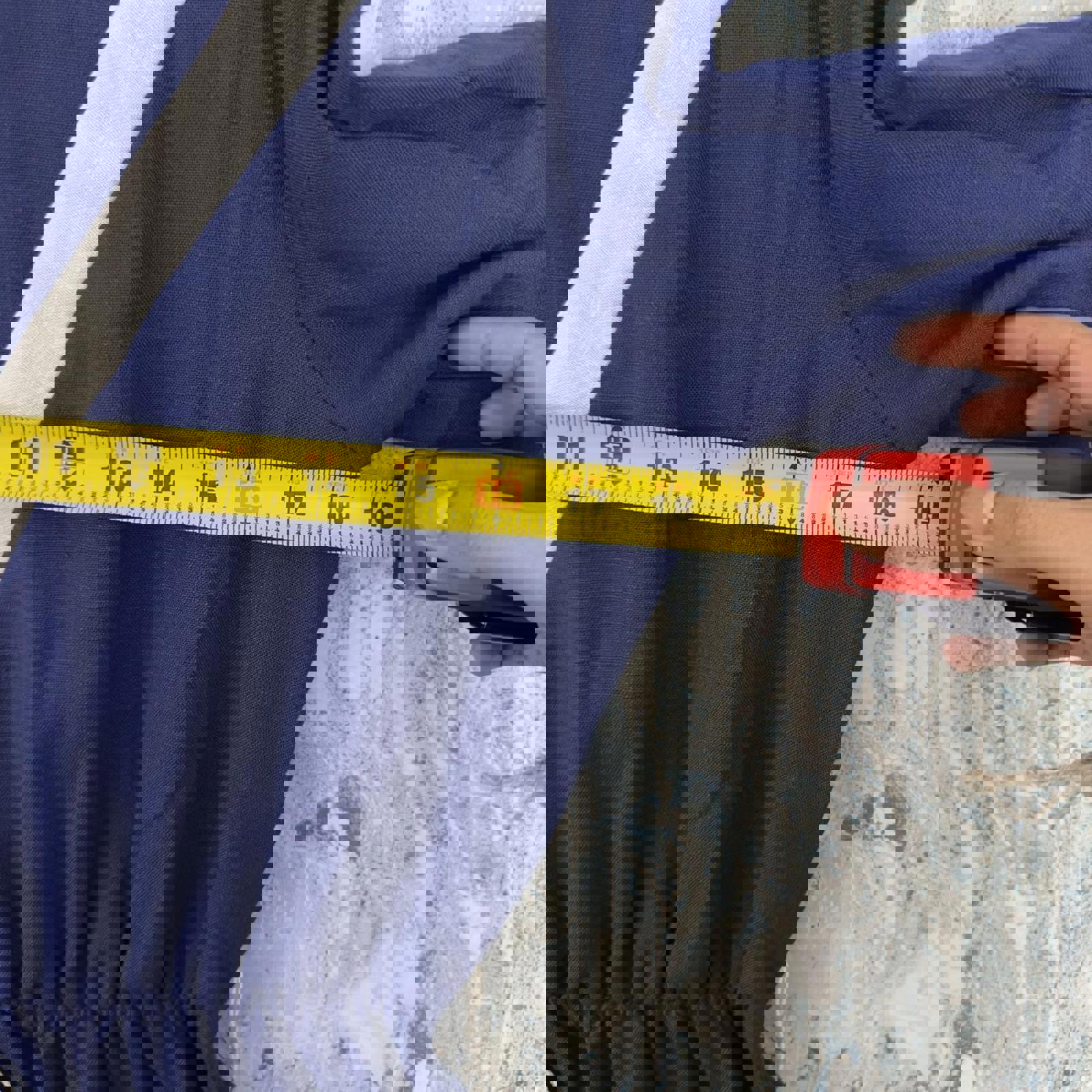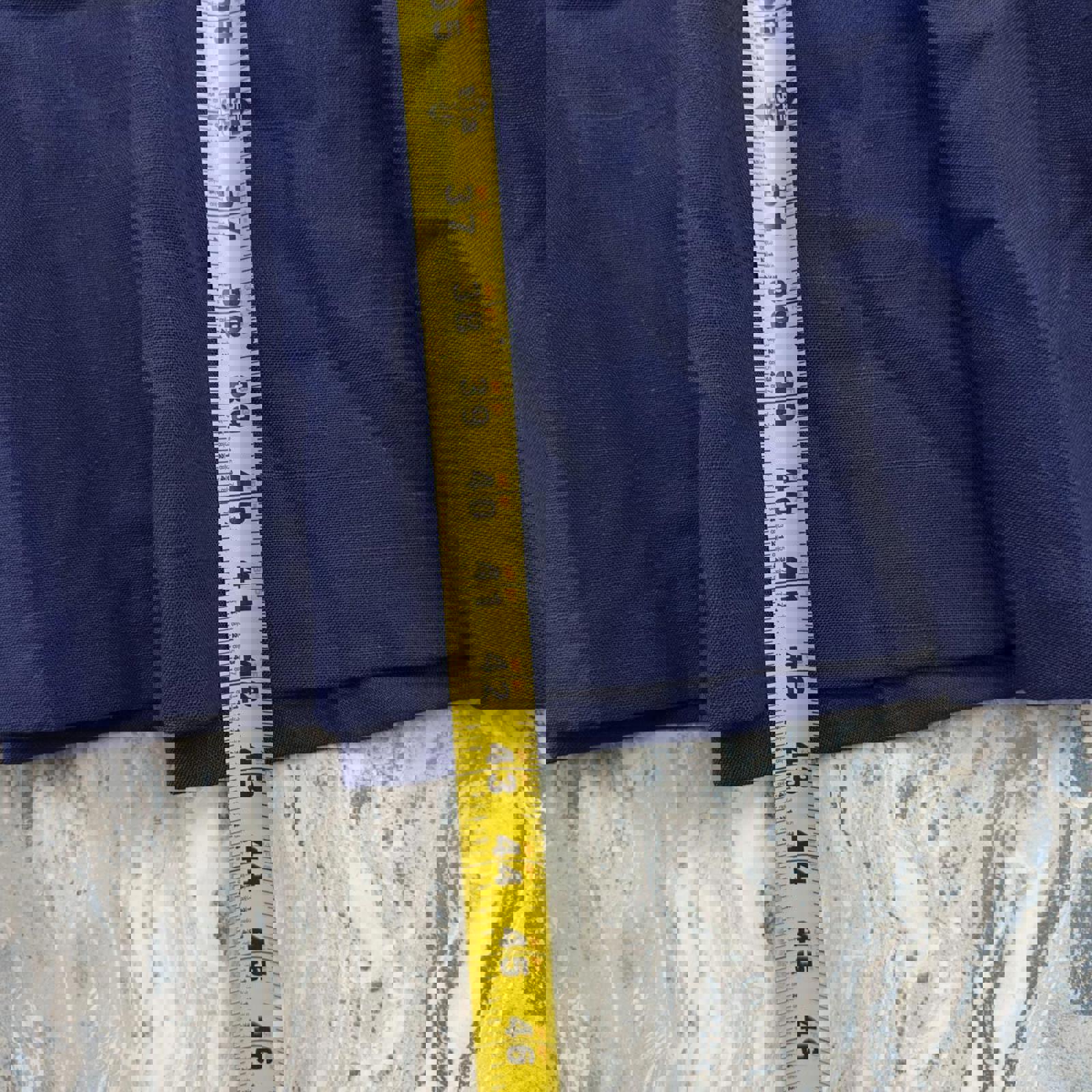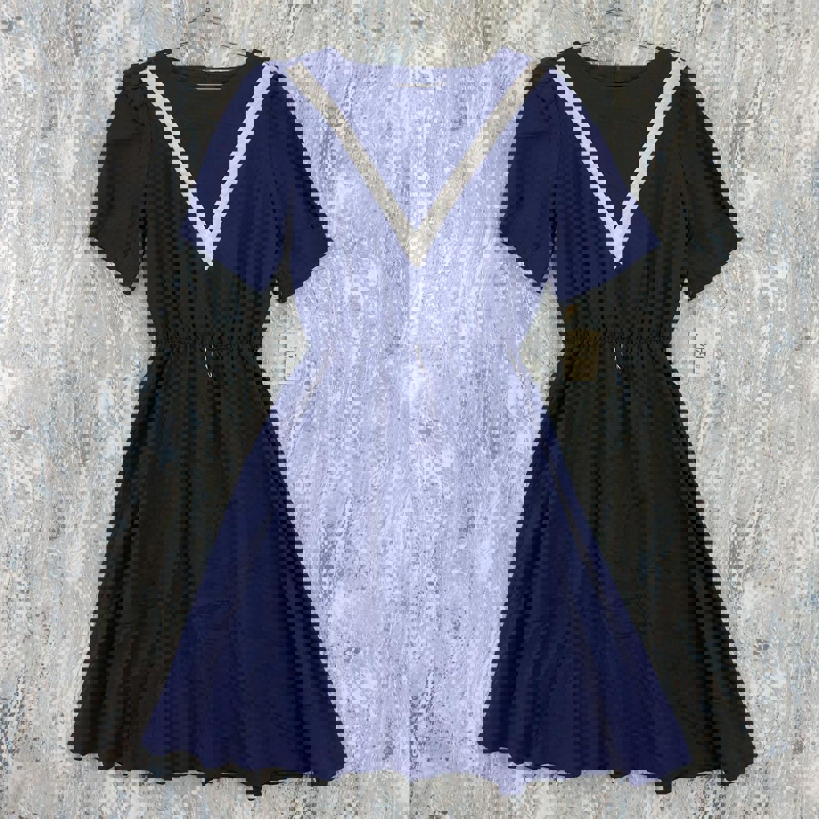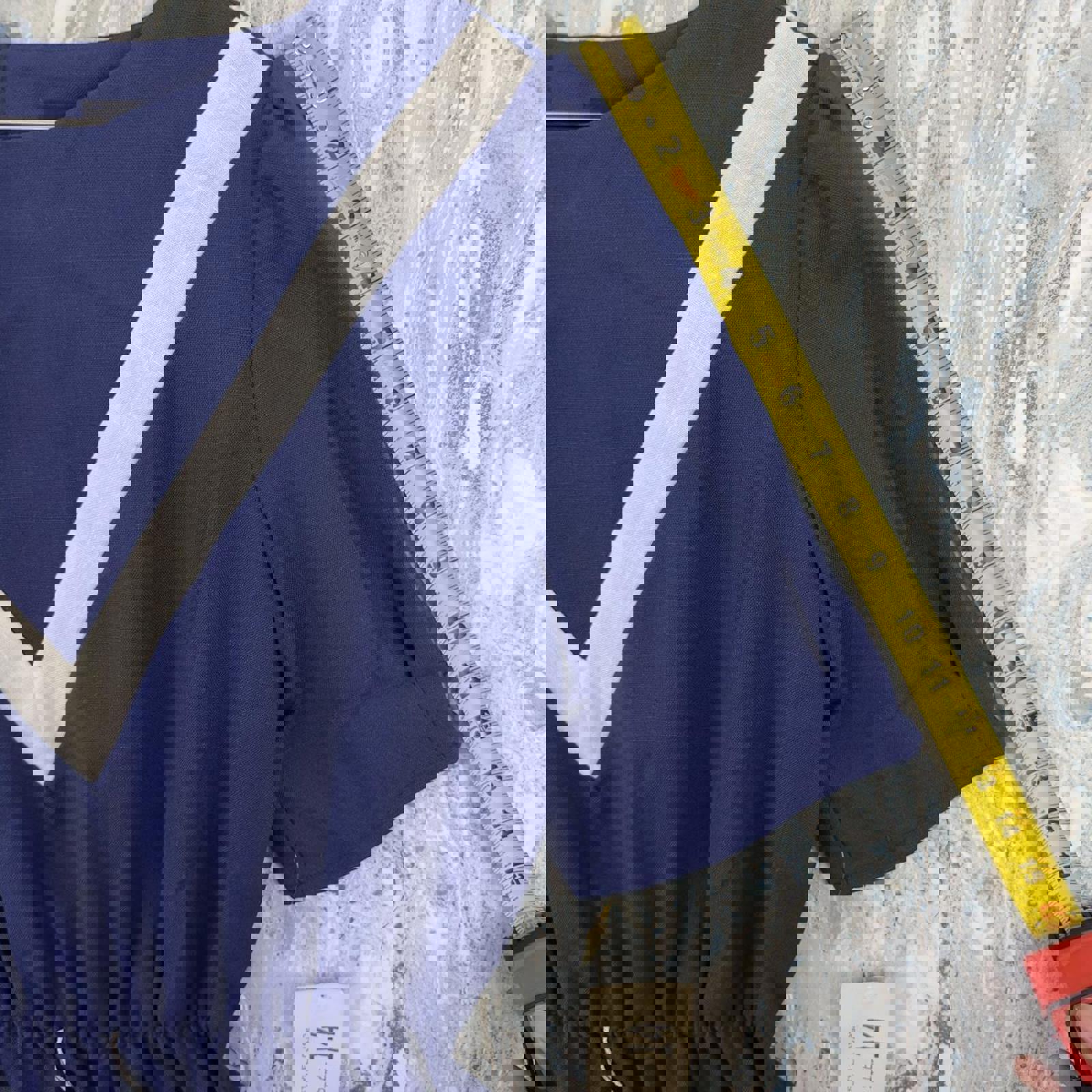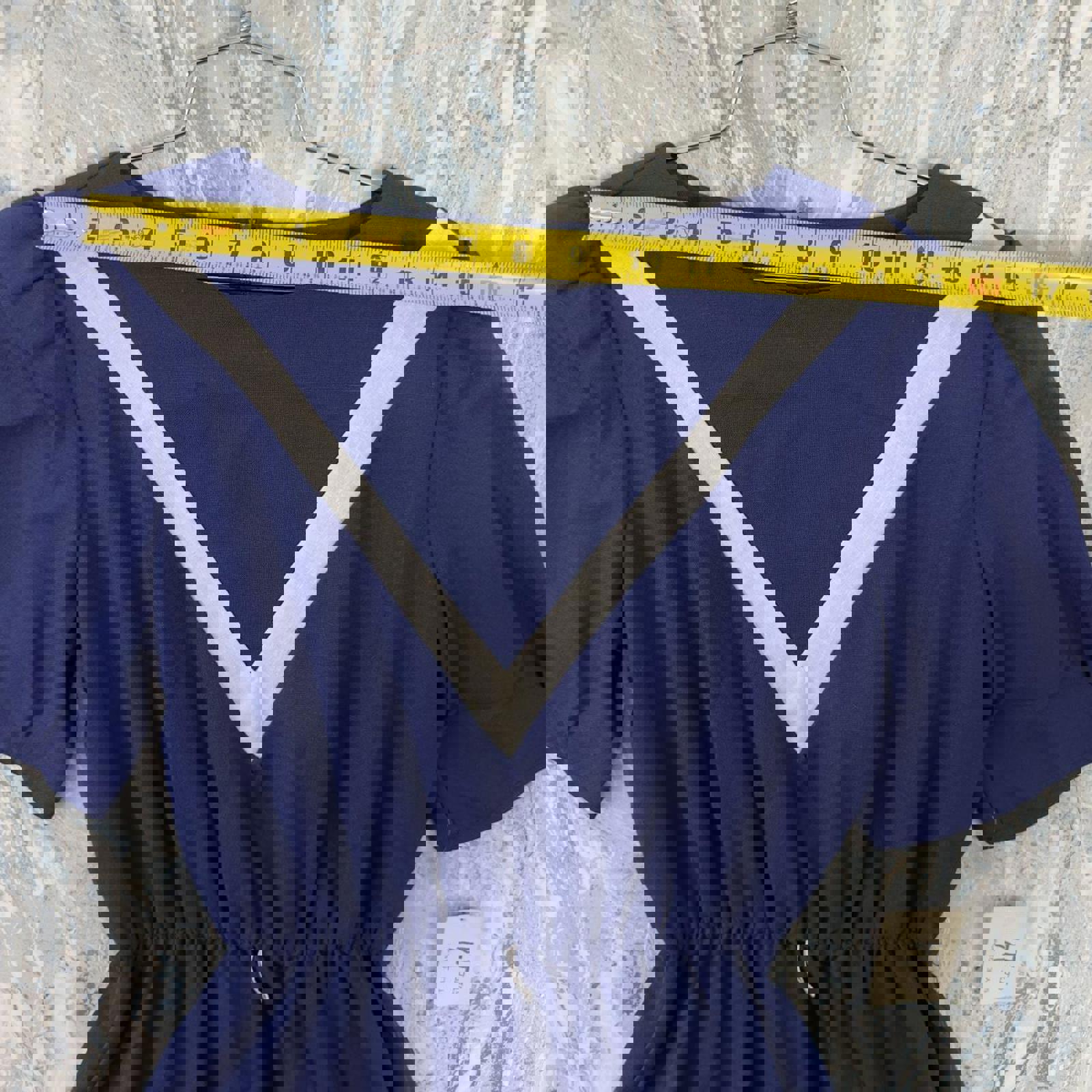 Elegant navy dress with a V-neckline and elastic waist detail.