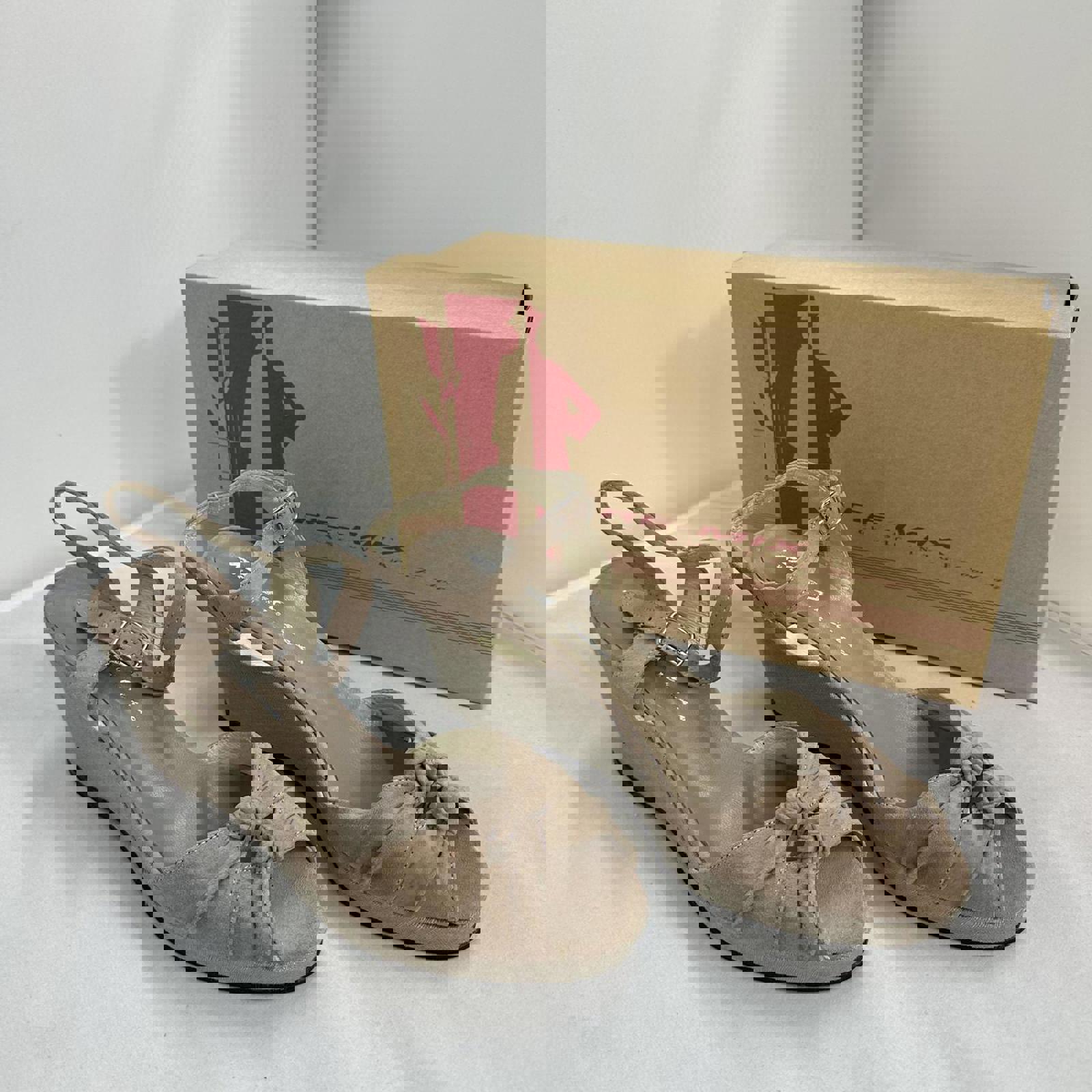 Charming beige suede sandals featuring a peep-toe design with knotted detailing and adjustable ankle strap.