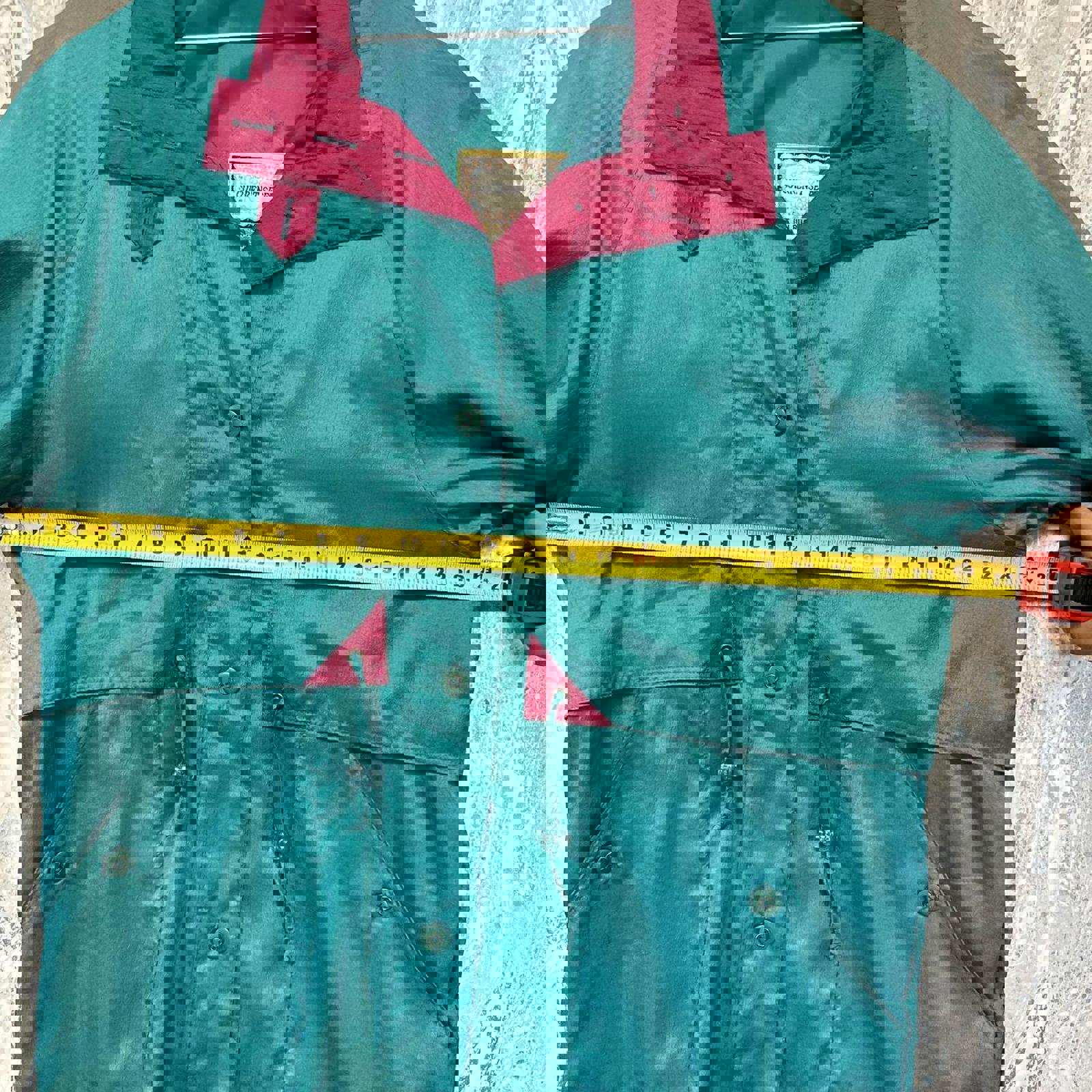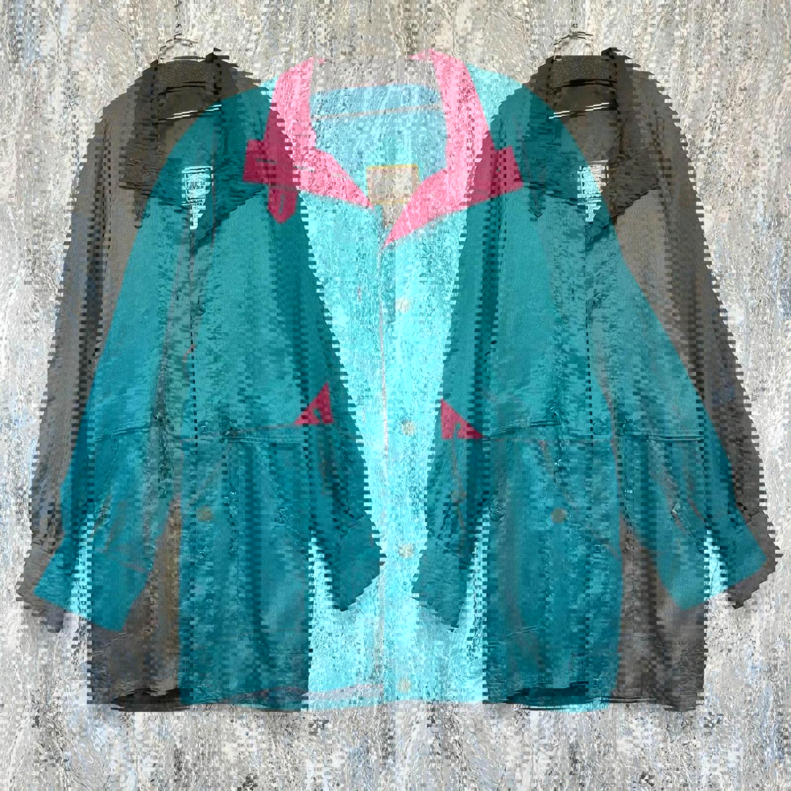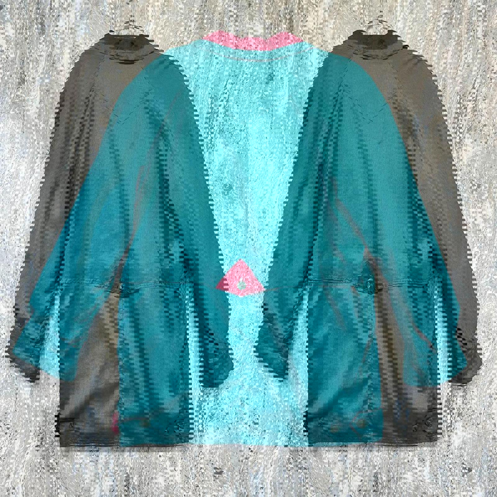 Vintage teal windbreaker with contrasting burgundy accents, snap buttons, and drawstring details.
