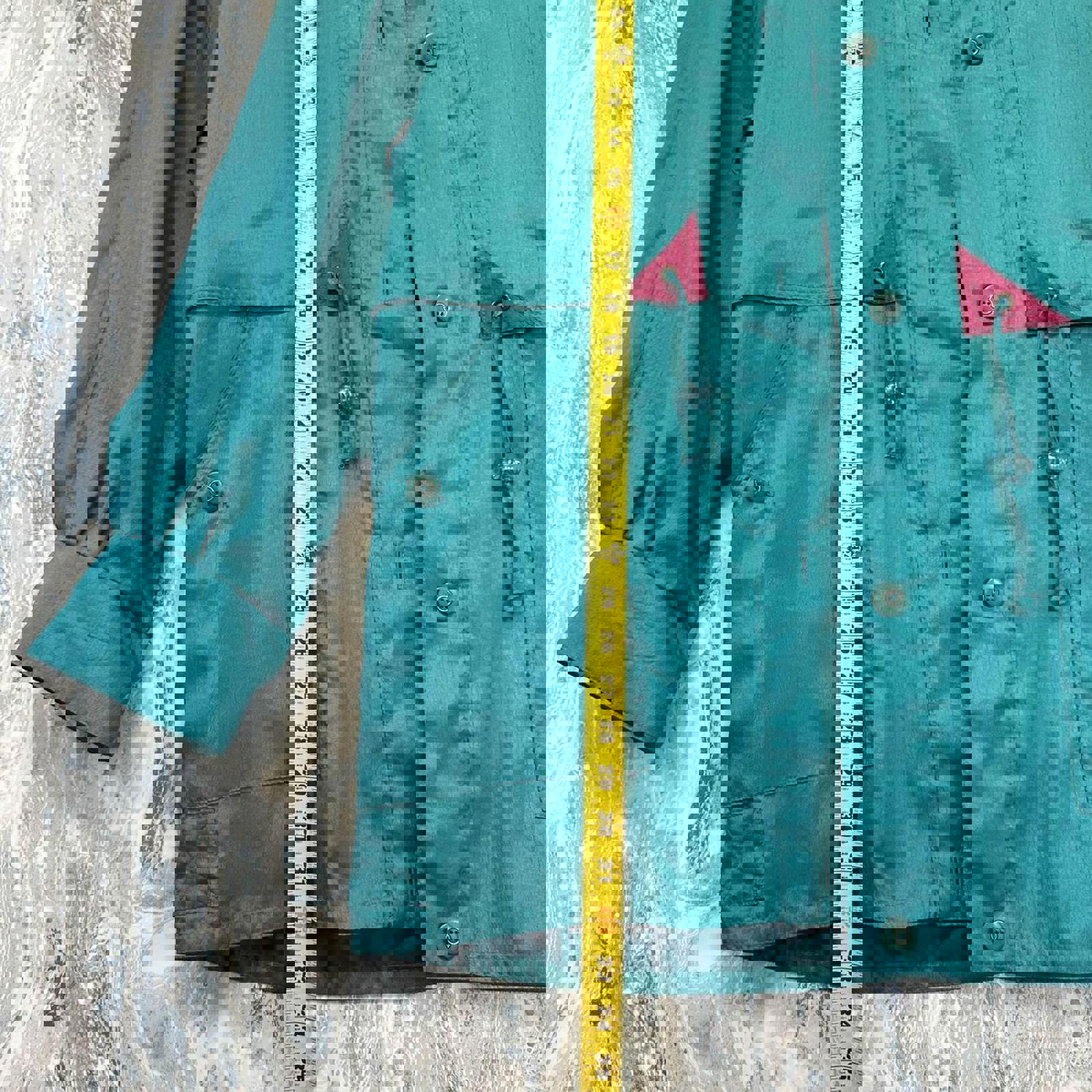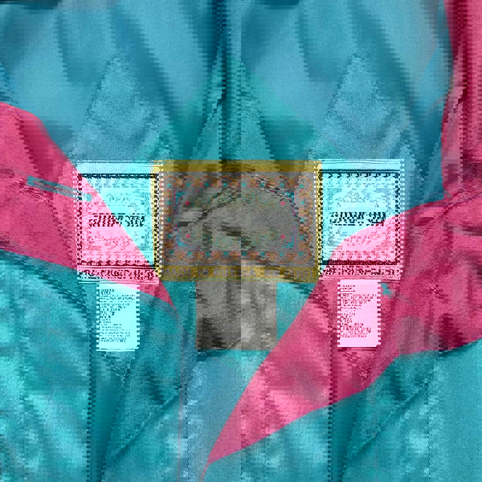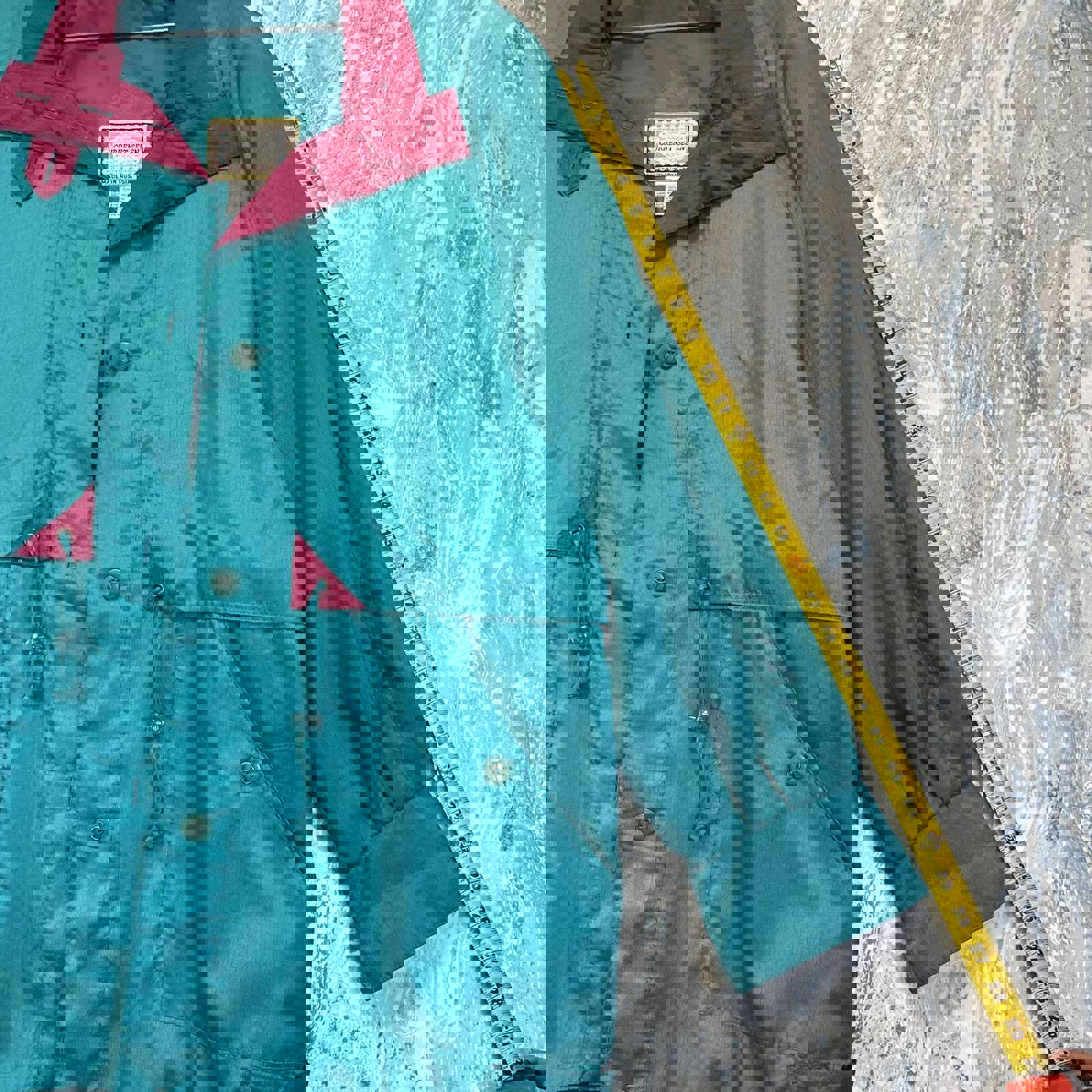 Vintage teal windbreaker with contrasting burgundy accents, snap buttons, and drawstring details.