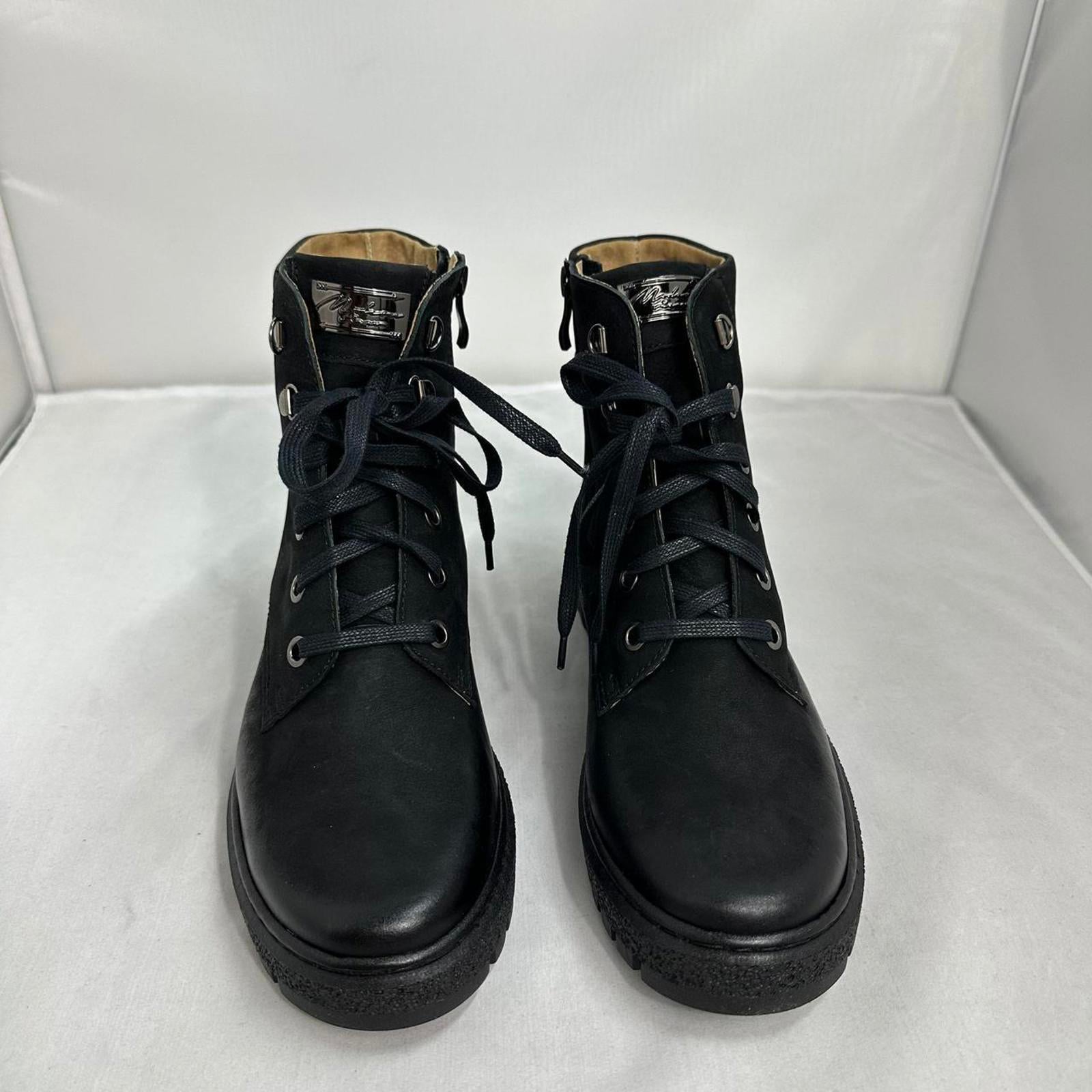 Sturdy black combat boots featuring lace-up front design and rugged soles for durability.