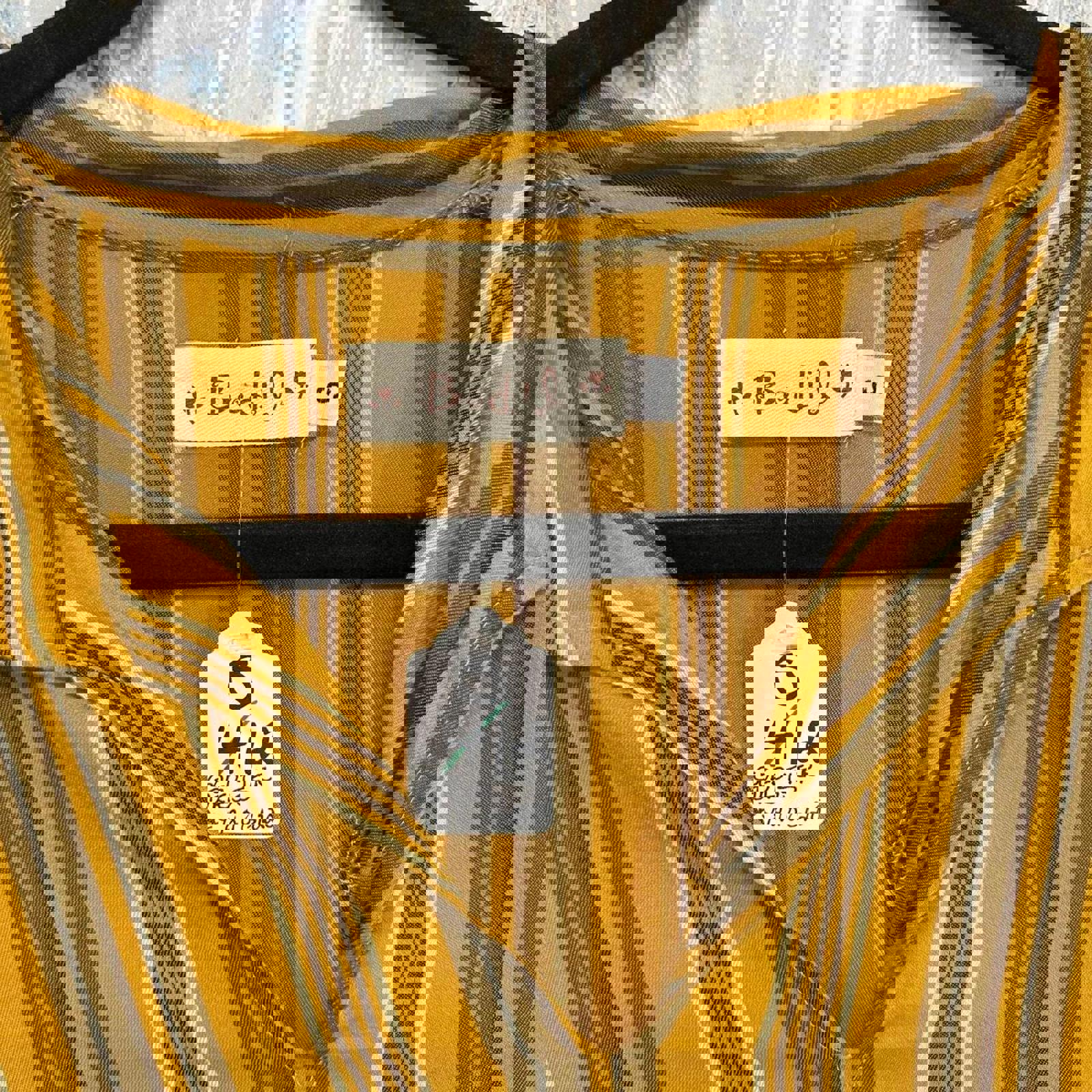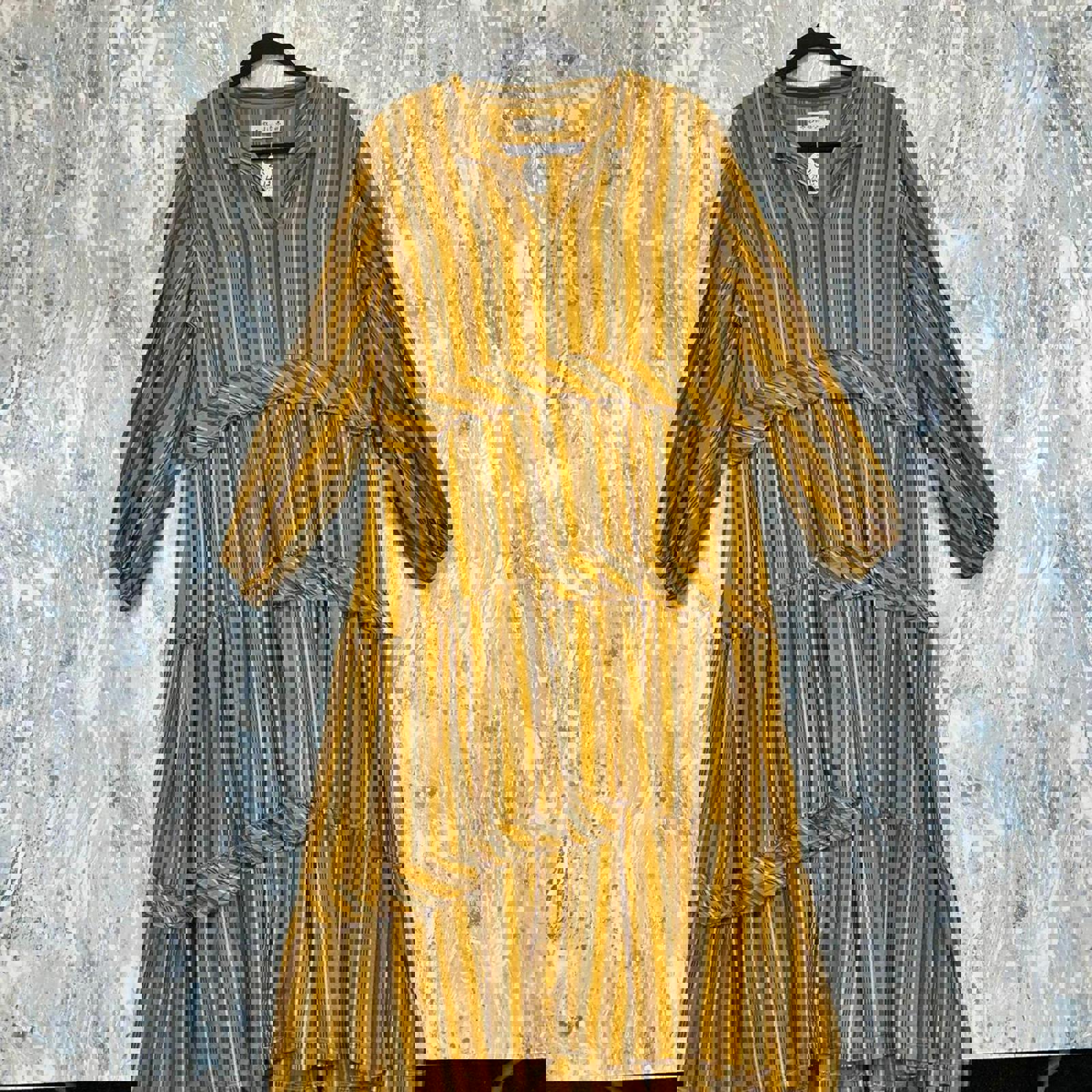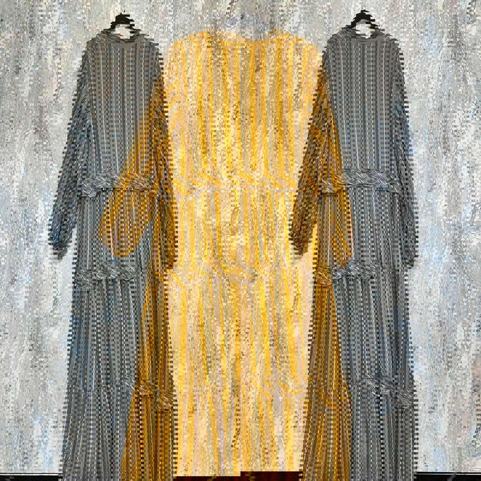 This dress features a tiered design with long sleeves and alternating vertical stripes. #dress #bohemian #boho #retro #cottage